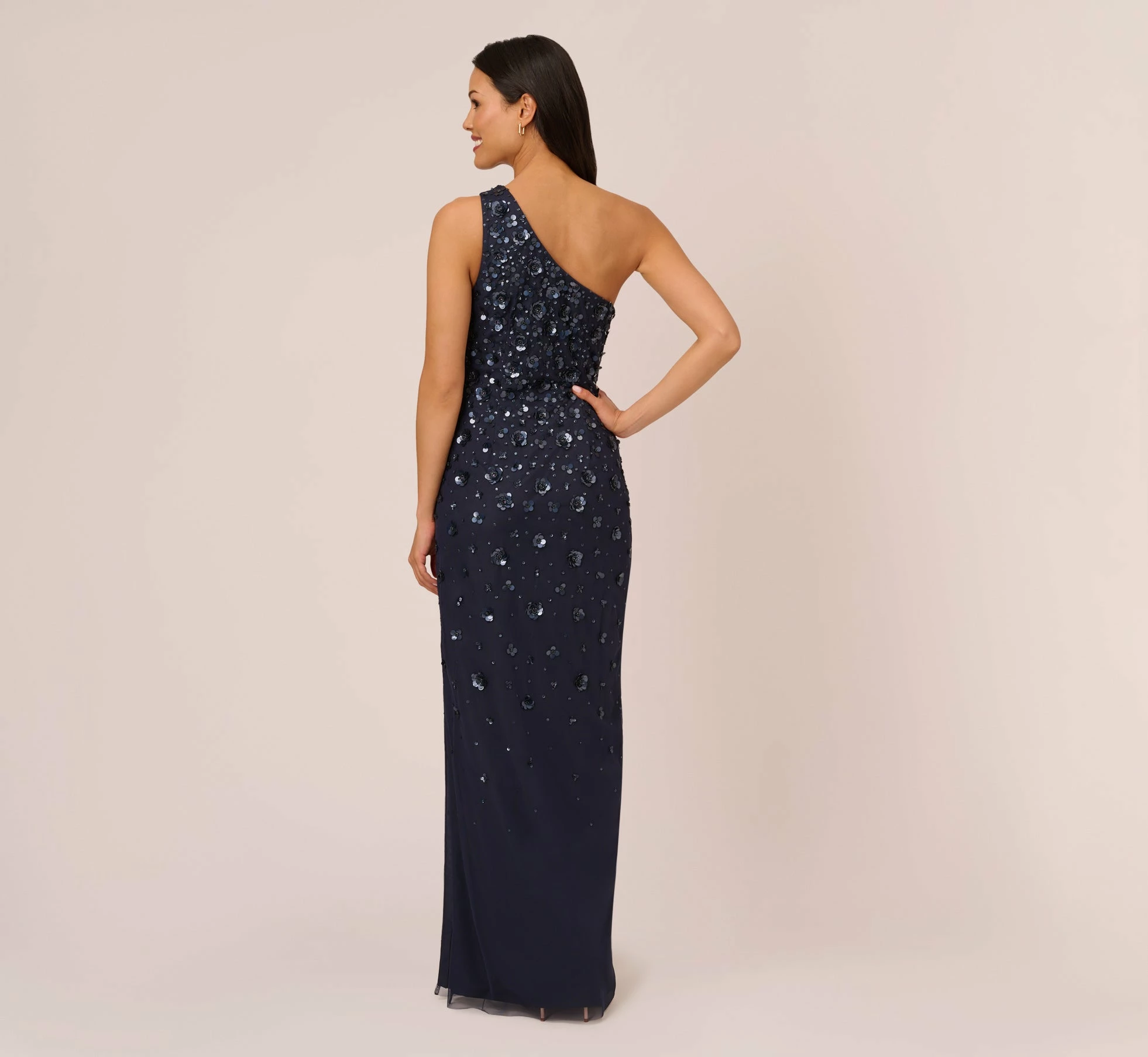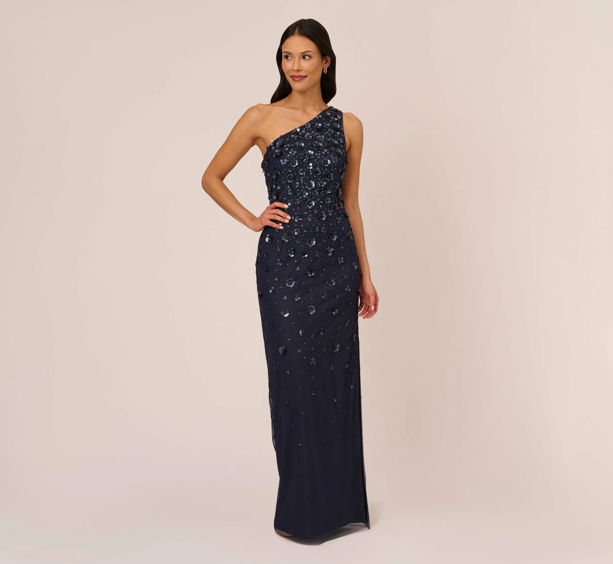 Shimmering and striking, you’ll make a stylish statement at all your special events in our floor-sweeping column gown that hugs your curves in all the right places. We’re obsessed with the one-shoulder silhouette and the dazzling display of handsewn 3D floral beadwork that dances allover a layer of luxe mesh. Sleek side zip closure.