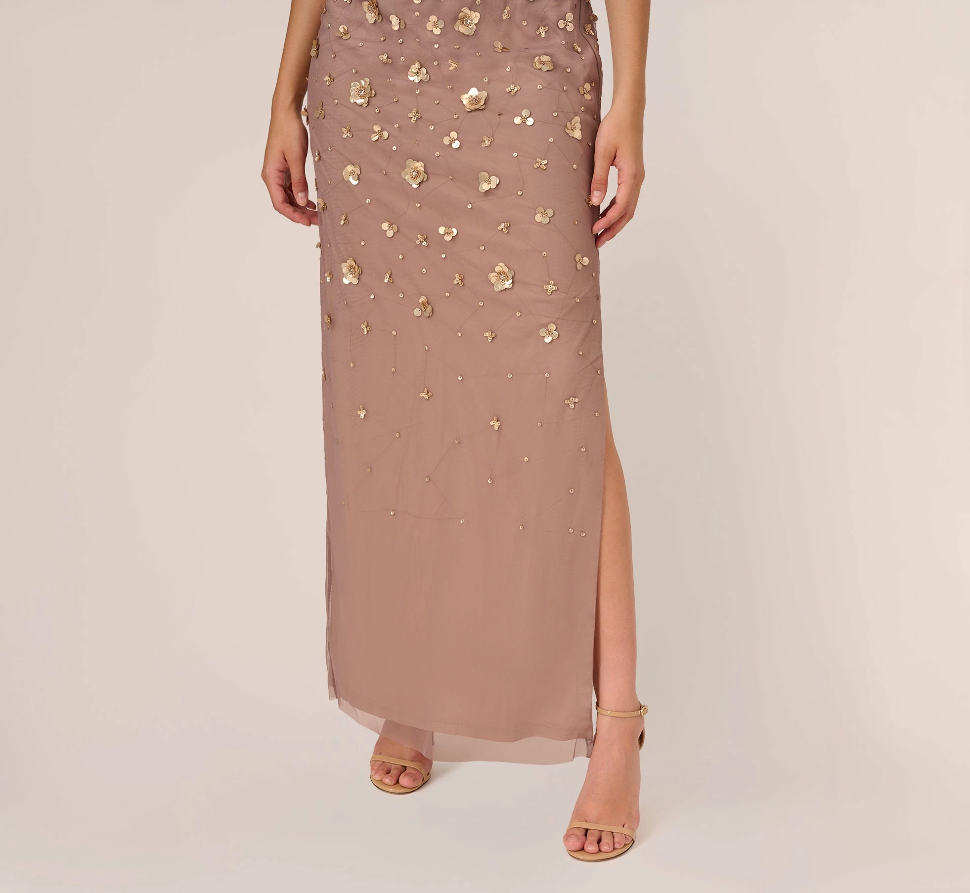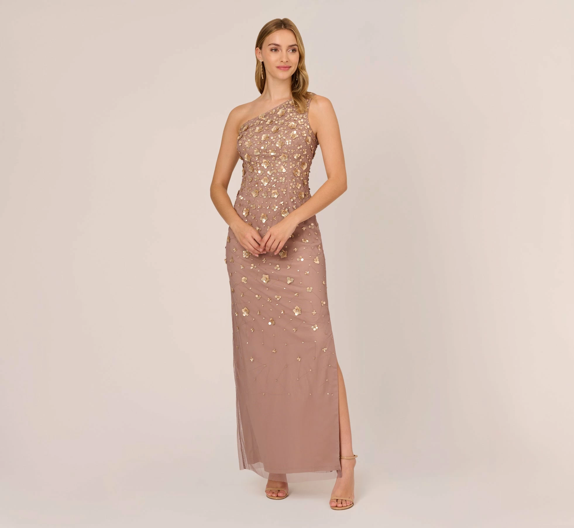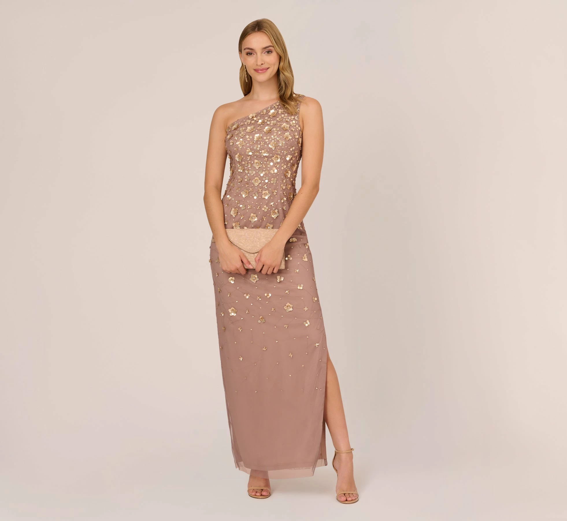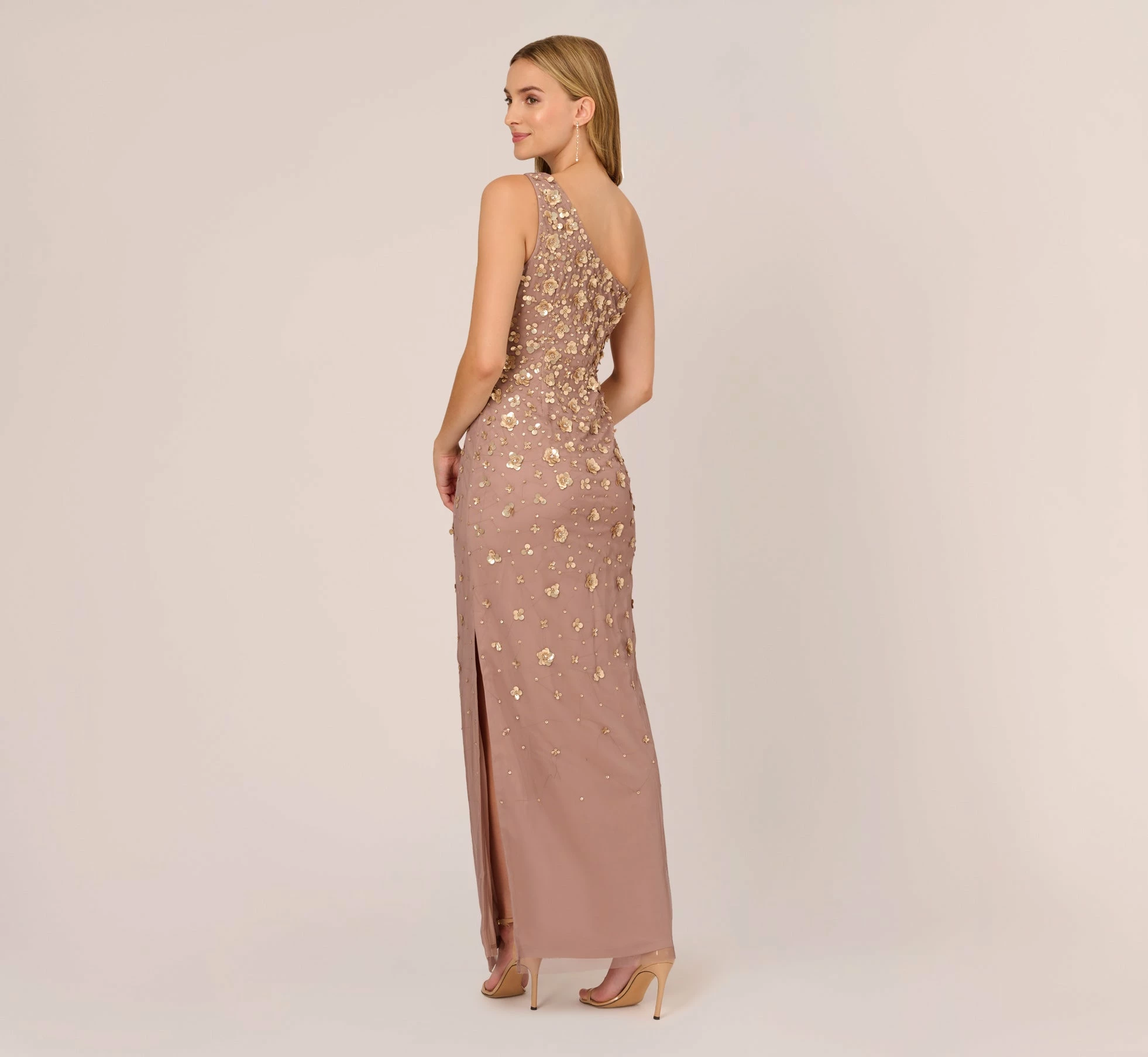 Shimmering and striking, you’ll make a stylish statement at all your special events in our floor-sweeping column gown that hugs your curves in all the right places. We’re obsessed with the one-shoulder silhouette and the dazzling display of handsewn 3D floral beadwork that dances allover a layer of luxe mesh. Sleek side zip closure.