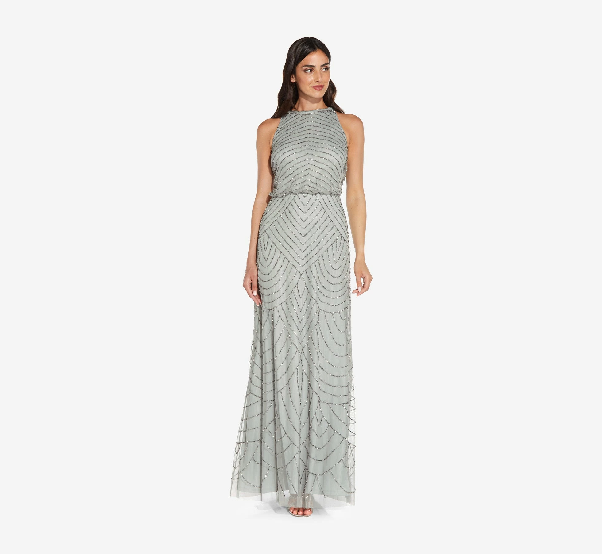 Create a high impact look at your next formal event when you choose this beautiful, beaded evening dress. For that upcoming wedding or gala, this special occasion gown features a blouson bodice, sparkling scalloped beading, and a flowing straight skirt. The back features a zipper closure and keyhole detail. Pair this beautiful sleeveless evening dress with chandelier earrings and a sleek metallic clutch for a jaw-dropping look sure to turn heads all evening.