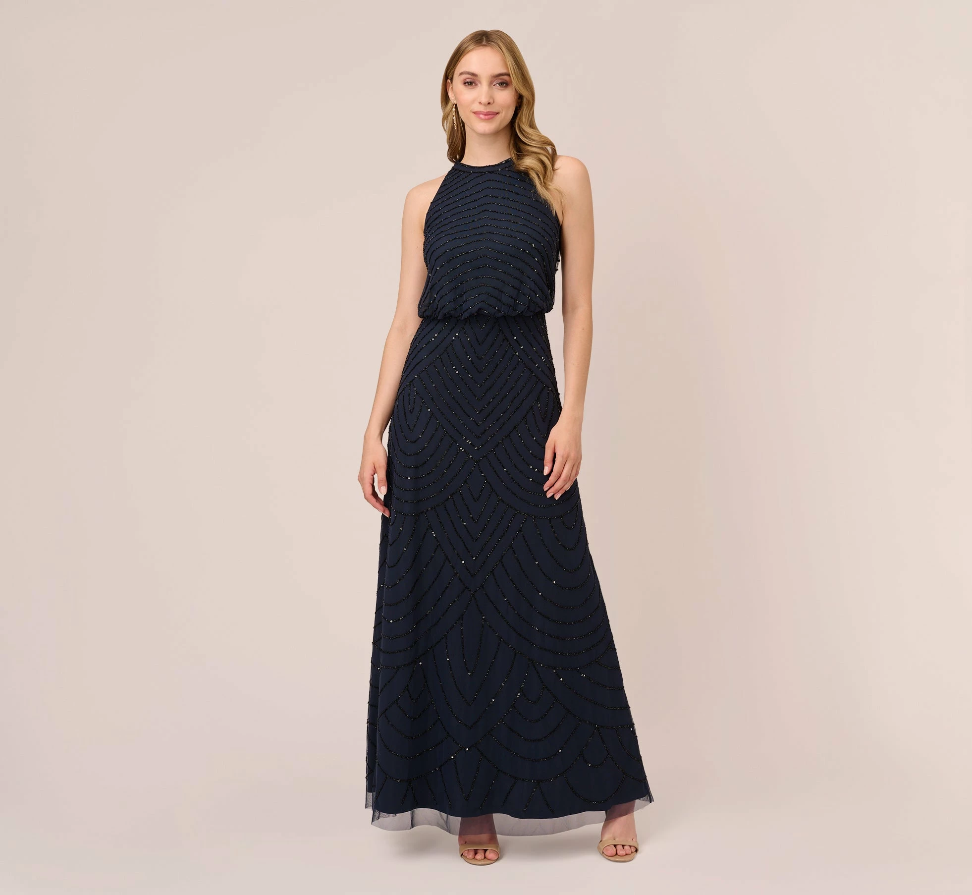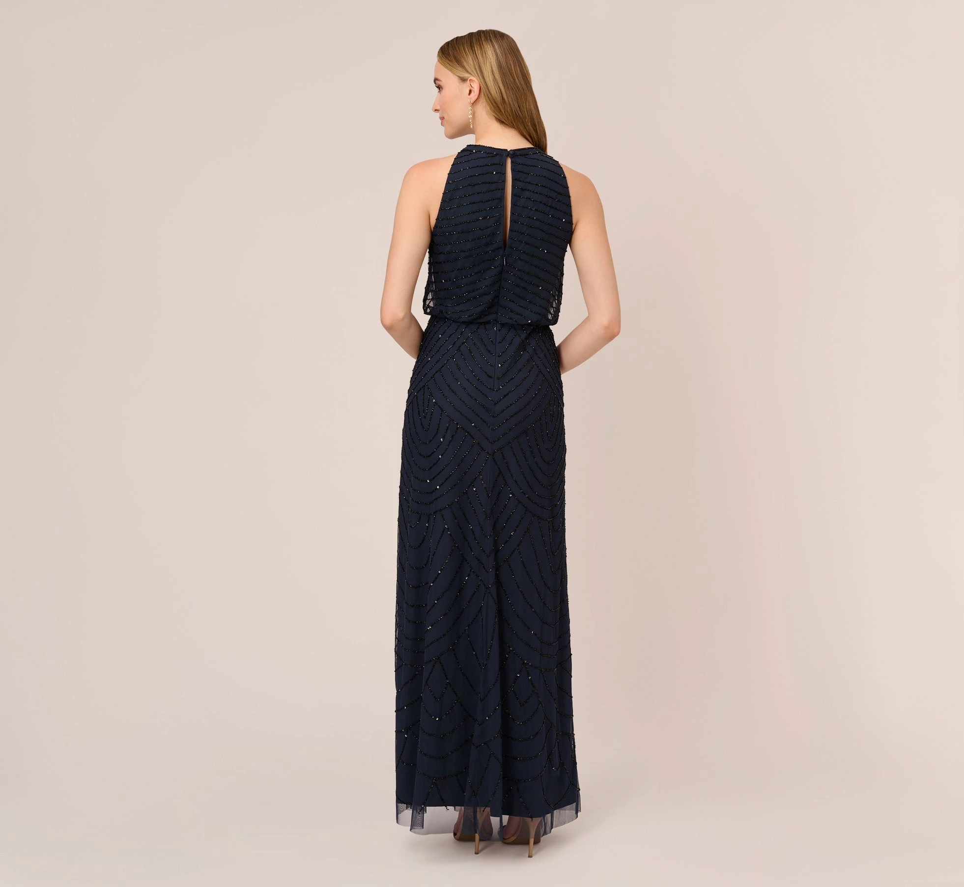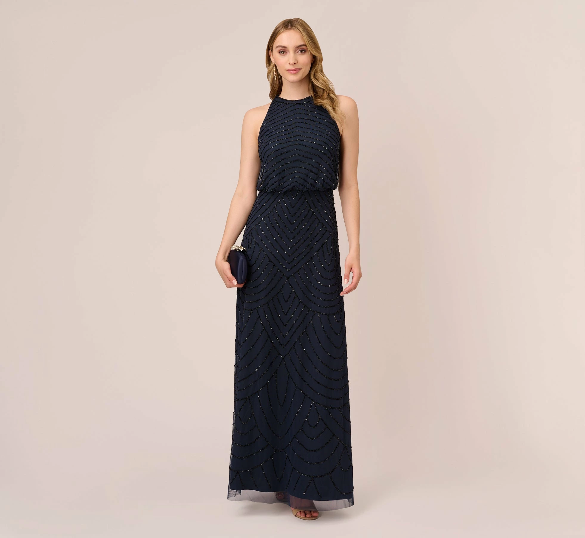 Create a high impact look at your next formal event when you choose this beautiful, beaded evening dress. For that upcoming wedding or gala, this special occasion gown features a blouson bodice, sparkling scalloped beading, and a flowing straight skirt. The back features a zipper closure and keyhole detail. Pair this beautiful sleeveless evening dress with chandelier earrings and a sleek metallic clutch for a jaw-dropping look sure to turn heads all evening.