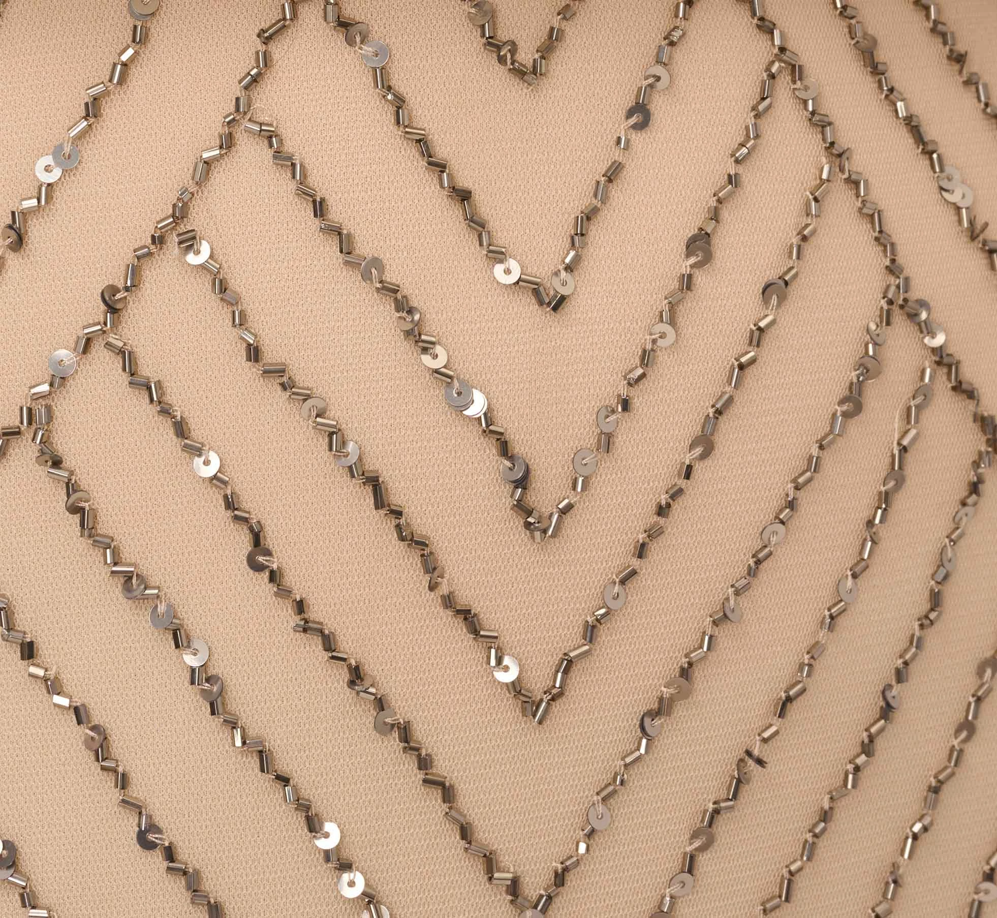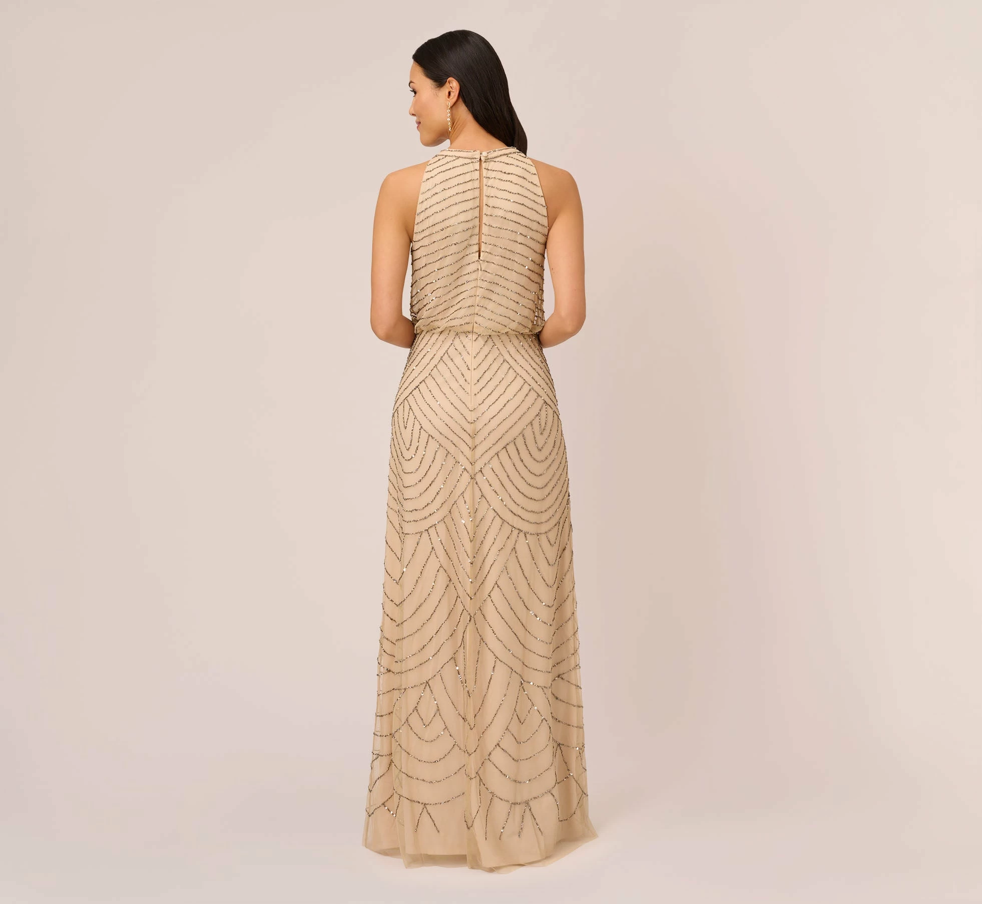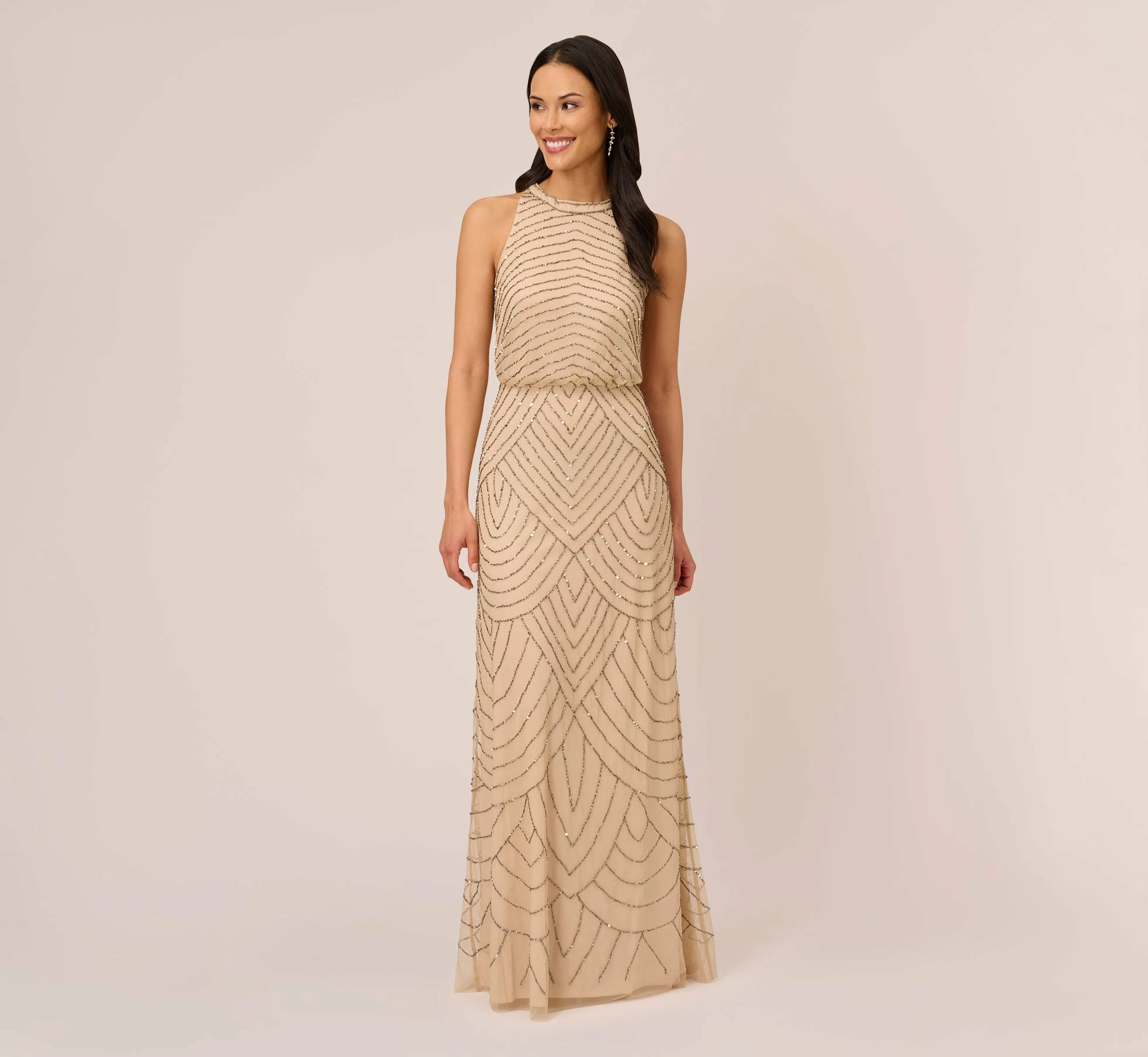 Create a high impact look at your next formal event when you choose this beautiful, beaded evening dress. For that upcoming wedding or gala, this special occasion gown features a blouson bodice, sparkling scalloped beading, and a flowing straight skirt. The back features a zipper closure and keyhole detail. Pair this beautiful sleeveless evening dress with chandelier earrings and a sleek metallic clutch for a jaw-dropping look sure to turn heads all evening.