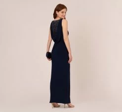A modern take on beloved beading, this formal dress is a shining addition. This beaded dress features a fitted bodice with cowl neckline, thin tank straps, and a mermaid skirt with slit at the side. This cowl-neck gown is fully lined and has a mesh overlay covered in sparkling art decosequin beading. A zipper closure completes the design at the center back of this beaded gown. Paired with a matching metallic heel and statement earrings, this dress is an unforgettable style.