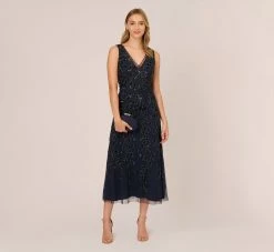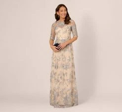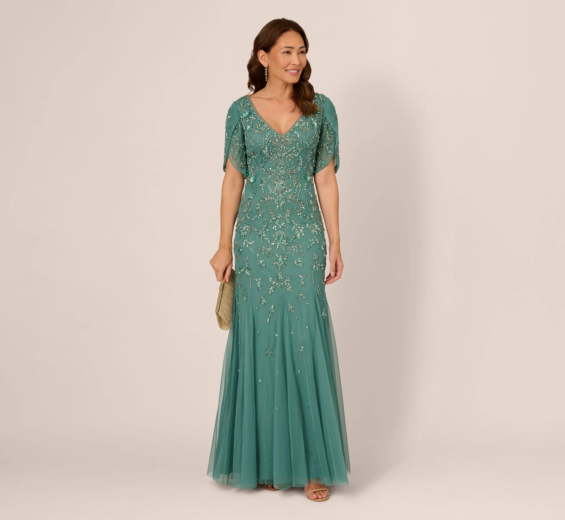 Boasting brilliant floral and scroll beaded details, this mermaid gown is anything but garden variety. This evening gown features a fitted bodice with bead adorned v-neckline, sheer petal-like short sleeves, and a mermaid skirt with godet pleats. Designed with mesh knit fabricand fully lined, this formal dress is covered in stunning multicolor sequins and beading that draws the eye. A no waist-seam design makes this beaded dress a comfortable fit for all body types and a zipper closure at the back is the final touch. Nude heels and a simple clutch willelevate this short sleeve gown with ease.