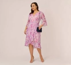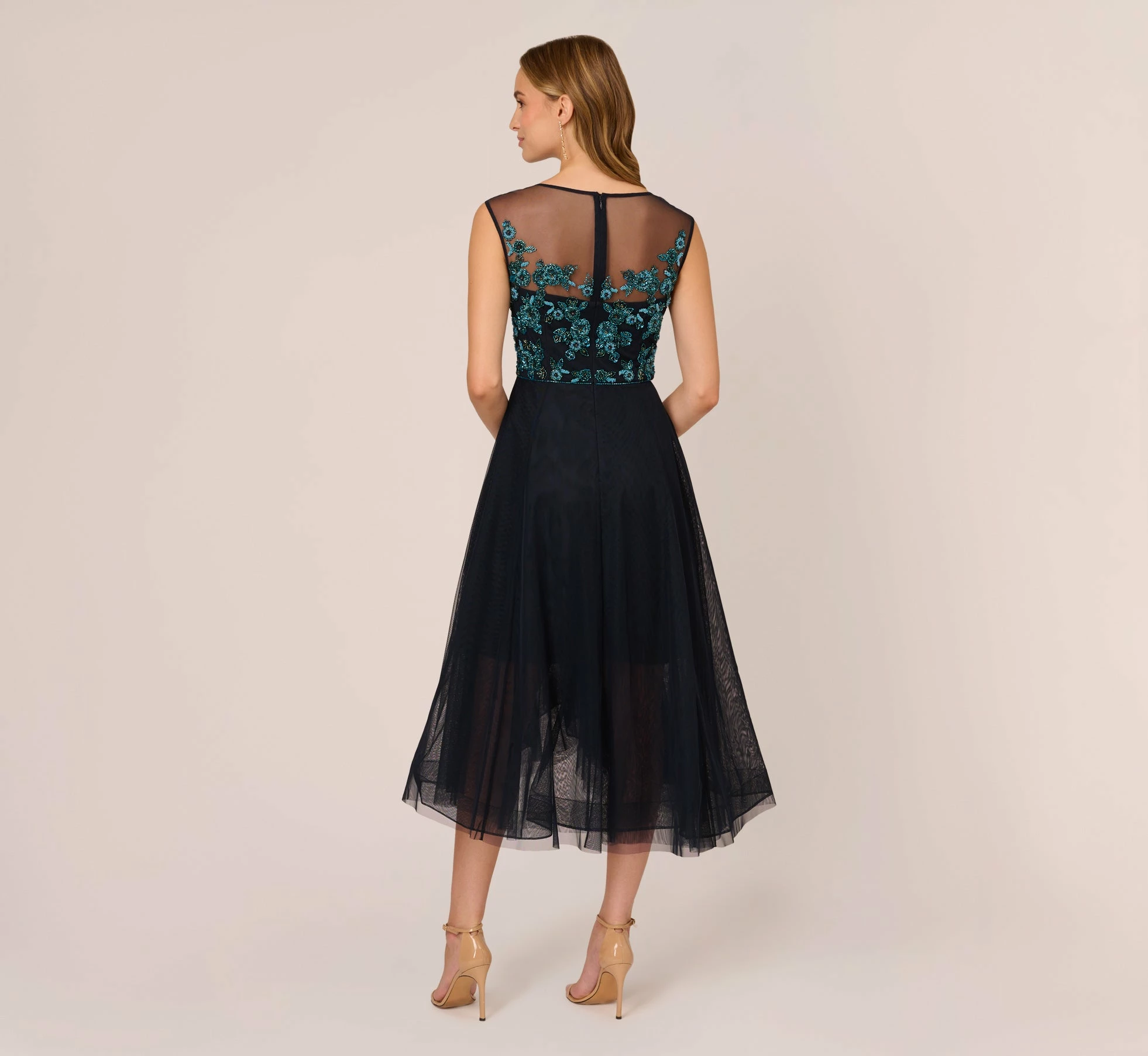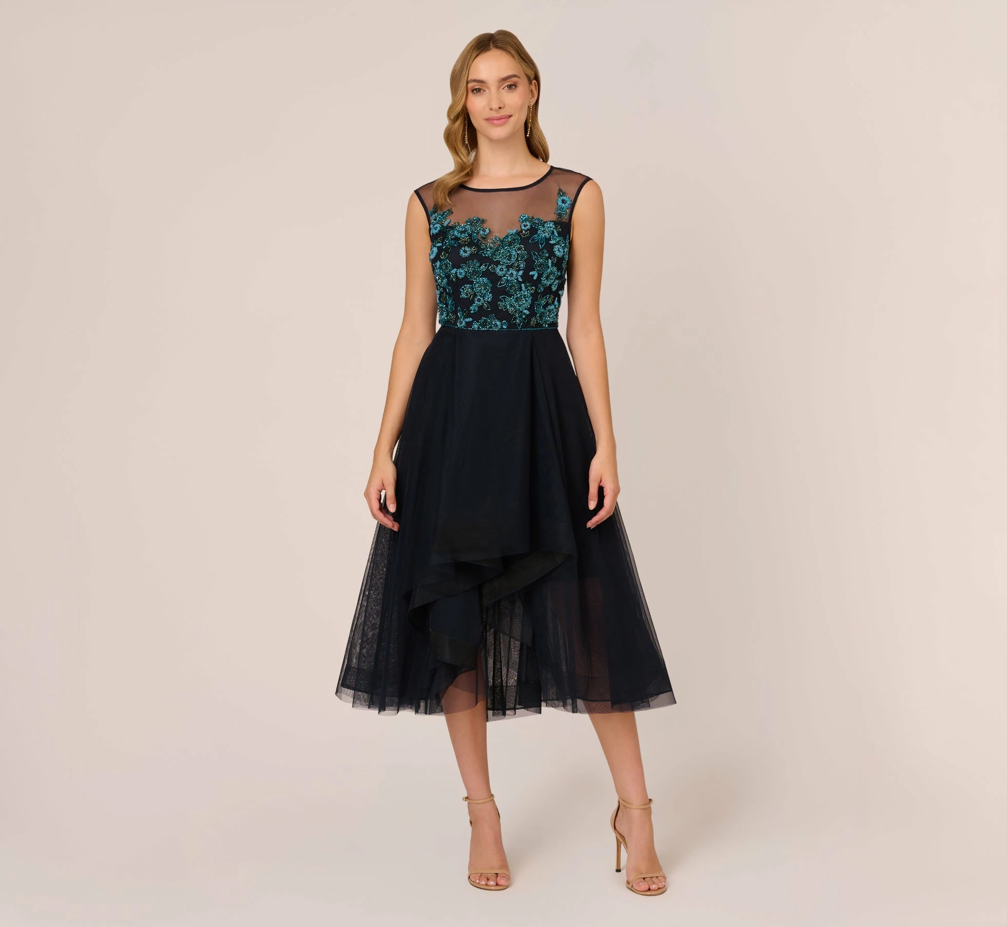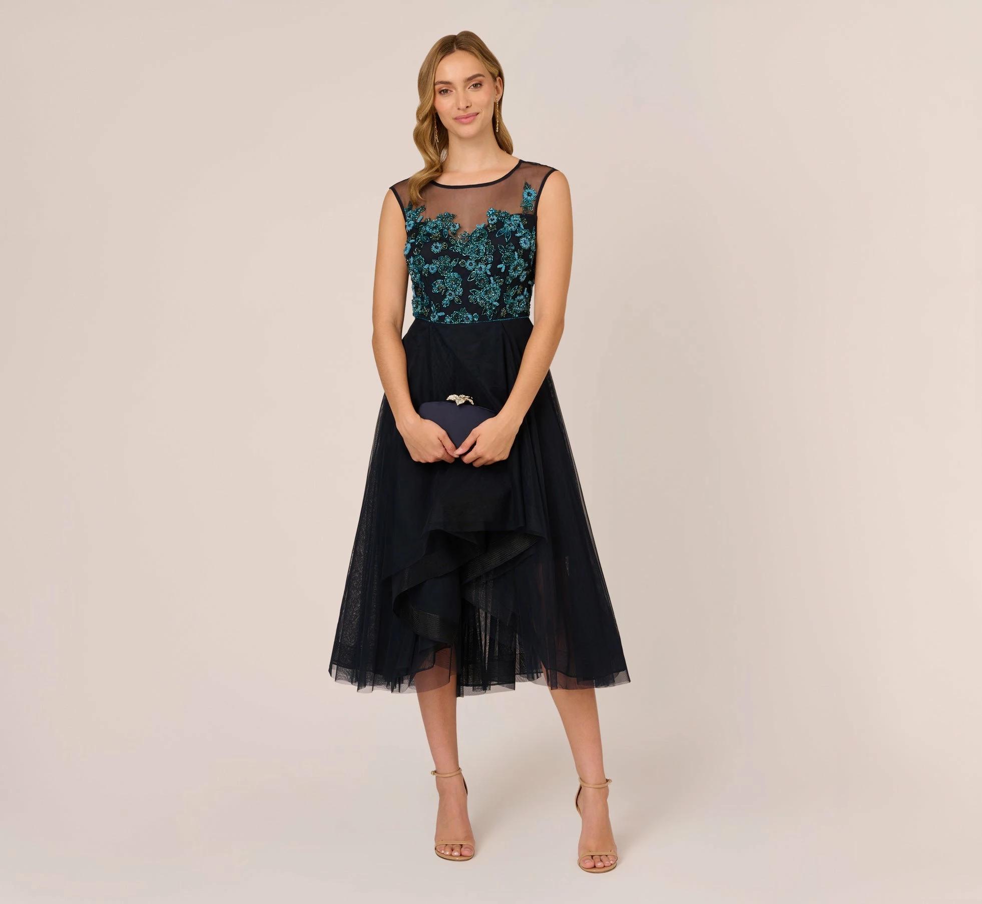 Embrace feminine details in this stunning midi dress. This cocktail dress features a fitted bodice with an illusion boat neckline, cap sleeves, and a high-low tulle skirt. The bodice is embroidered with multicolor sequin and beaded florals that pop in contrast to the dress. A zipper closure atthe center of the illusion back completes this midi dress. Styled with nude pumps and a simple clutch, this floral beaded dress is a remarkable look.