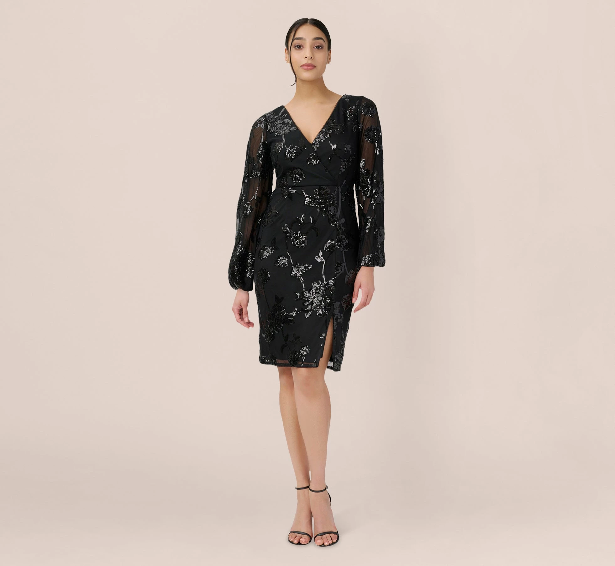An elevated twist of the classic LBD, our streamlined cocktail dress dazzles with allover beading on lightweight mesh. Details with love: the clean v-neckline and sheer long bishop sleeves. Sleek back zip closure.