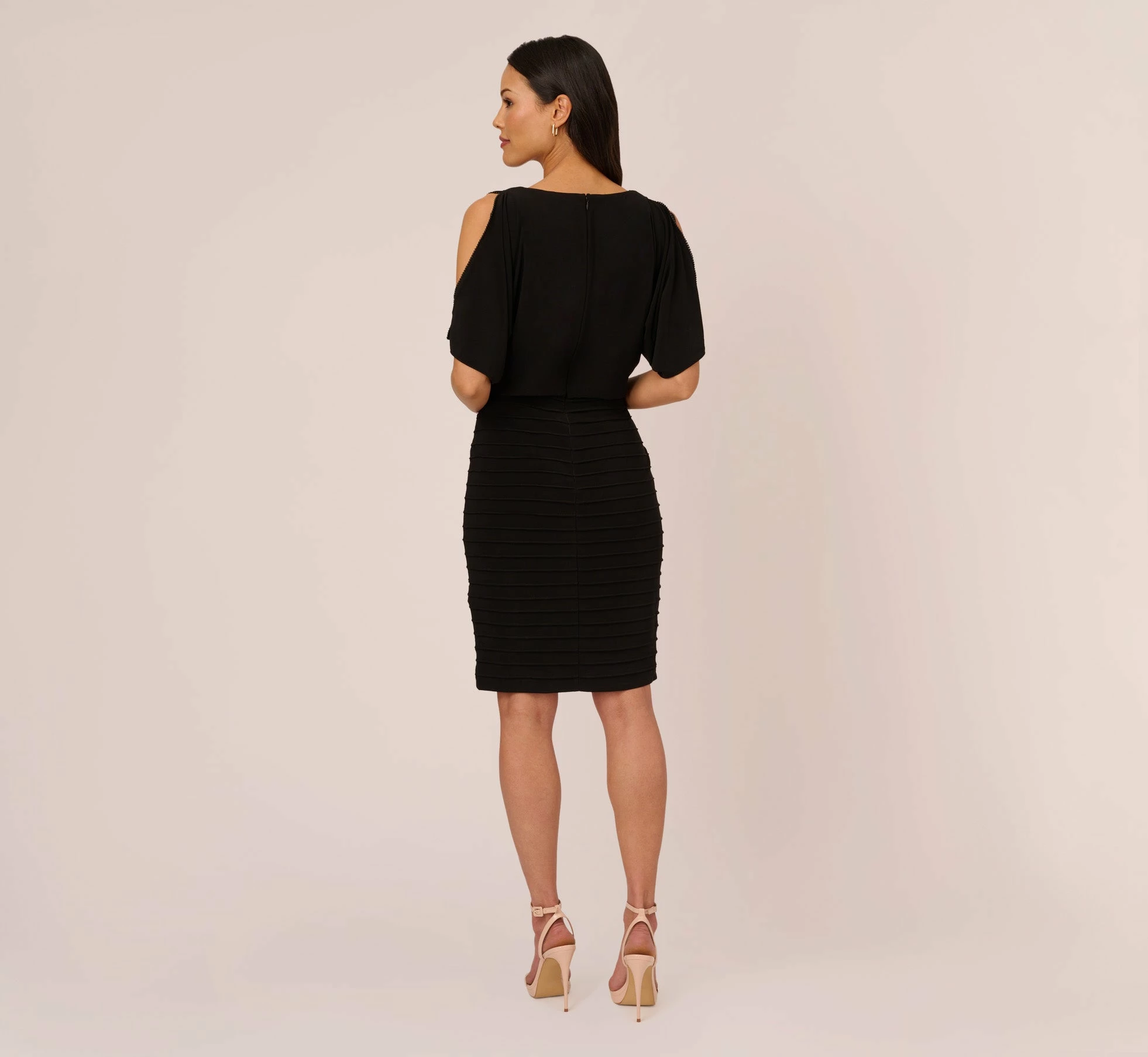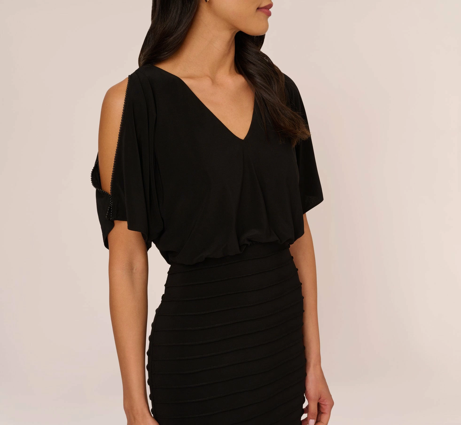 No matter the event, you’ll love wearing this jersey dress. This day-to-night dress features a blouson bodice with v-neck, short sleeves with cold-shoulder cutouts, and a pintucked skirt. Crafted from knit jersey fabric, this dress is incredibly comfortable and has a generous amount of stretch. A zipper closure at the back completes this dressed-up look. Style this dress for day with flats or pumps, or dress it up for night with metallic heels and a beaded clutch.