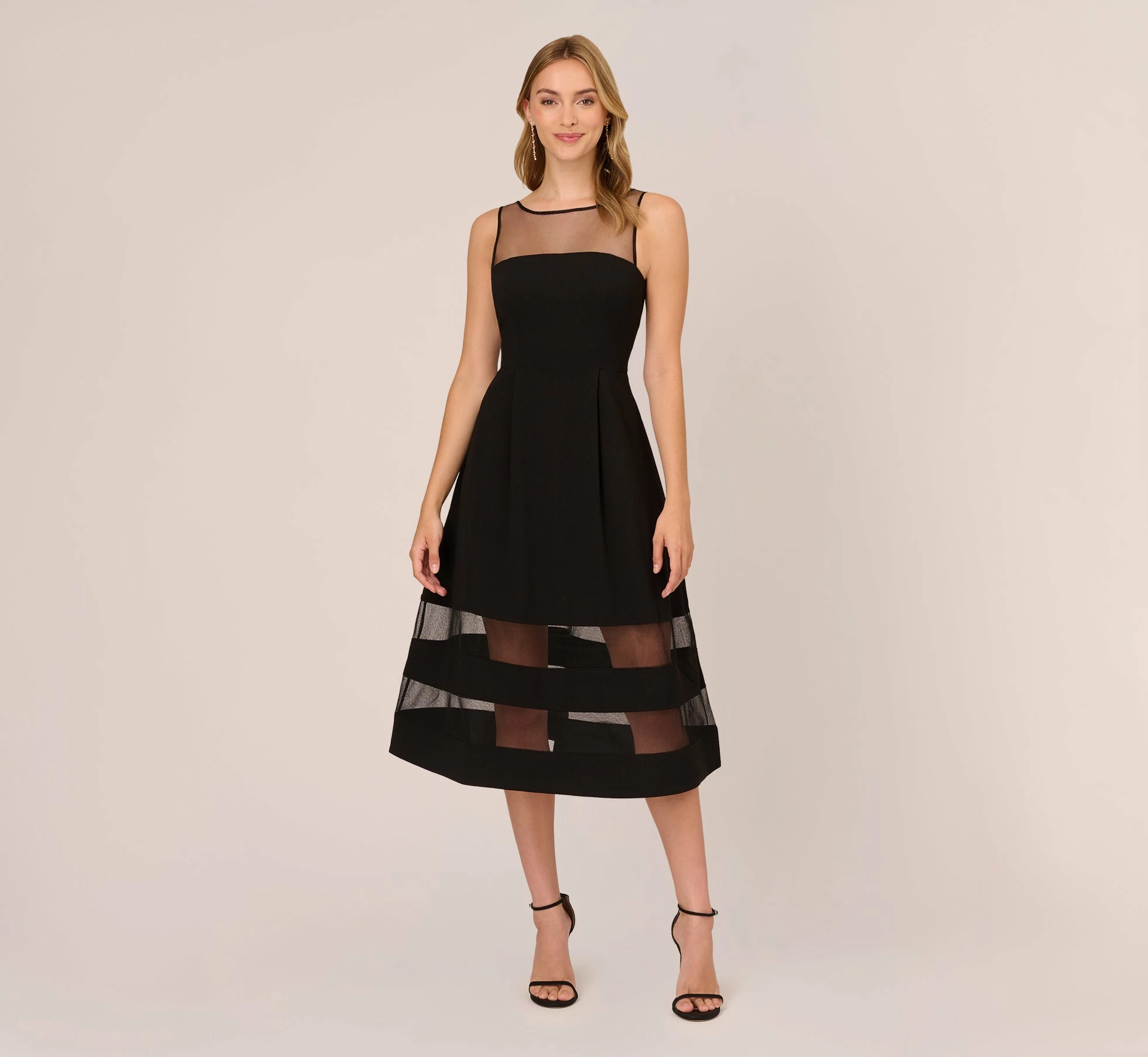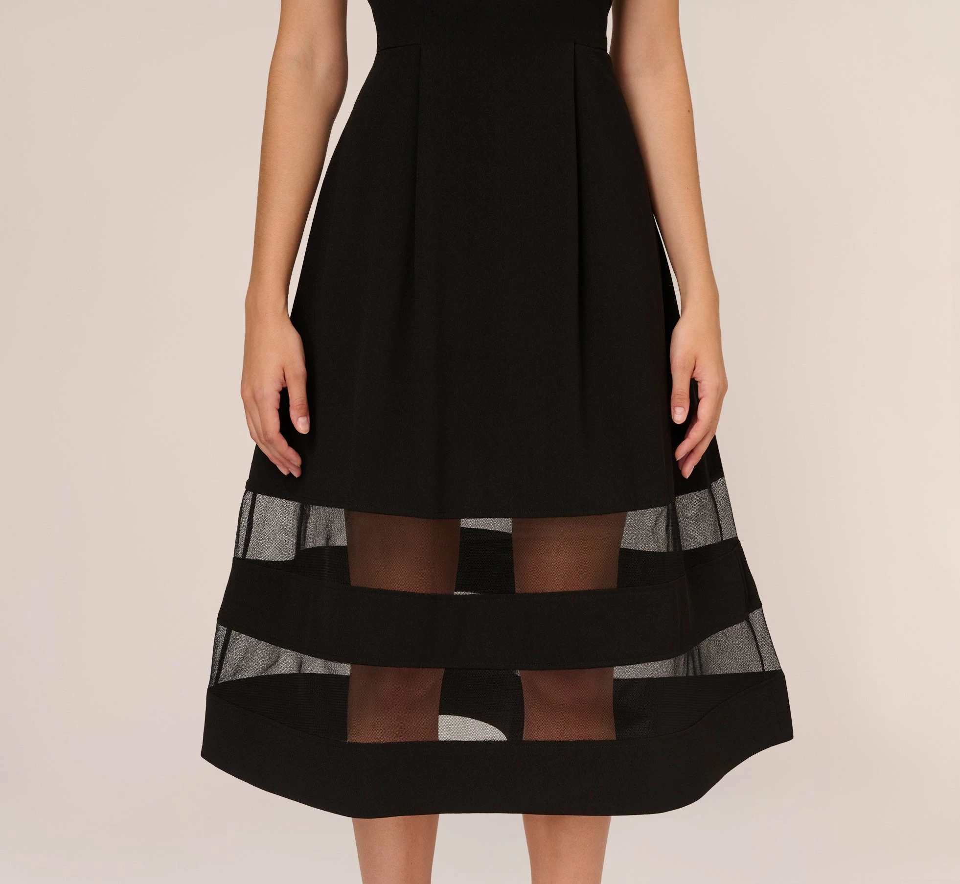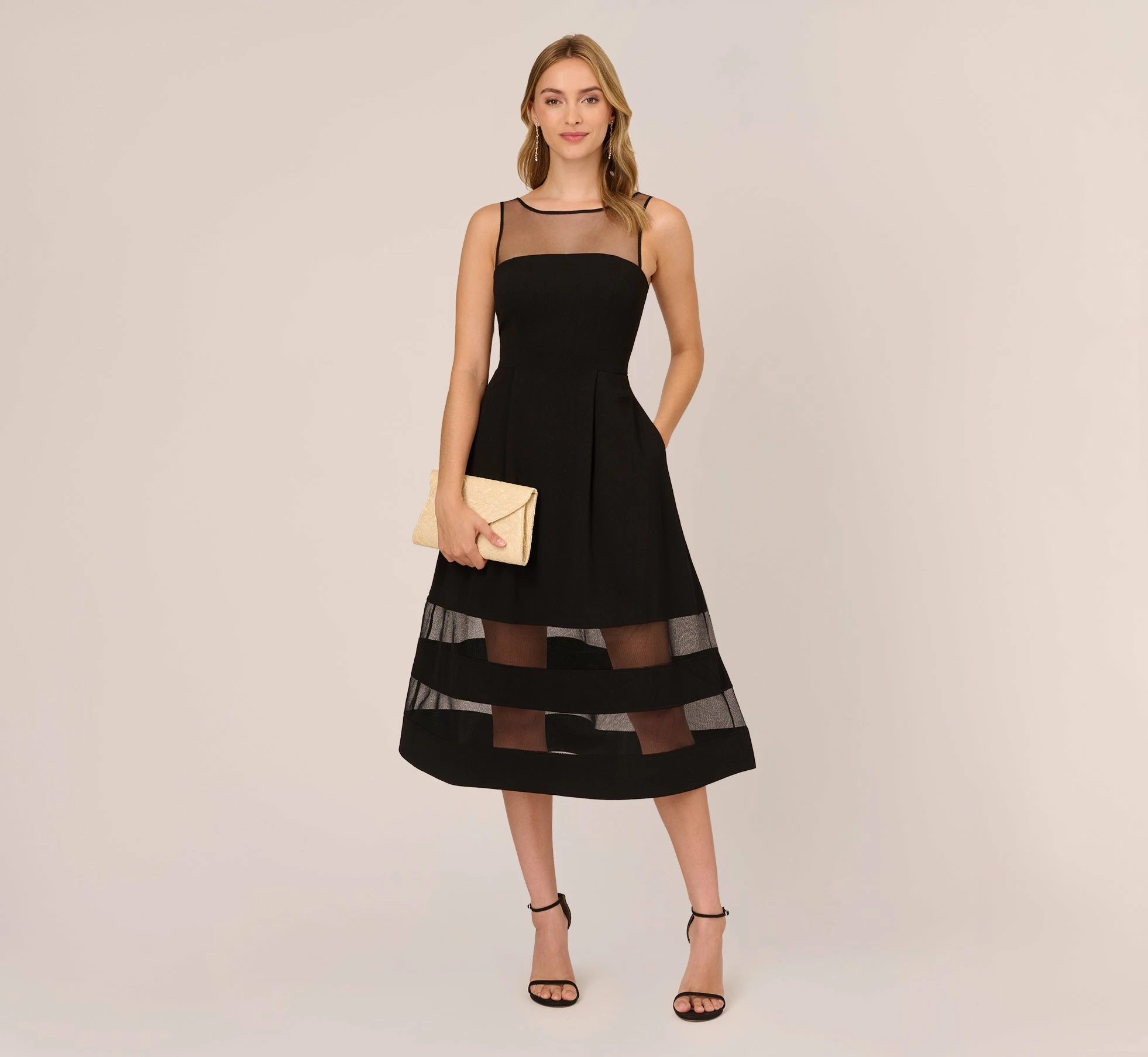 Modern and iconic, our fit-and-flare midi dress is crafted of a lightweight woven crepe with sheer illusion mesh inserts. All the details: modern bateau neckline, convenient side pockets and back hook-and-eye/zip closure. Be best dressed at cocktail parties, bridal showers, wedding receptions and any other celebratory occasion.