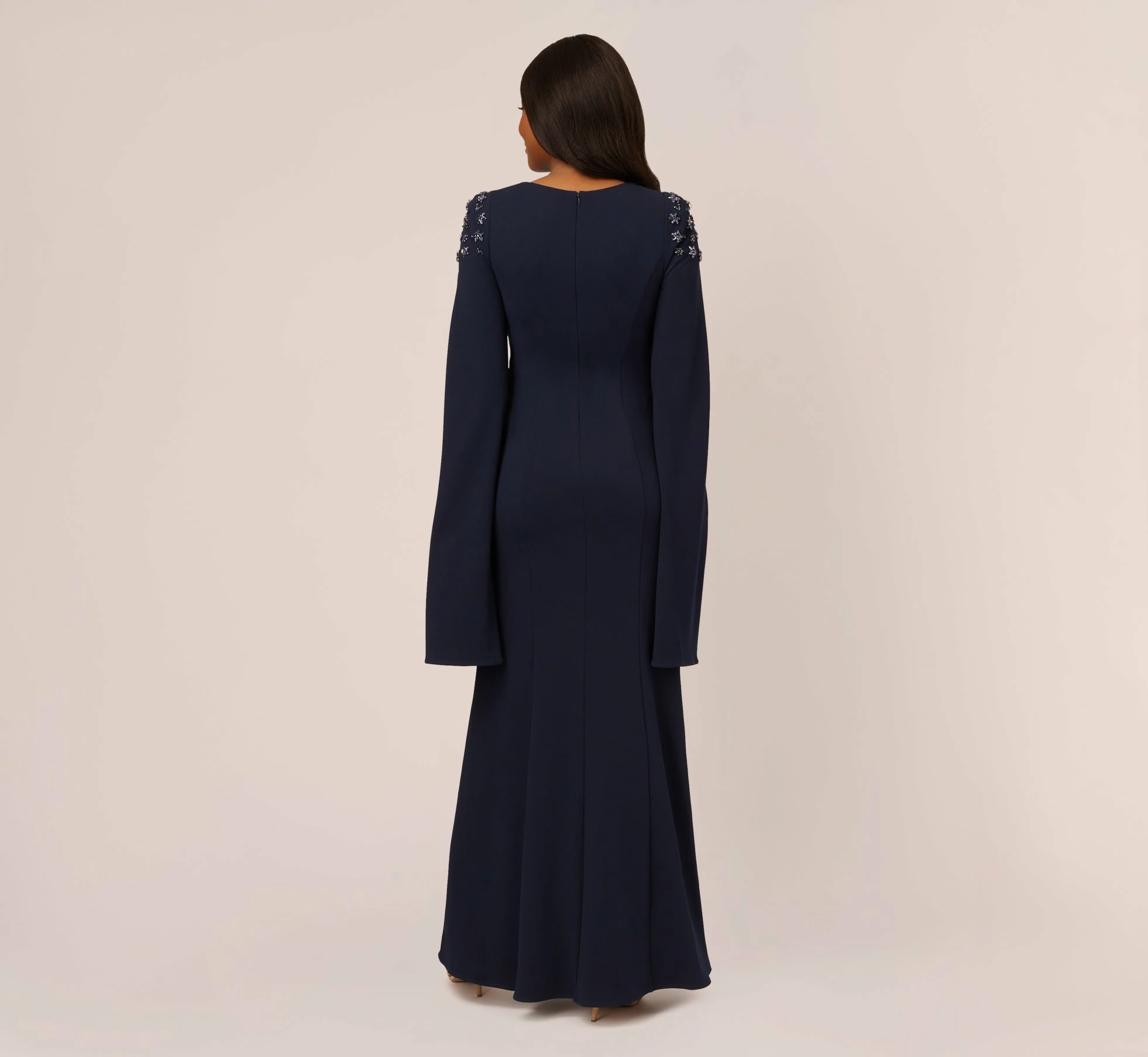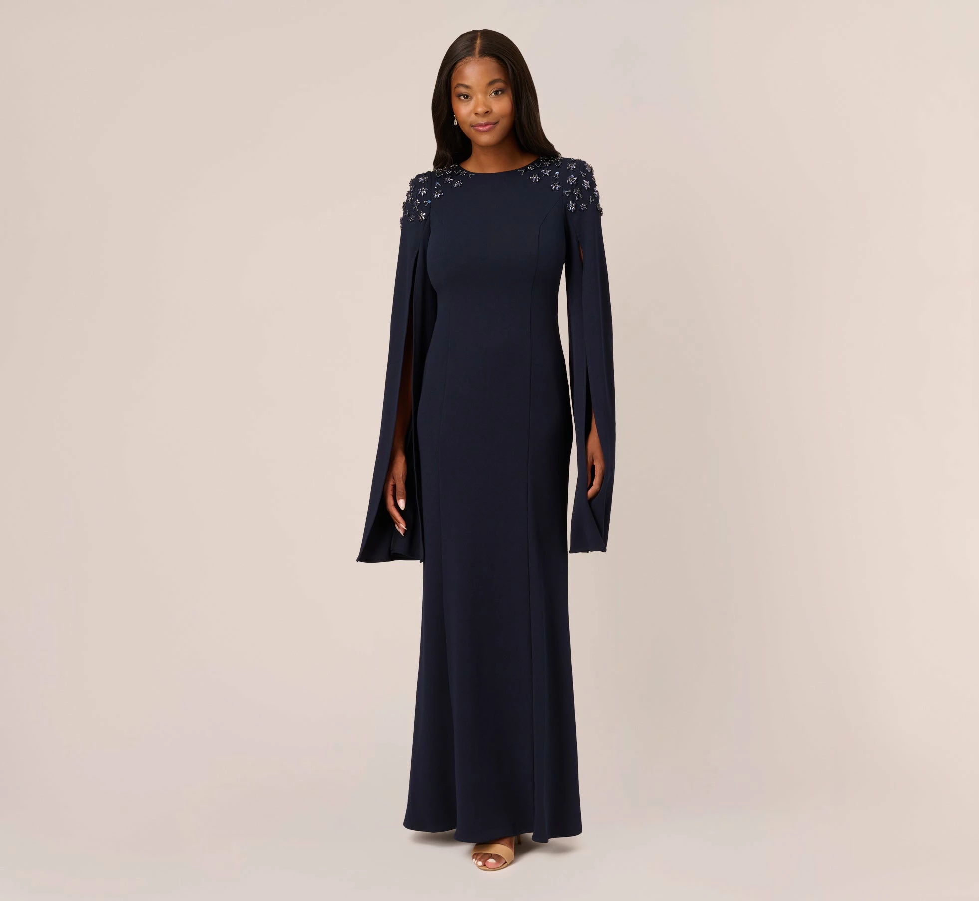 No matter the event, this mermaid gown is the main event. This formal dress features a crew neckline, long split sleeves that give a cape-like look, and crystal embellished shoulders. Crafted from crepe fabric, this dress has some stretch and no waist seam for a comfortable fiton all body types. A zipper closure at the back of the dress completes the design. Style this mermaid gown with striking metallic accessories to complete the look.