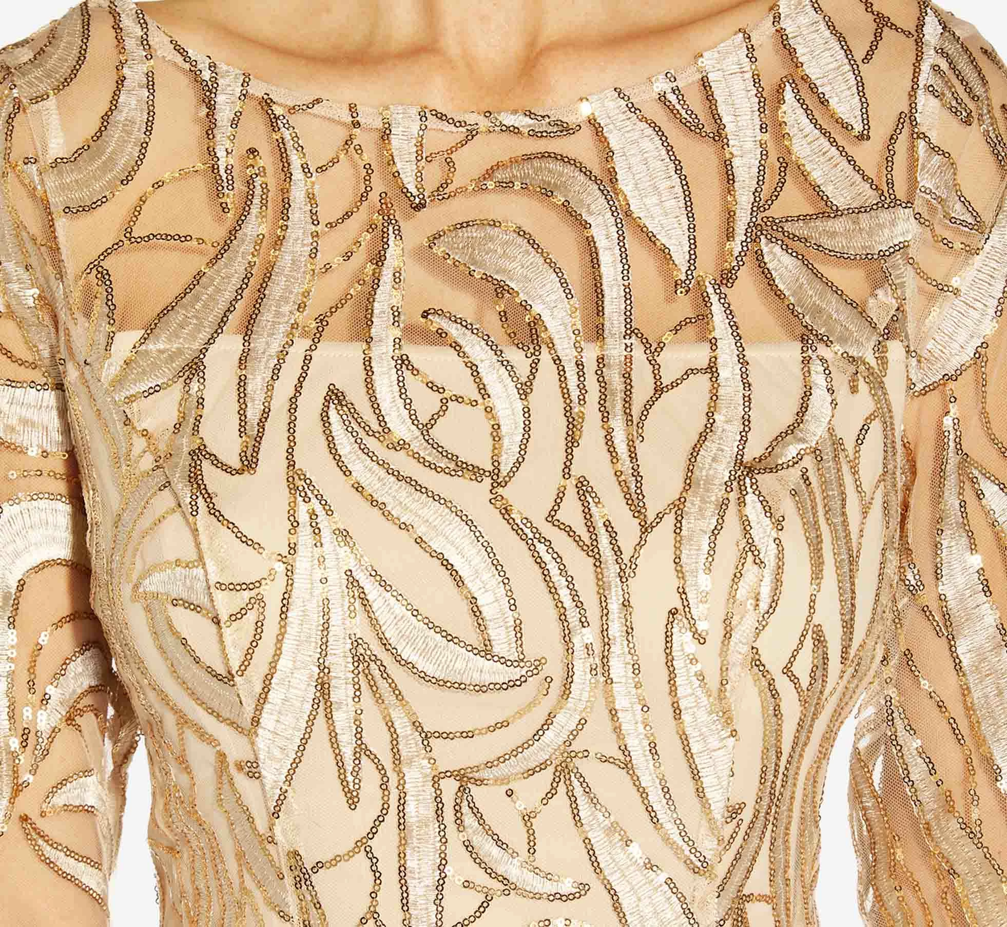 Refined, elegant and expertly designed, our floor-sweeping gown is ready for all your special moments. Beautifully detailed with swirled embroidery and sparkling hand sequined embellishments on the sheer illusion yoke and three-quarter sleeves. This luxe look is a brilliant choice for mothers-of-the-brides/groom and black-tie gala attendees.
