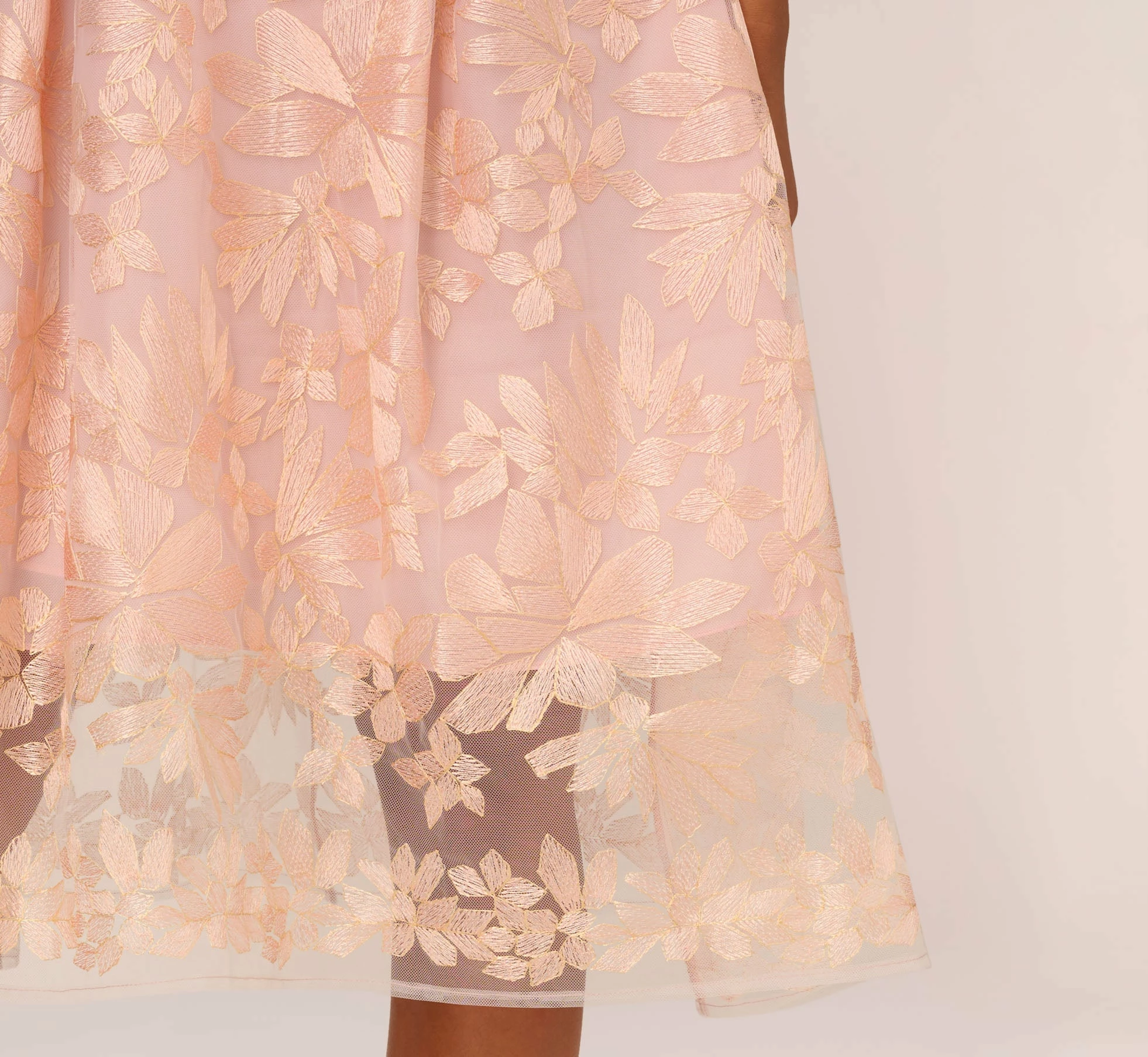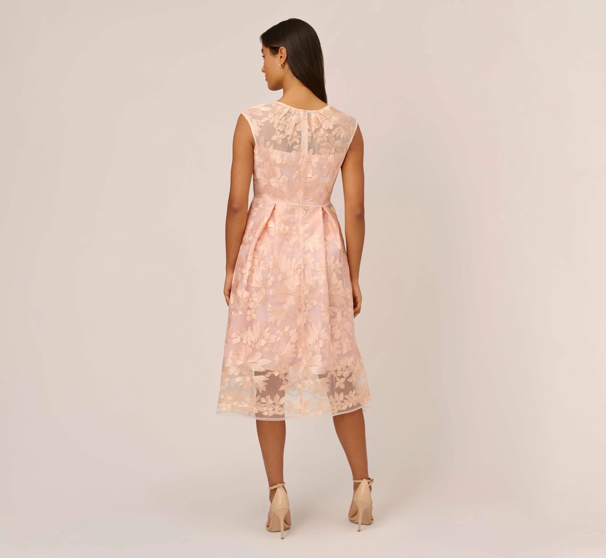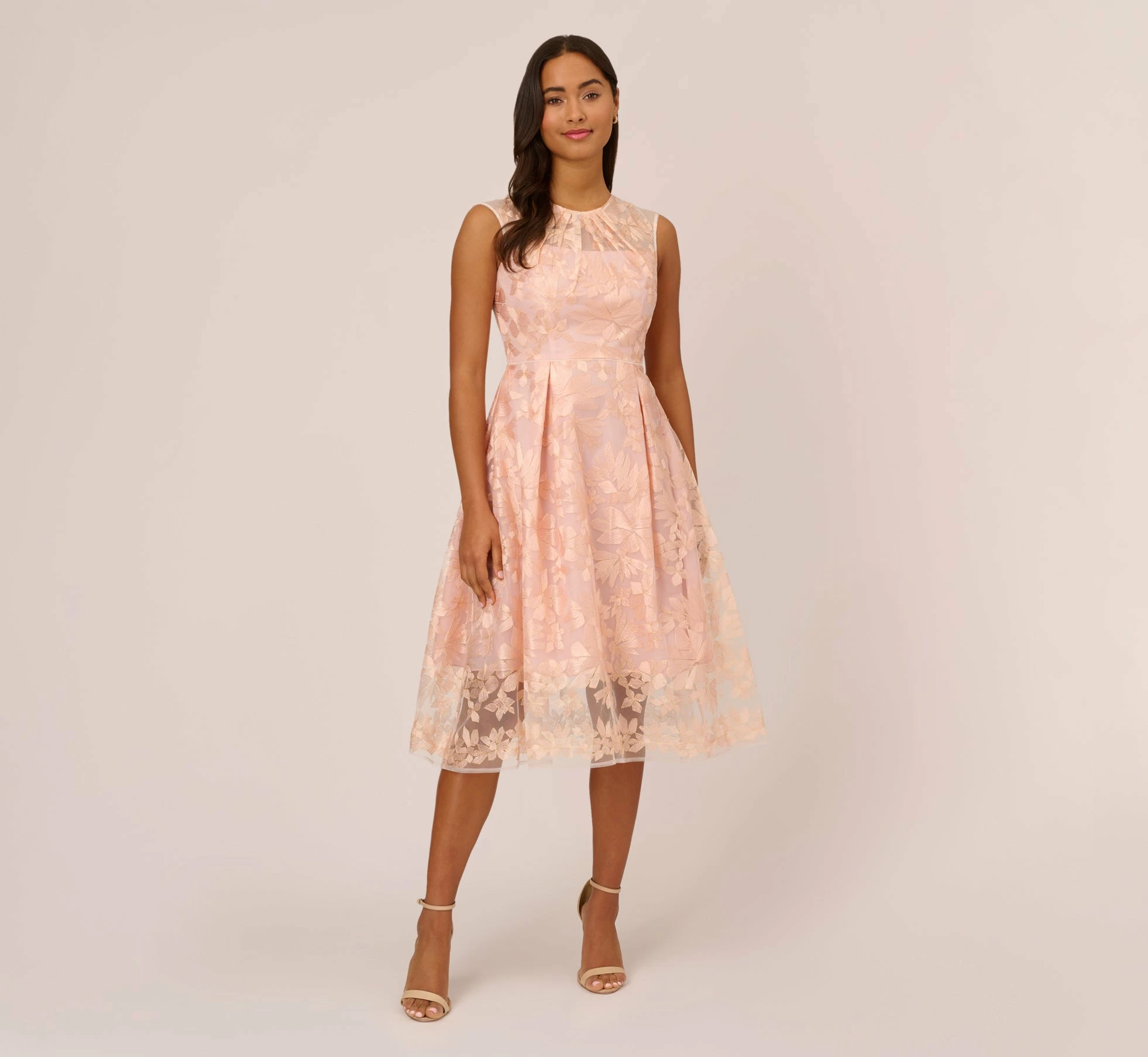 This fit and flare dress features a sleeveless bodice with sheer crew neckline with shirred details. A full, pleated skirt adds contrast to this midi dress. The floral embroidered overlay extends beyond the lining for a playful look. Style this sweet look with neutral heels for adaytime event, or add metallic accessories and a clutch for an evening out.