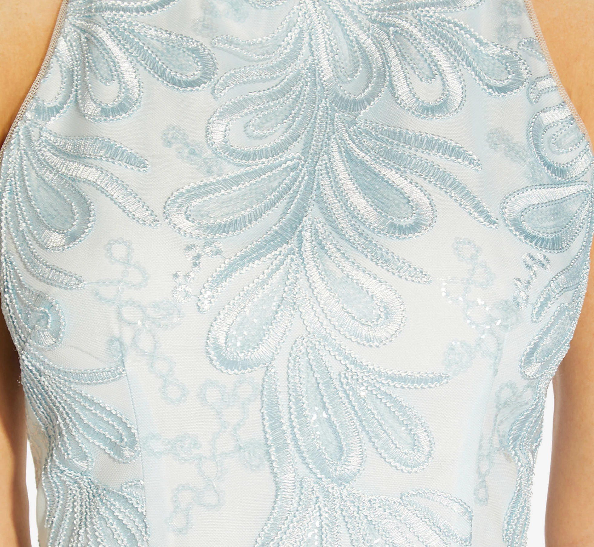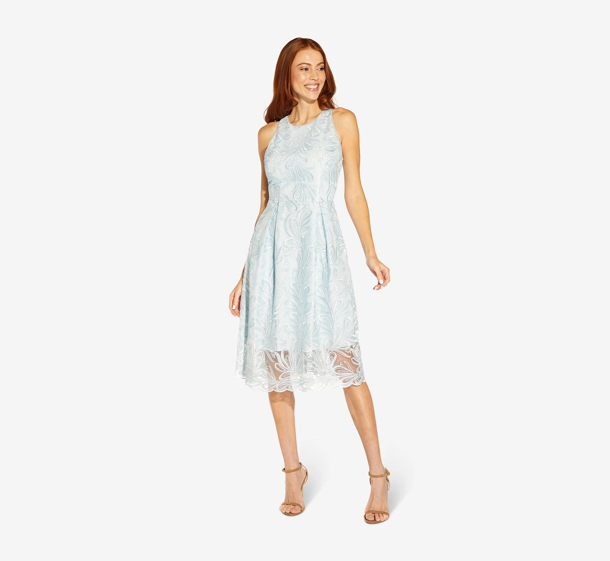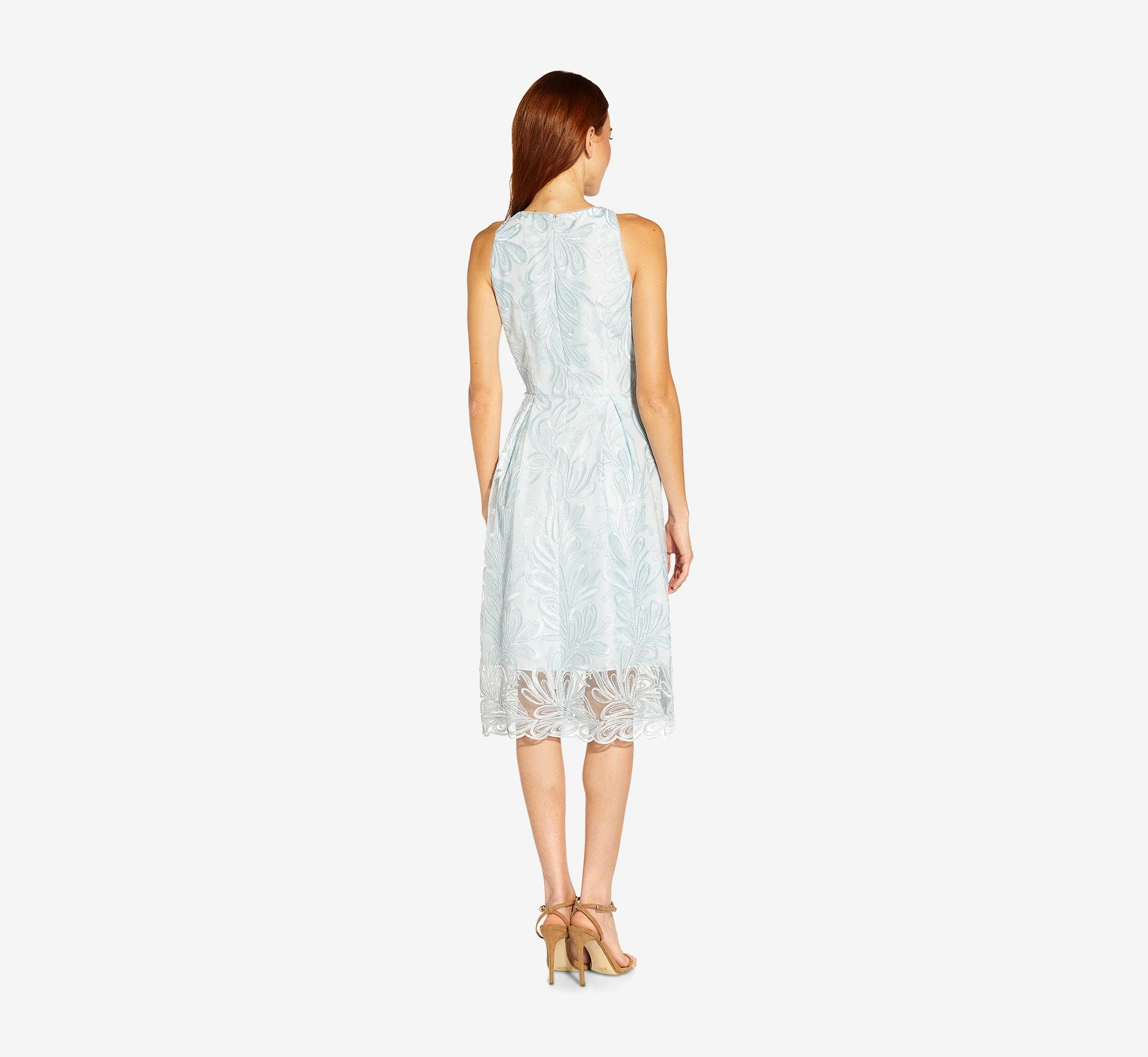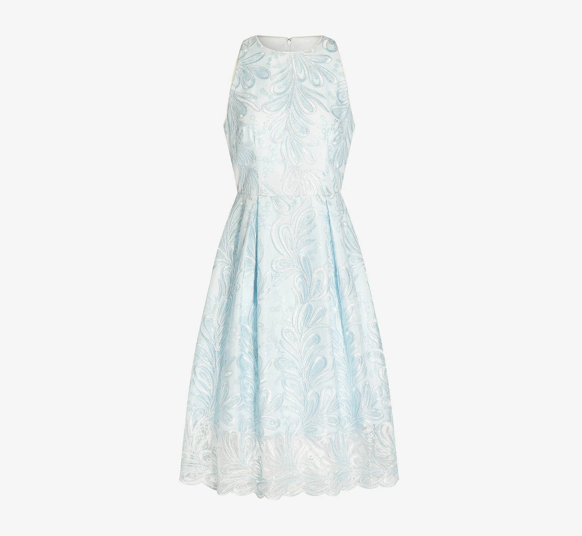 Refined elegance with a pop of sparkle: our iconic fit-and-flare dress gets treated to beautiful ribbon embroidery with sprinkles of shimmering hand sequined details. Gently fitted bodice is eased by box pleats at the waist and flows to a flared skirt. Details: seamed waist, scalloped hemline. Perfect for cocktail hours and wedding receptions.