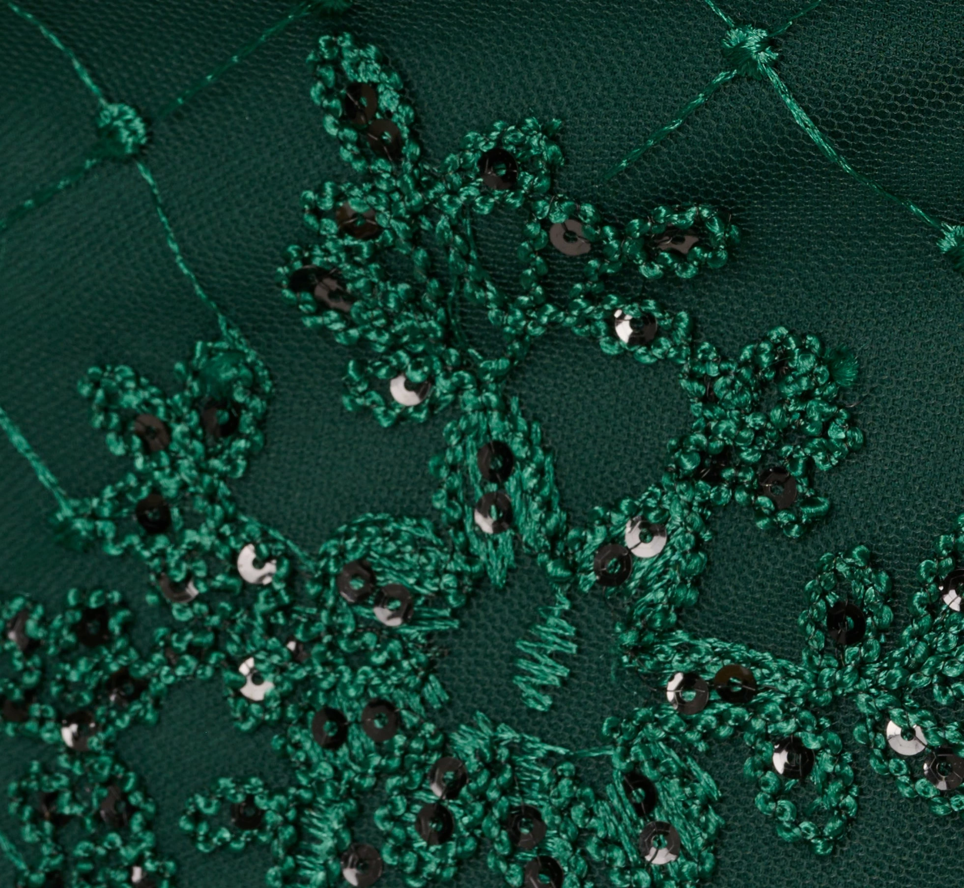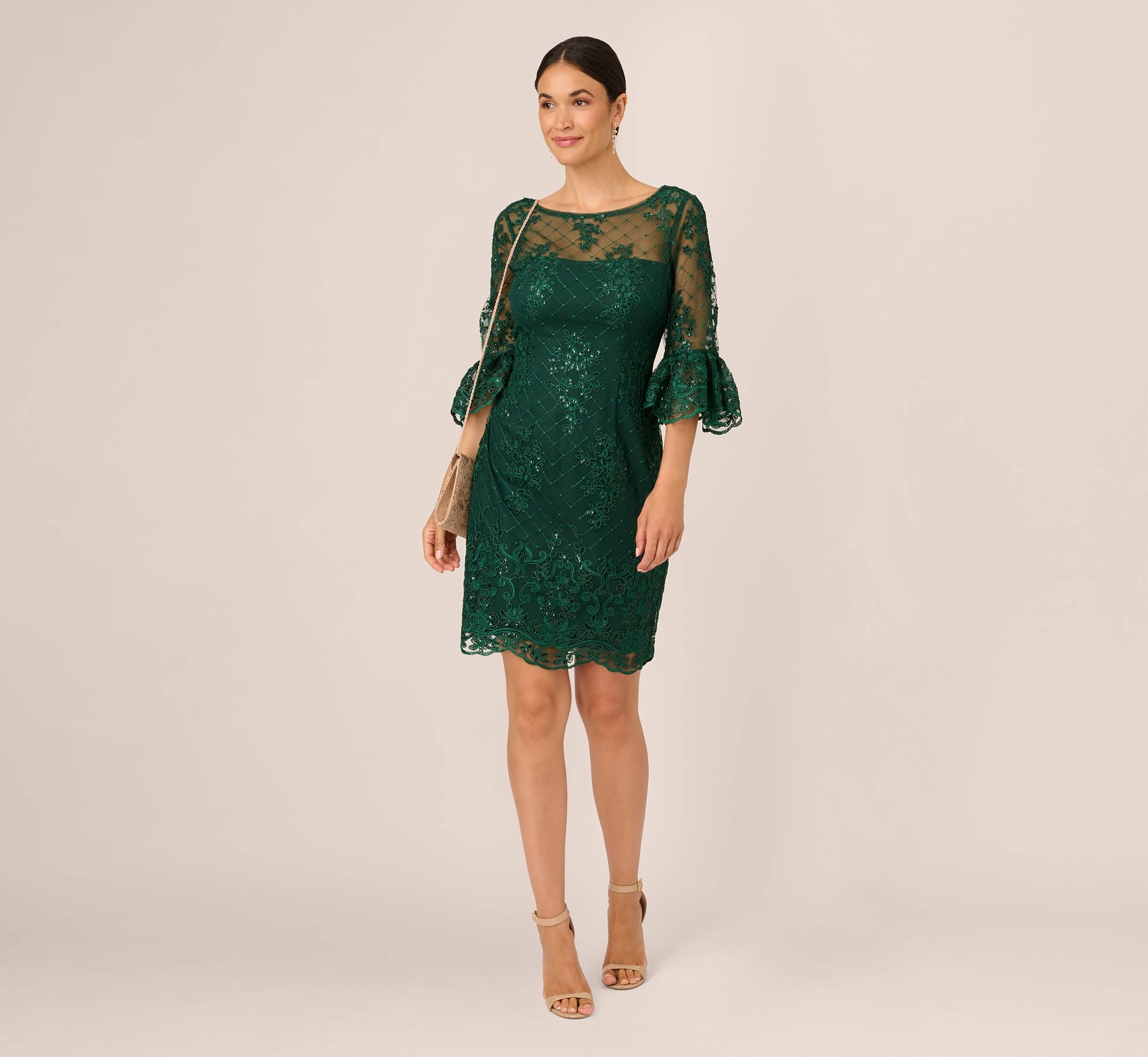 From business dinners to cocktail attire events, this three-quarter sleeve dress will stun. This dress features a boat neckline, sheer three-quarter length bell sleeves, and a sheath fit. Crafted from a woven fabric with embroidery details, this dress has subtle sparkle courtesy of inlaid sequins. Scalloped details add a playful detail to the skirt hem and an illusion neckline gives this dress a strapless-like design. A zipper closure at the center of the sheer back completes this design.