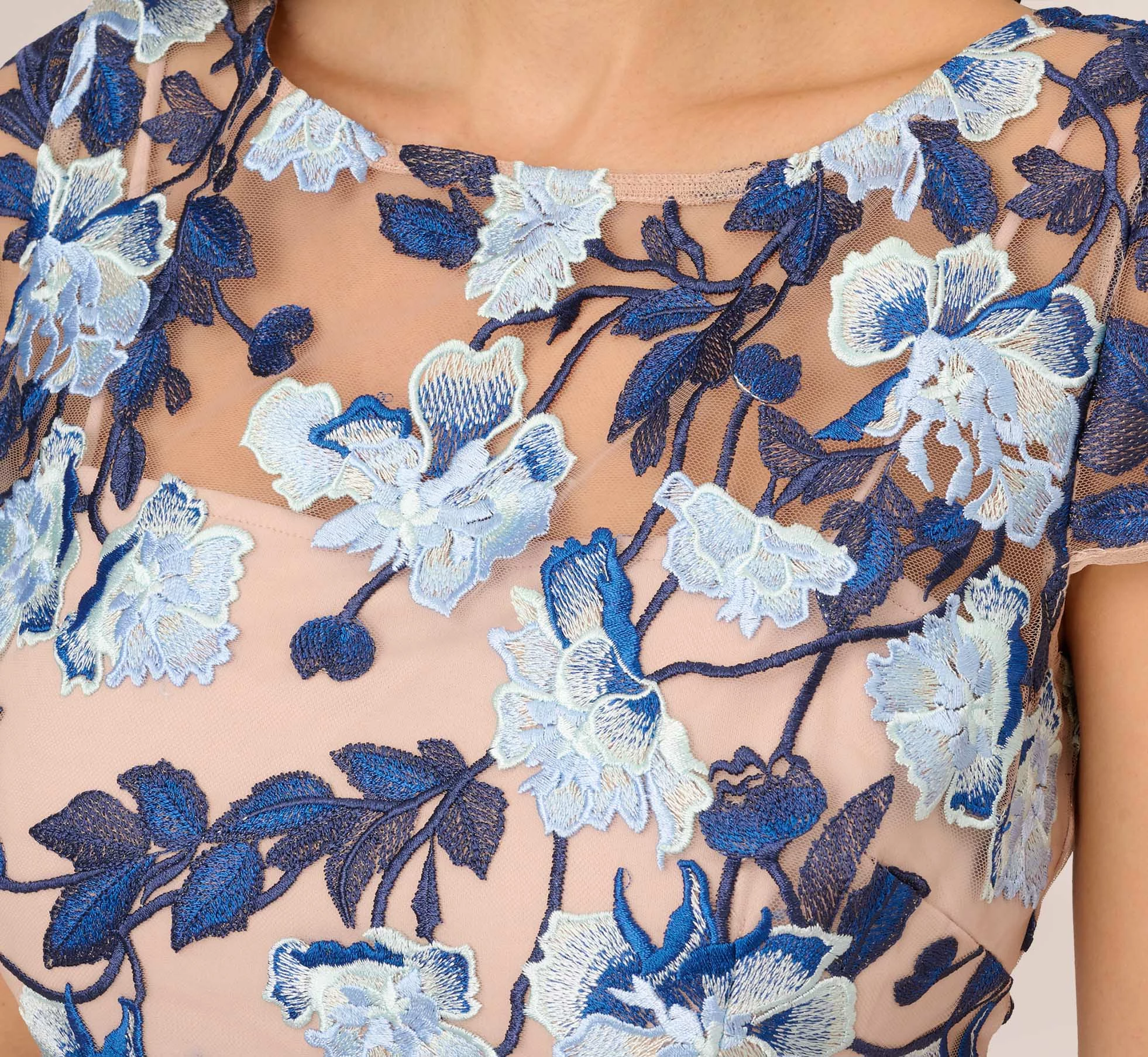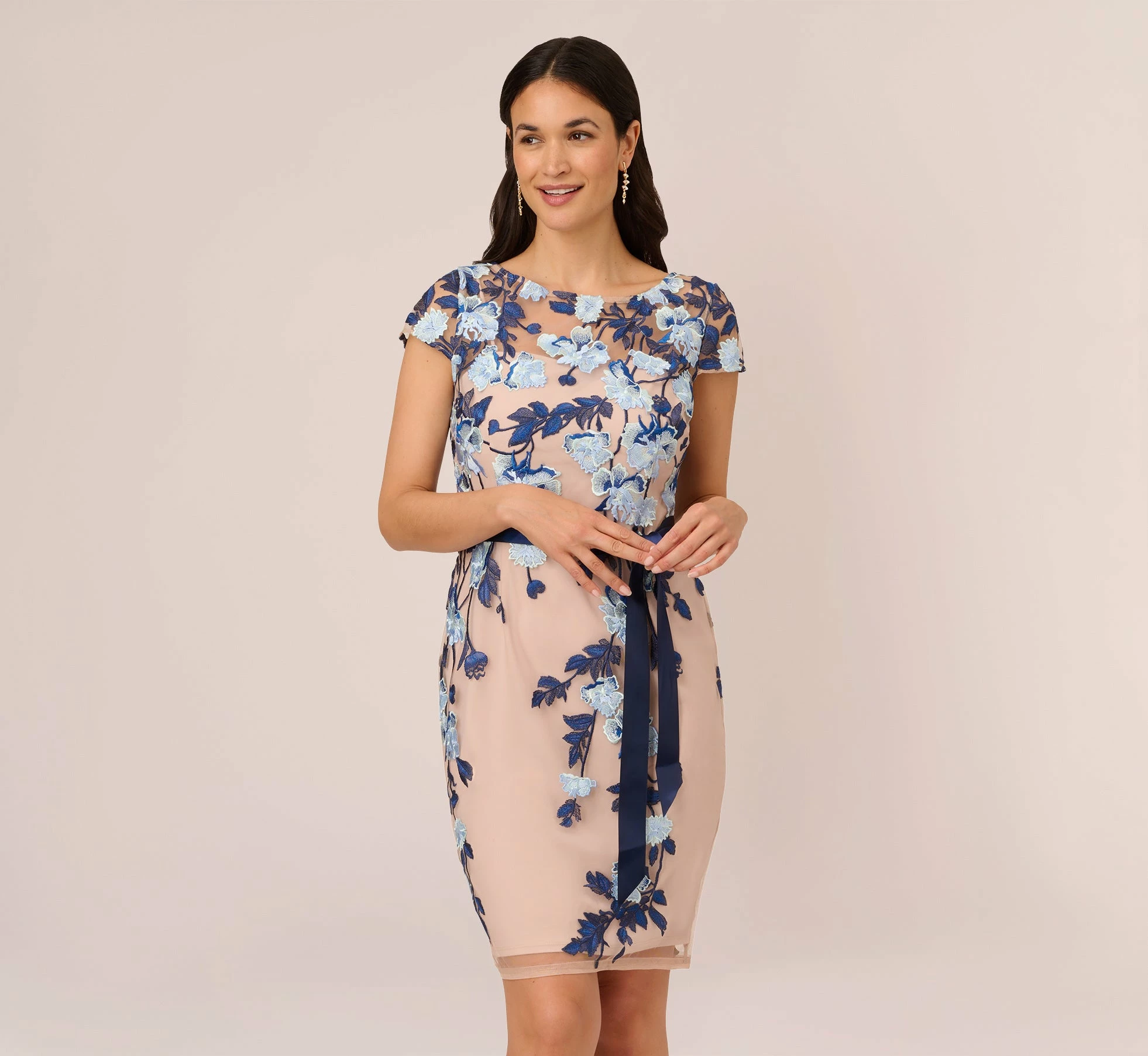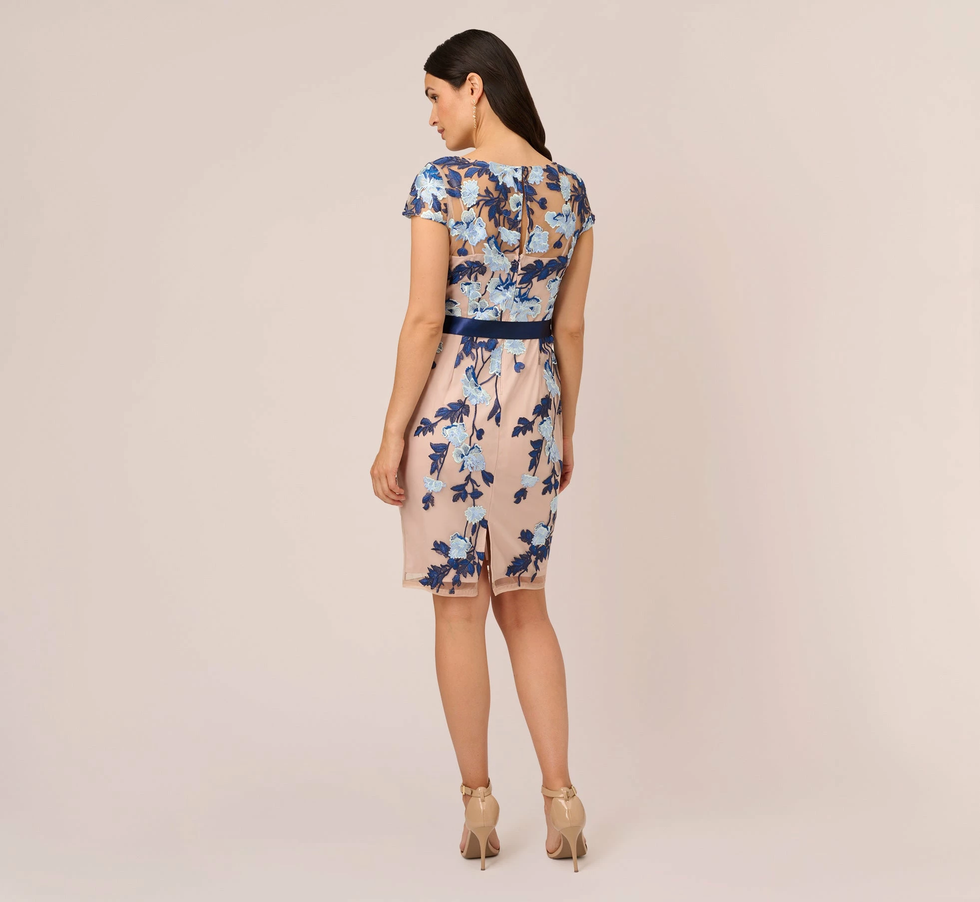 An iconic sheath dress in an elegant, fitted silhouette that skims the figure beautifully, accented with allover floral embroidery, short sleeves and a feminine bateau neckline.