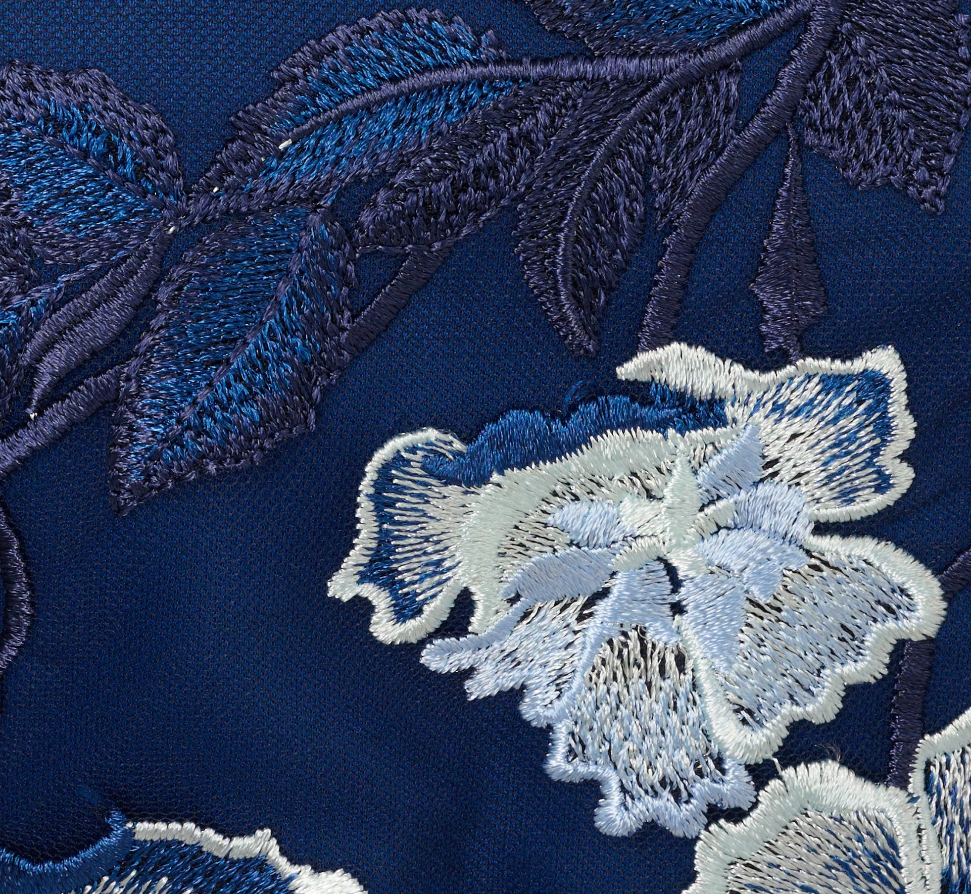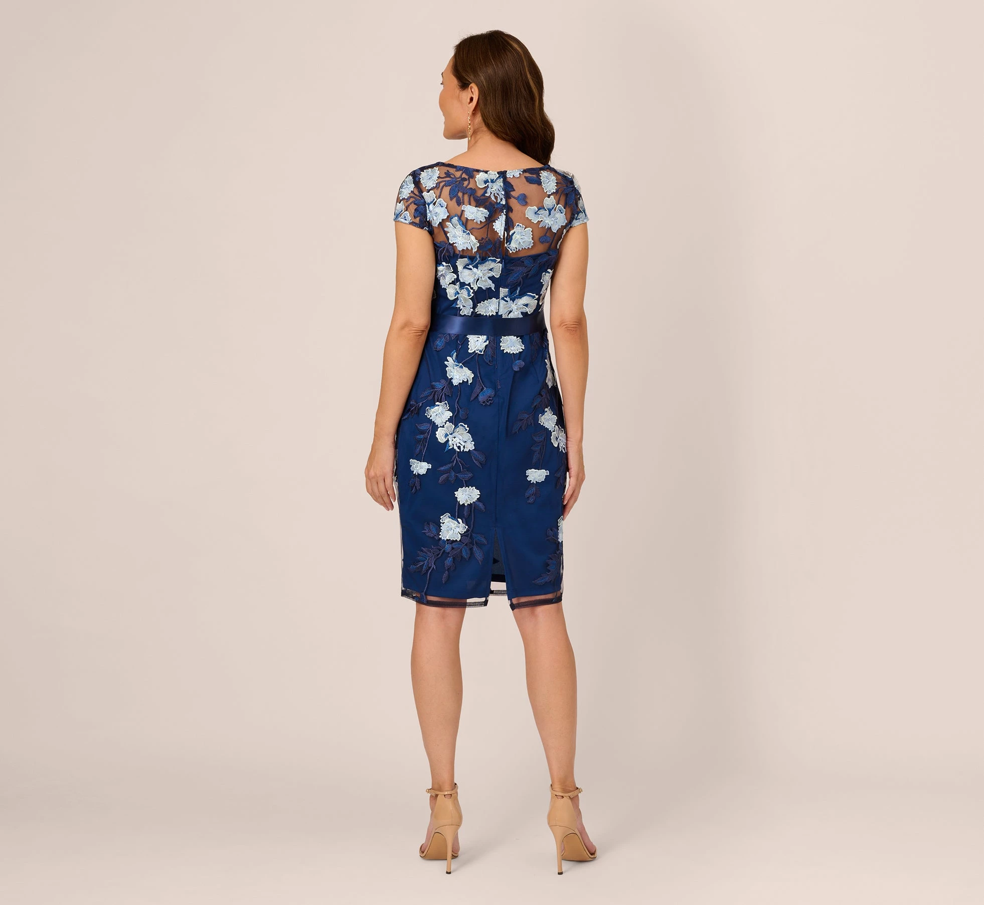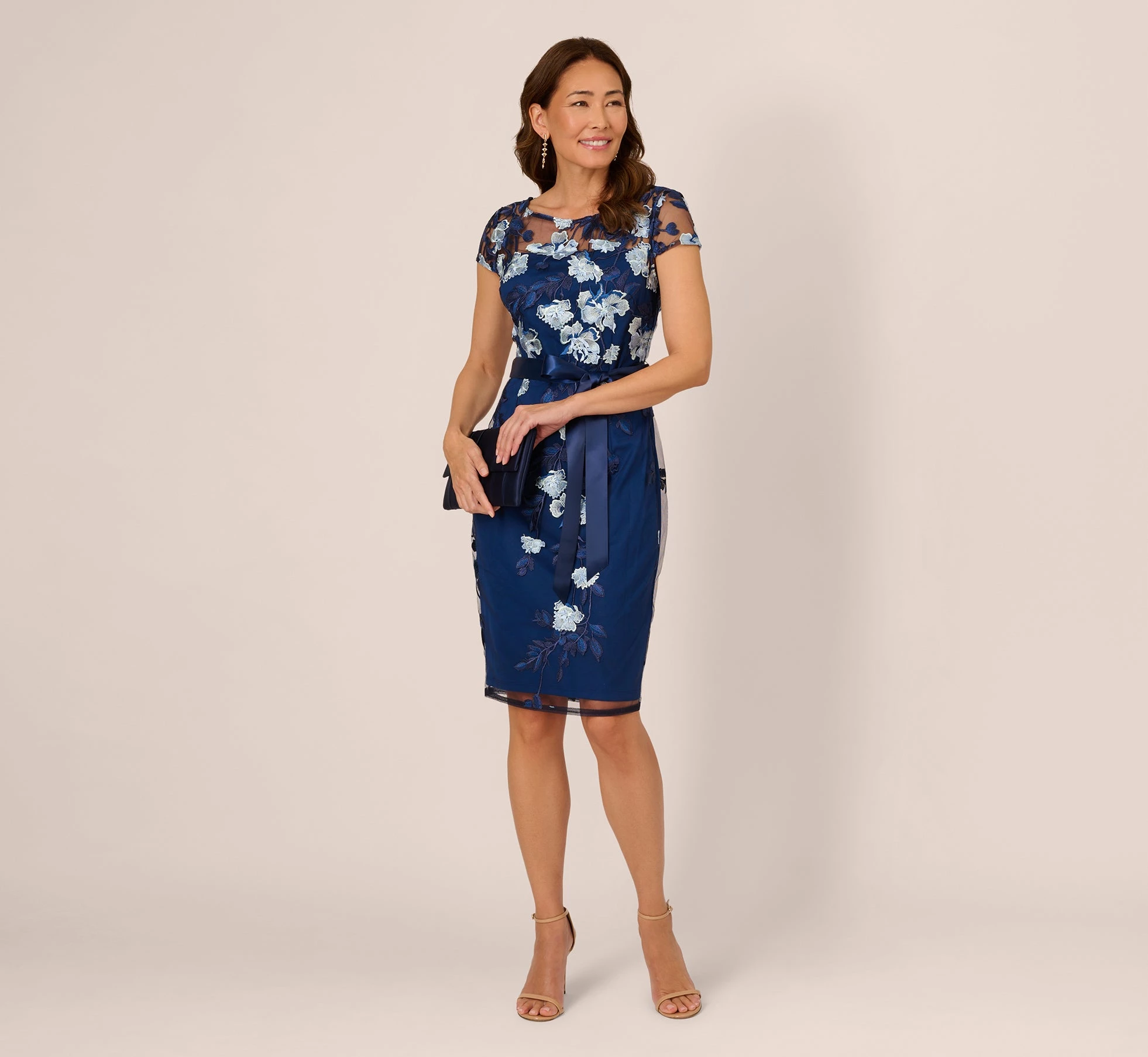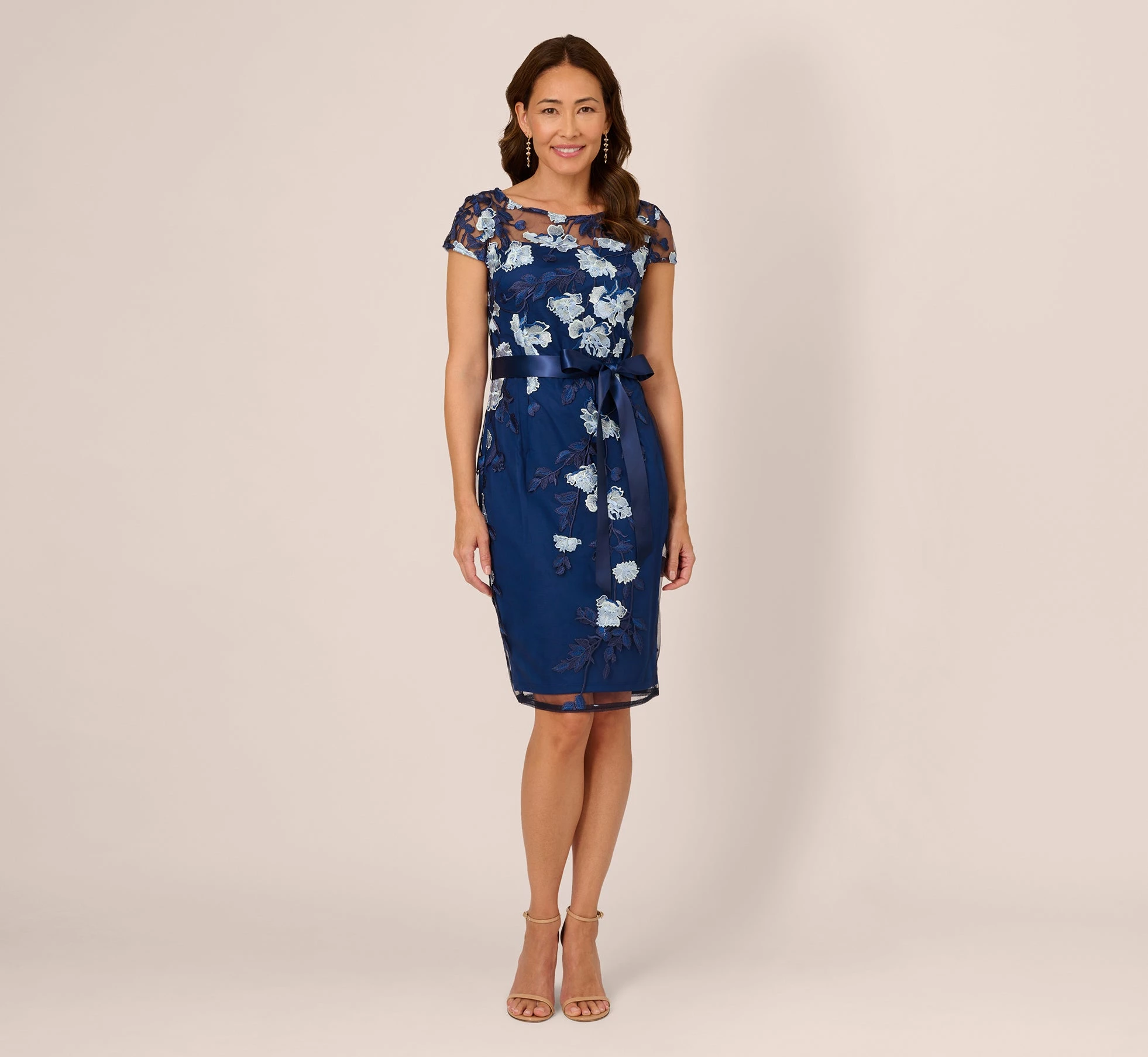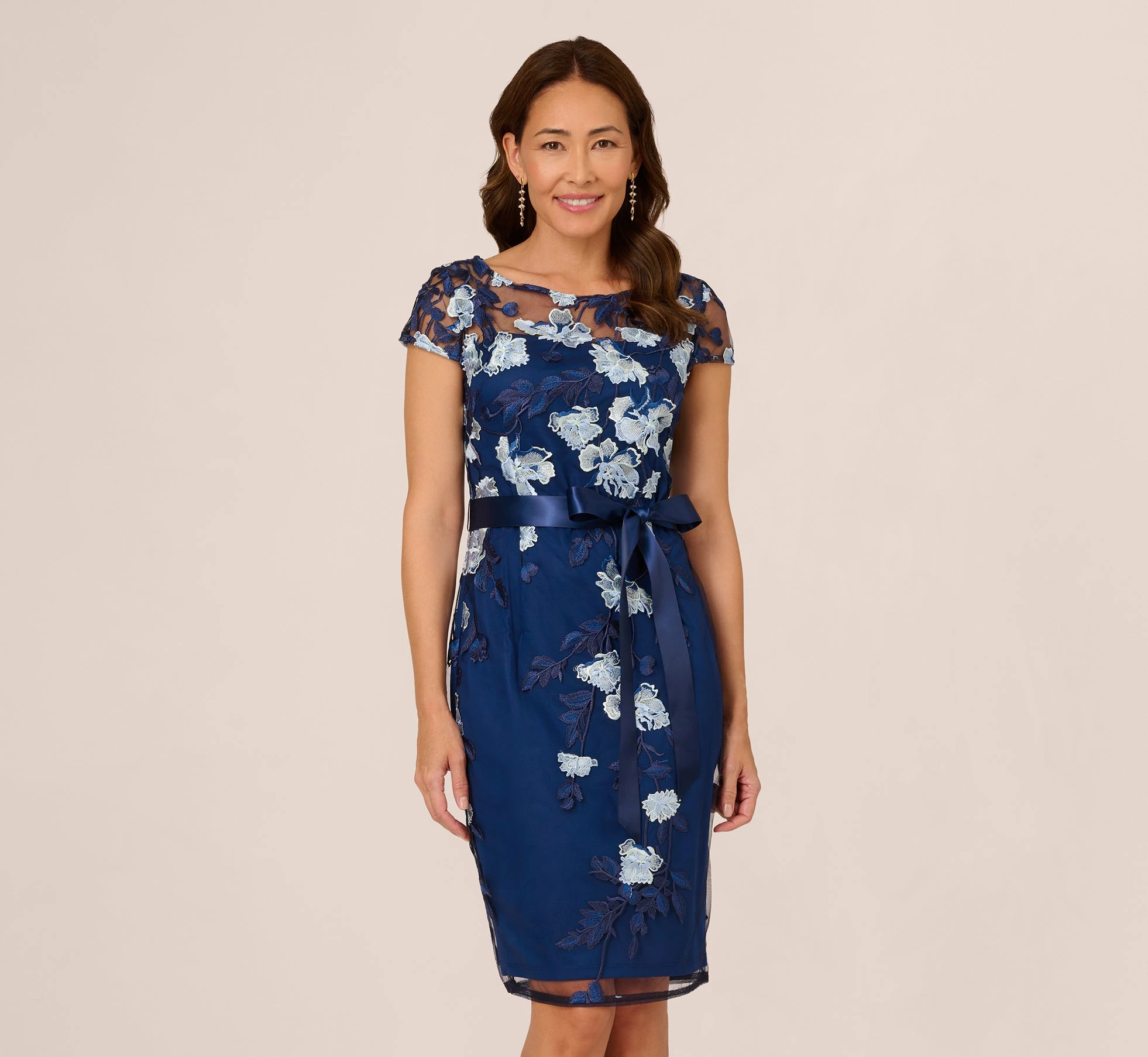 An iconic sheath dress in an elegant, fitted silhouette that skims the figure beautifully, accented with allover floral embroidery, short sleeves and a feminine bateau neckline.