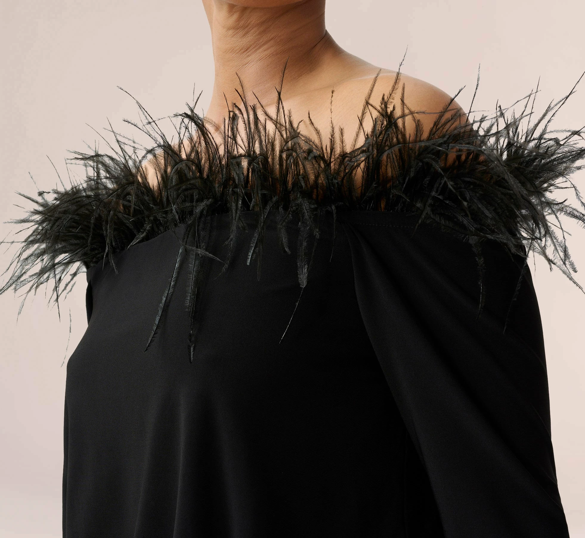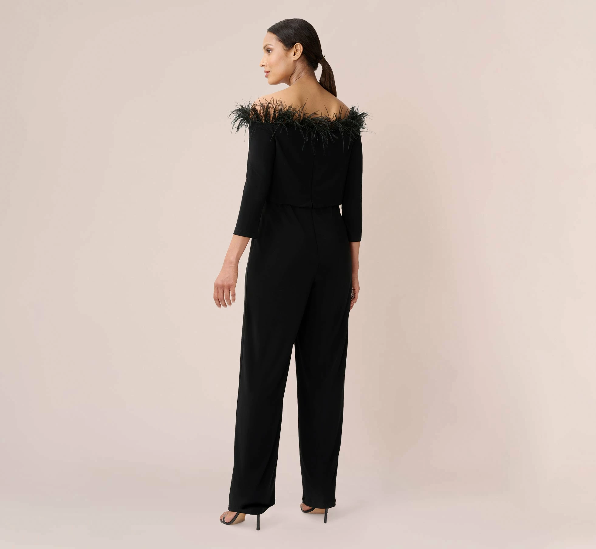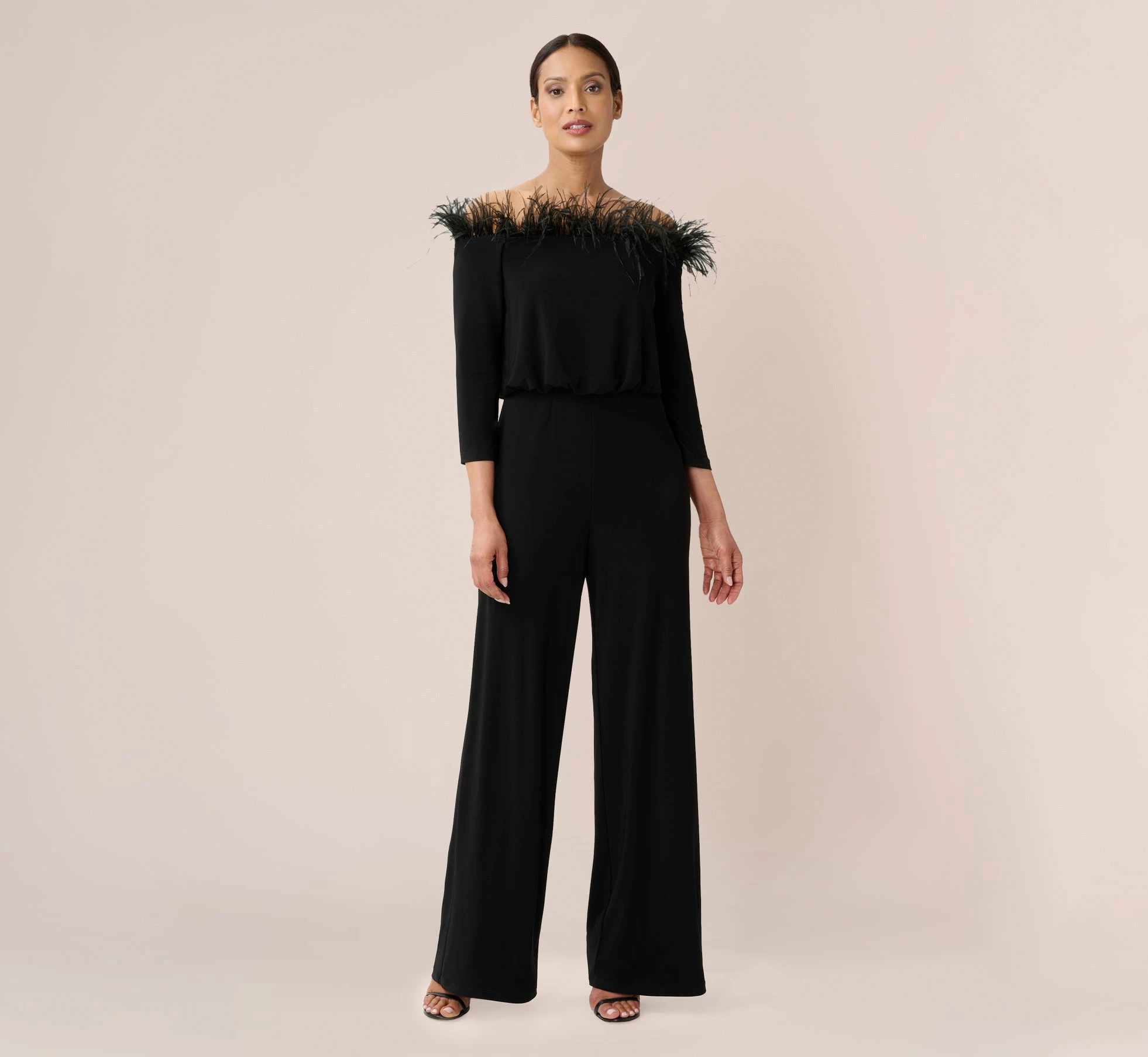 Elegant yet sexy, you’ll make a fashion statement at your next special event in our off-the-shoulder jumpsuit. We’re obsessed with the fluffy feathers that adorn the neckline on this chic one-piece wonder crafted of a luxe stretch jersey fabric. All the details: a flattering blouson silhouette, three-quarter sleeves and wide-leg pants. Back elastic waistband for added comfort and zip closure.