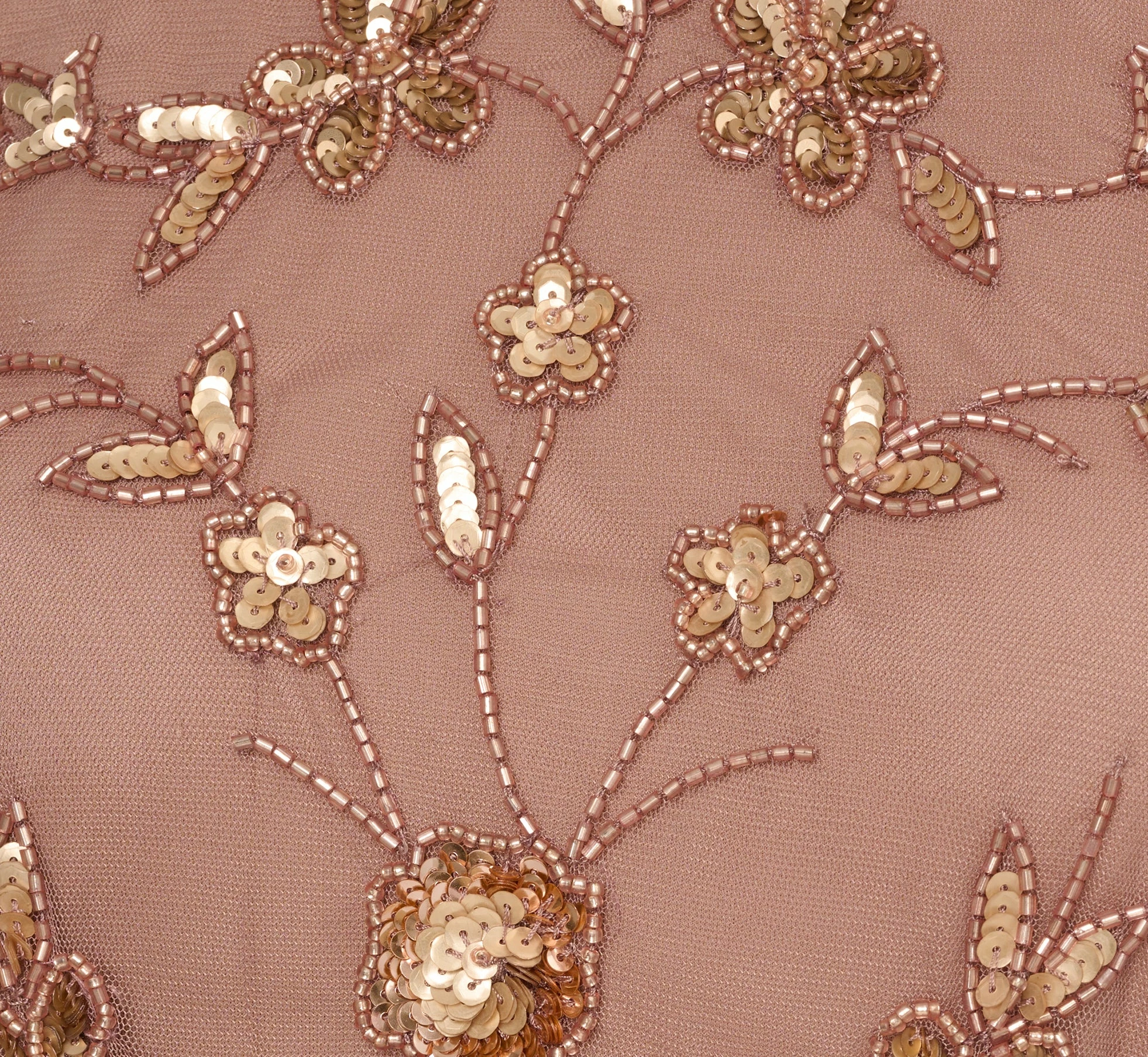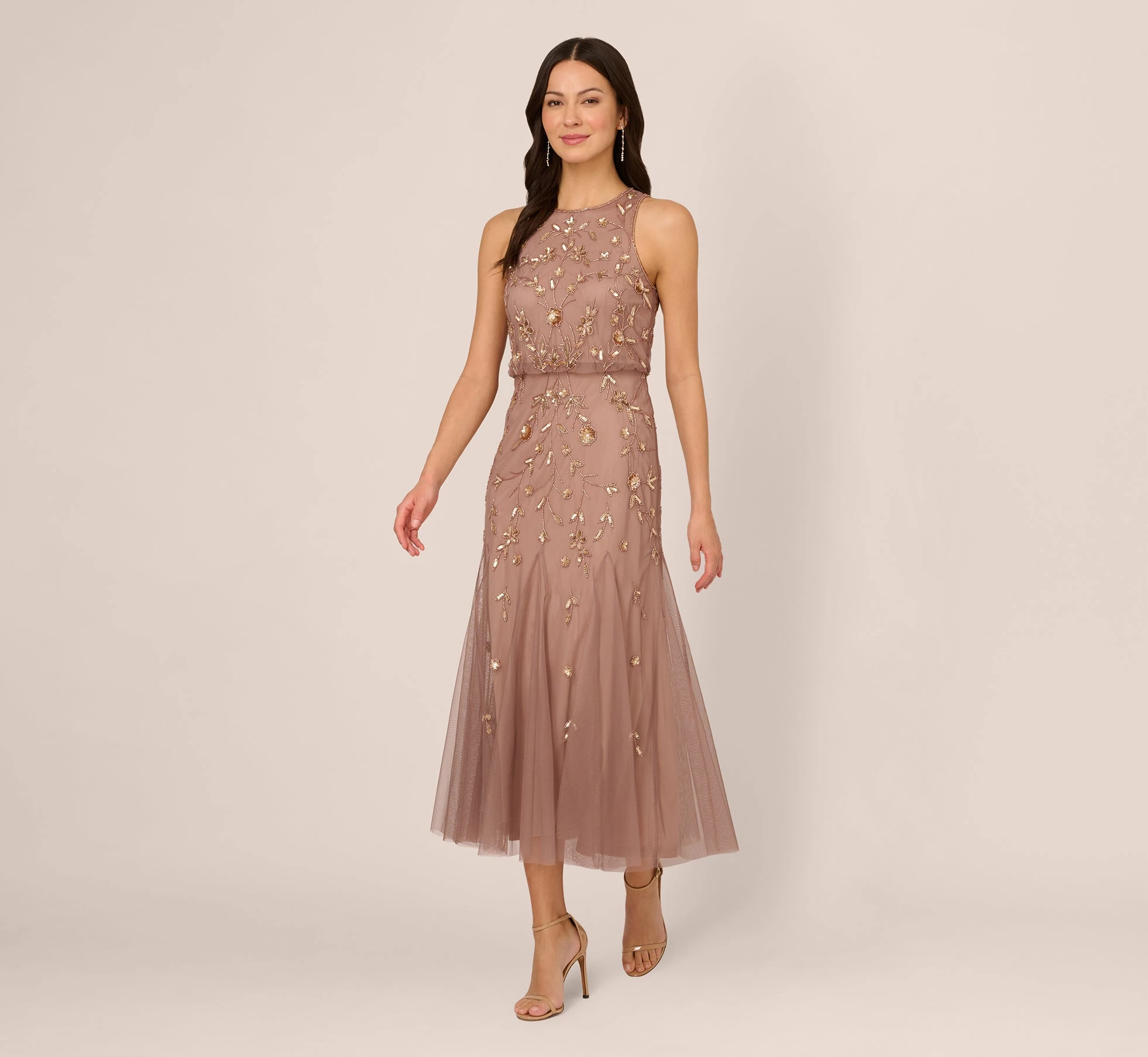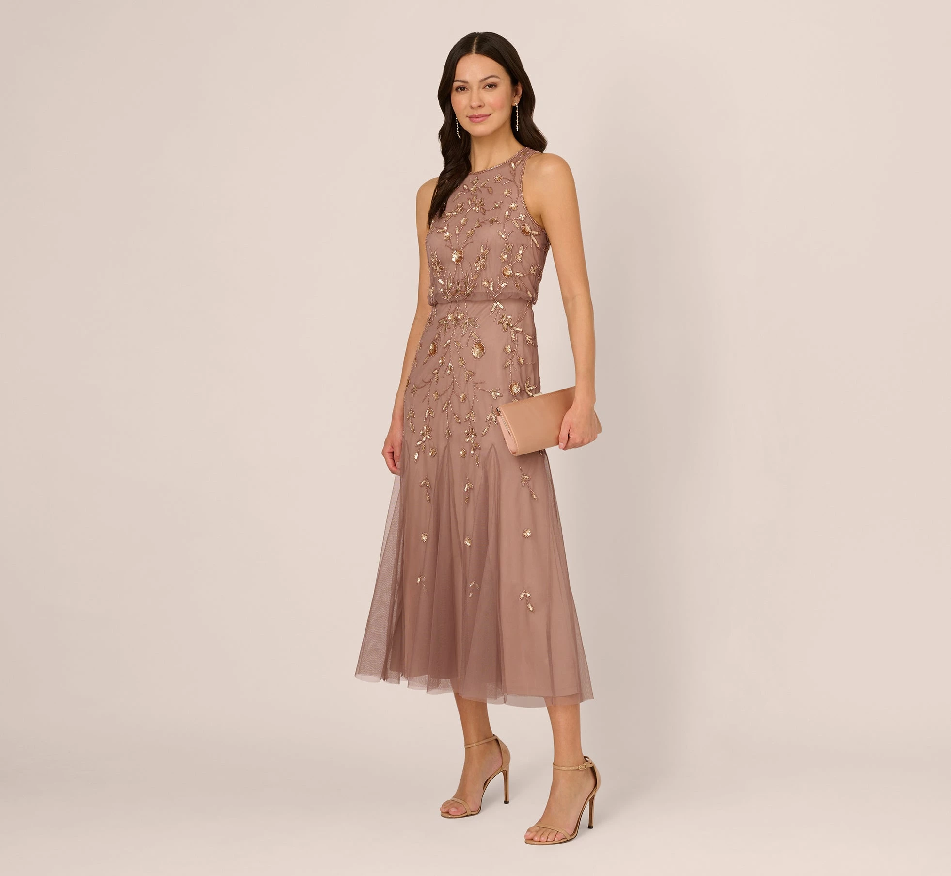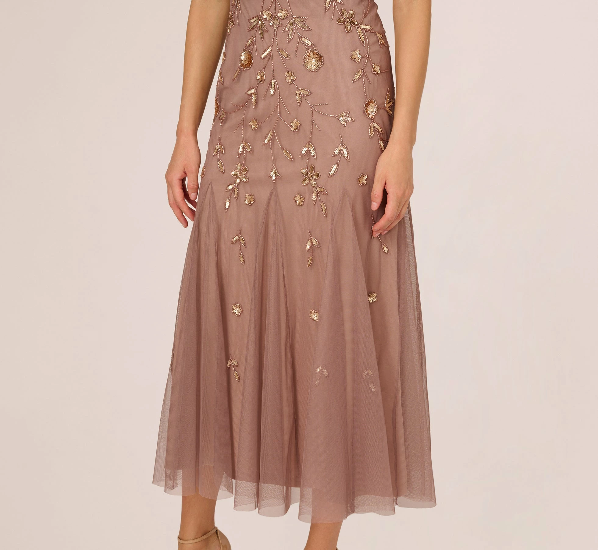 Brilliant blooms take their place on this gorgeous tea-length dress. Featuring a fitted, sleeveless bodice and full skirt, this beaded dress brings the sparkle and romance. Sequins and beads team up into embroidered florals in a mirrored design that flatters the figure. Beading accentsthe hems at the neck and arms. A zipper back closure finishes the design of this floral beaded dress. Complete the look with metallic heels and a S’HUG for added warmth on an evening out.