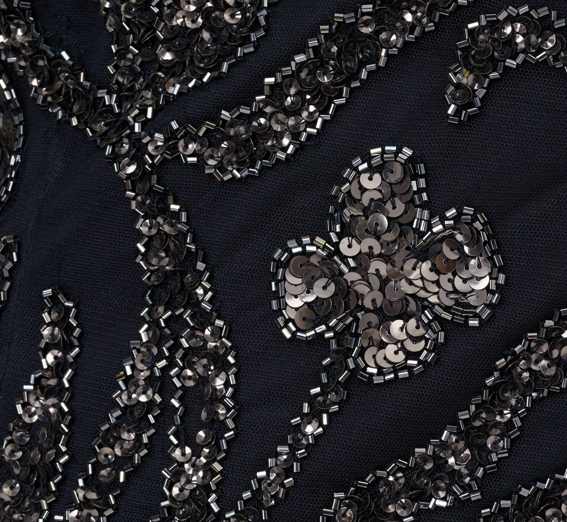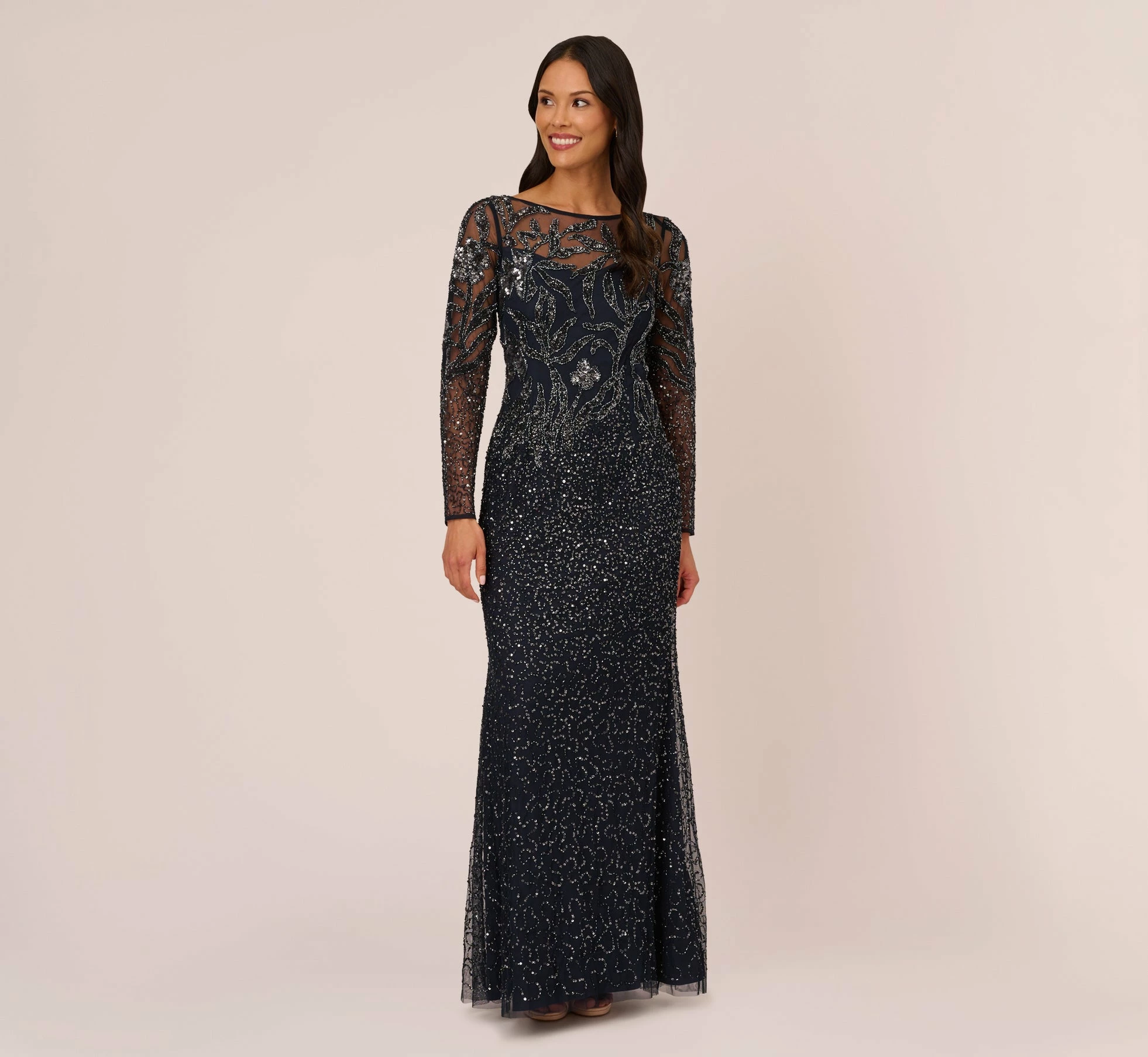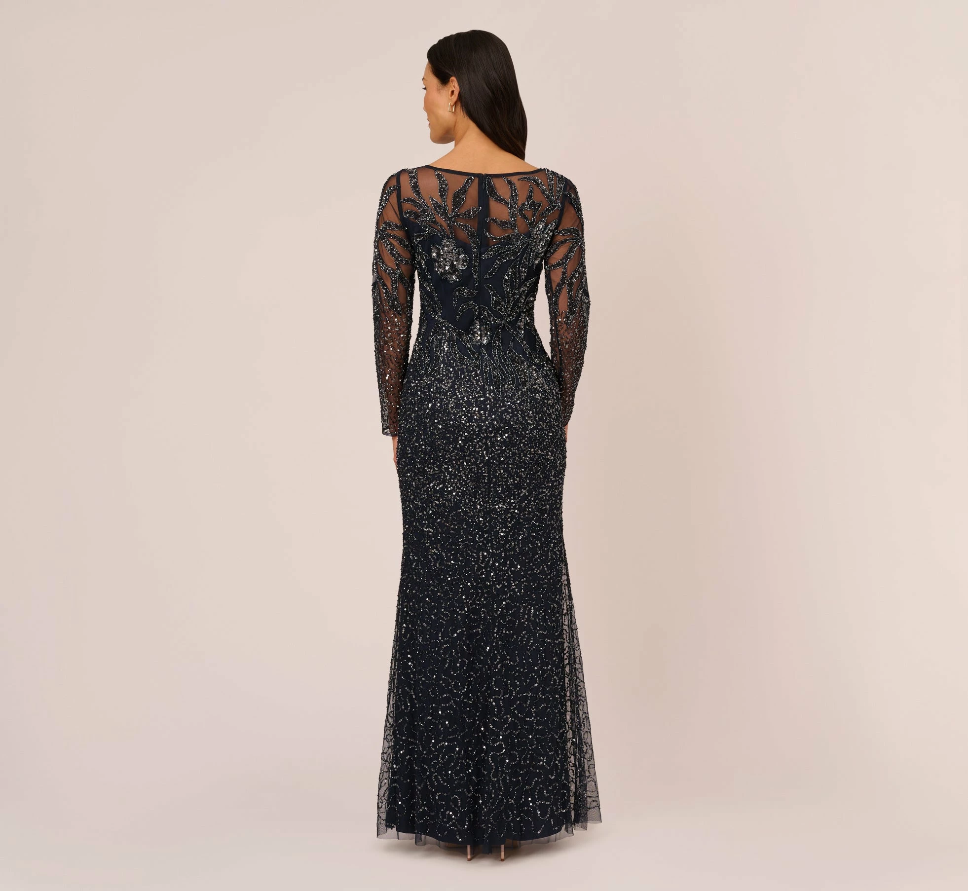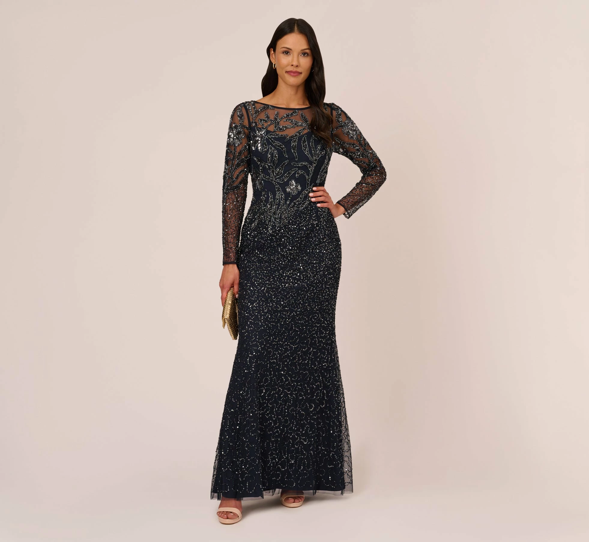 Elegant and irresistibly glamorous, this beaded evening dress is a stellar option for your next special night. This beautiful evening gown features a boat neckline, sheer illusion detailing at the neck and back, and an exquisite beaded bodice. Elegant sheer long sleeves add a sophisticated touch to this formal dress. Stunning sequins in a floral pattern adorn this beaded gown, which also includes a mermaid skirt with a slim sweep. Sleek back zip closure. Pair it with metallic heels and a matching clutch to let this jaw-dropping gown really shine.