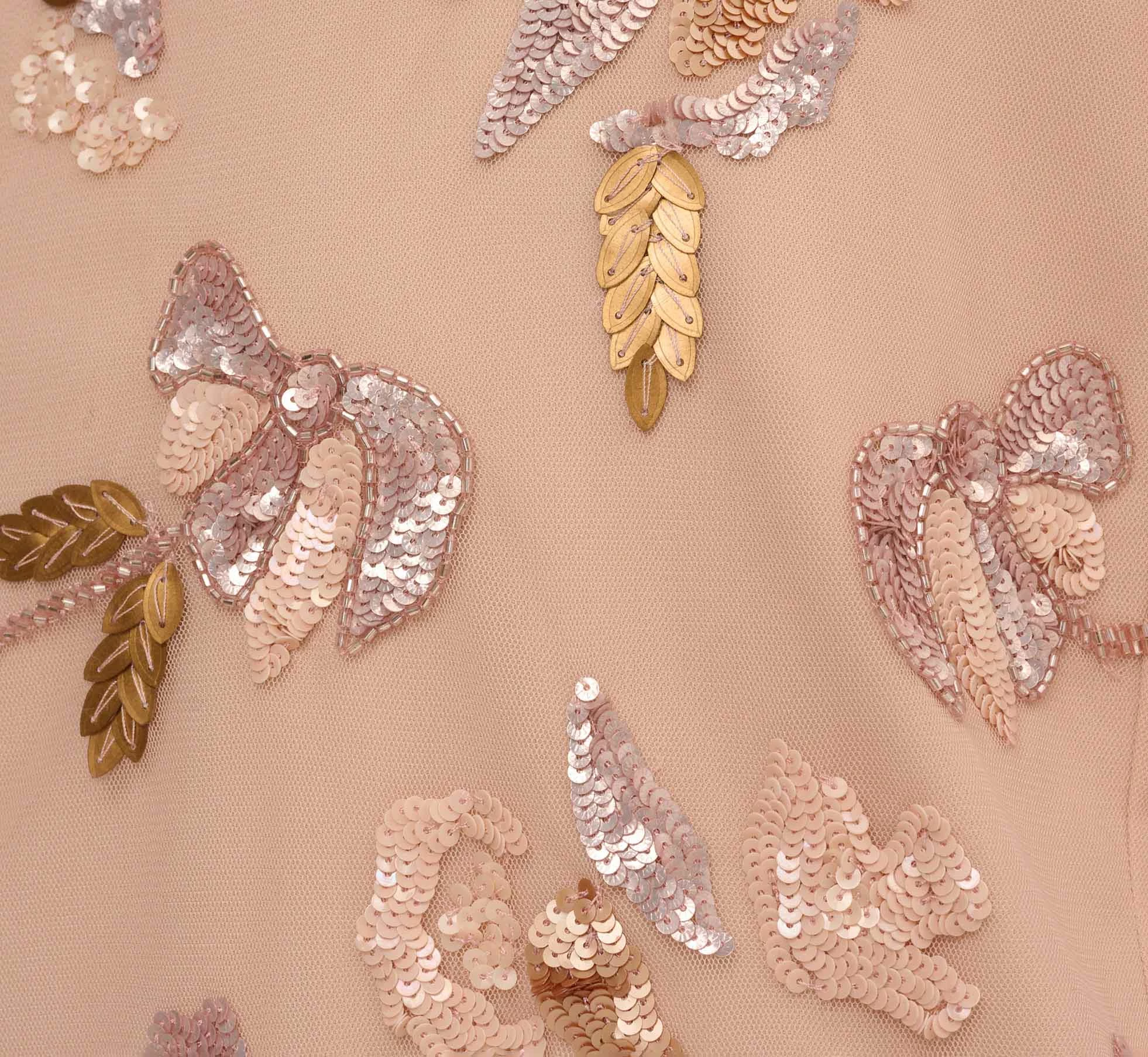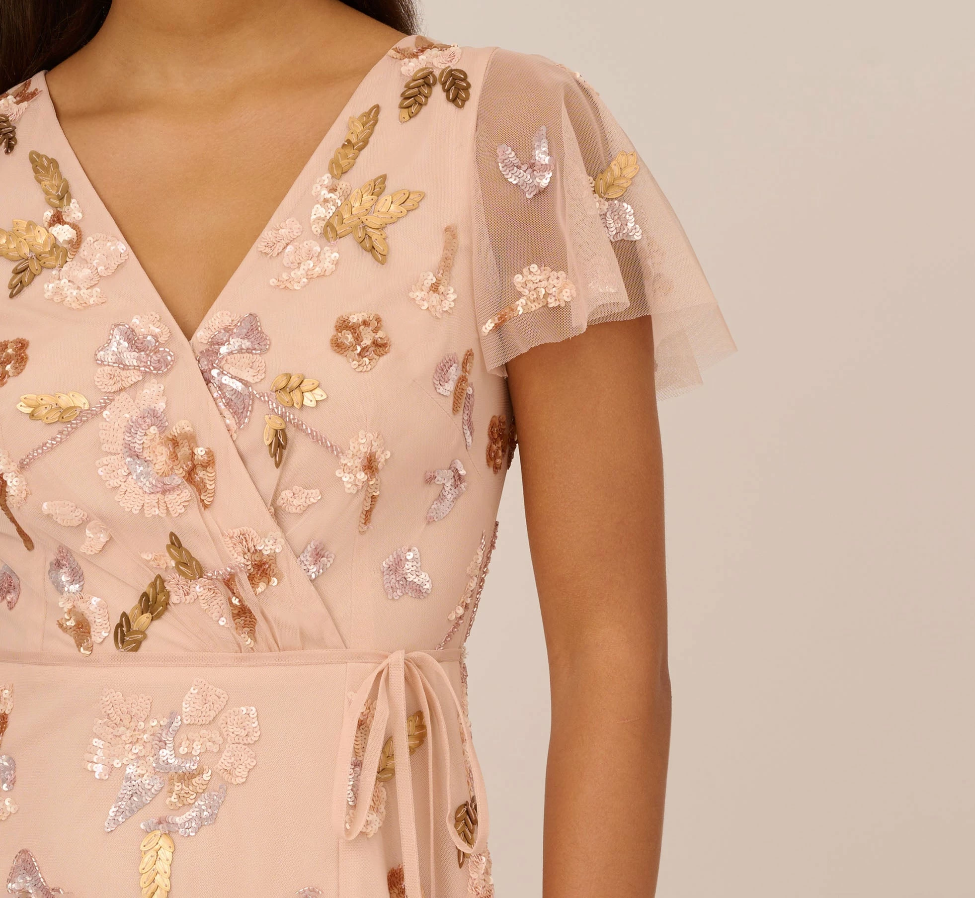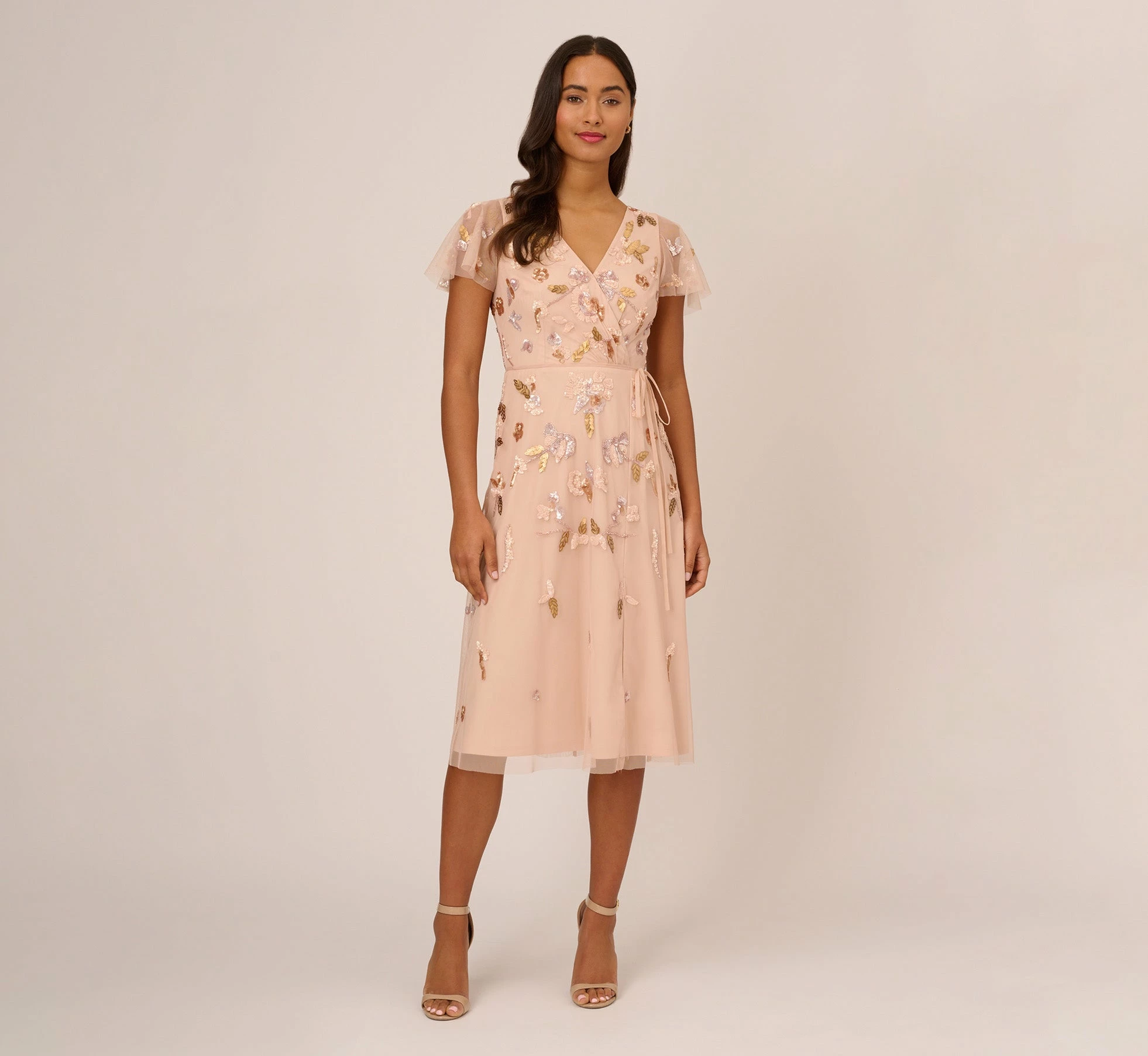 A beloved silhouette gets formal in this gorgeous beaded dress. This cocktail dress features a fitted surplice bodice with v-neckline and a faux tie accent at the waist that creates a wrap dress look. Sheer, short flutter sleeves and a midi skirt add a sweet touch to this party dress. Fully lined through the body, this dress’s mesh overlay is adorned with romantic sequin beading that perfectly complements the dress color. A simple pair of heels and a satin clutch is all this dress needs for a night out.