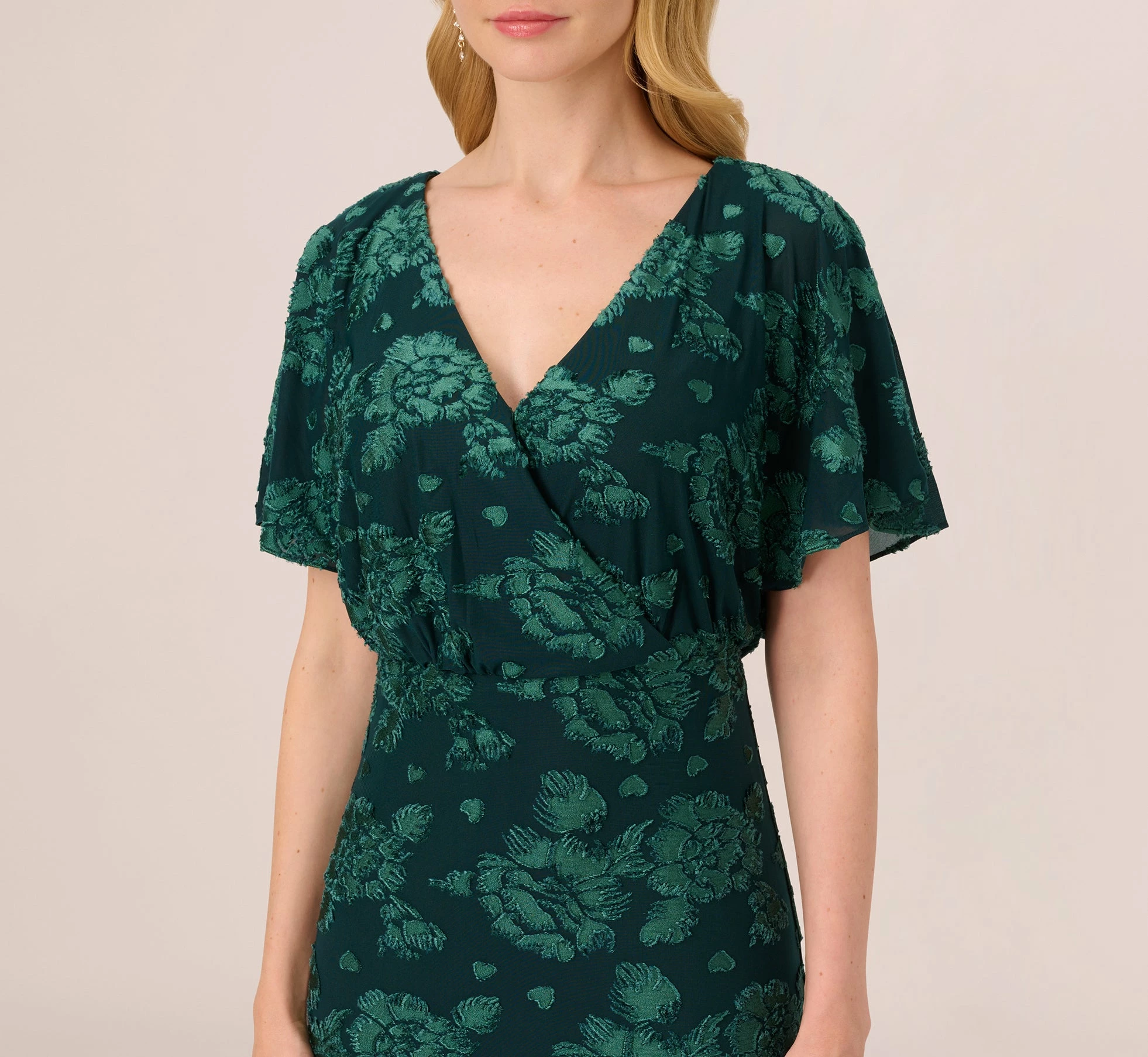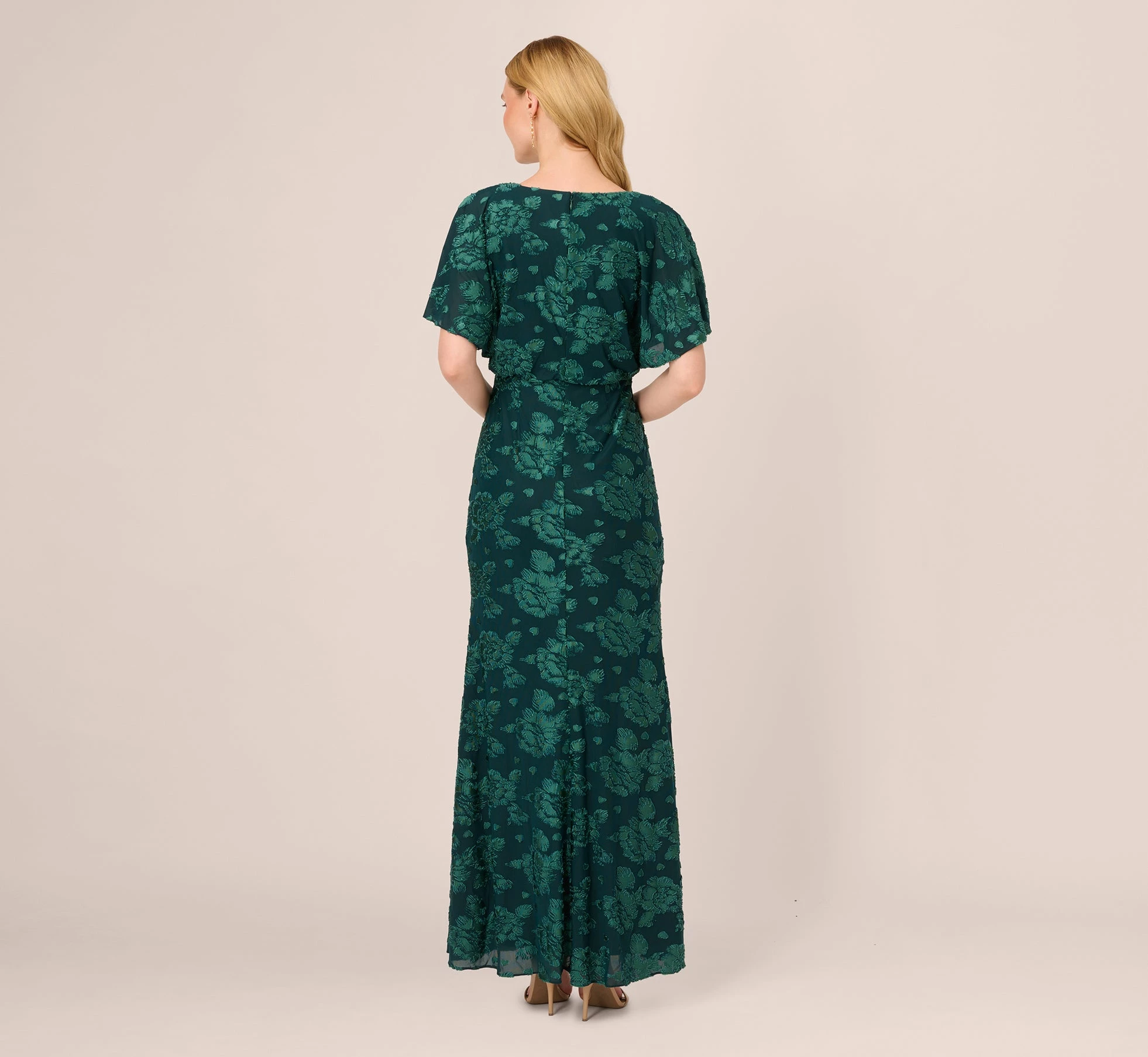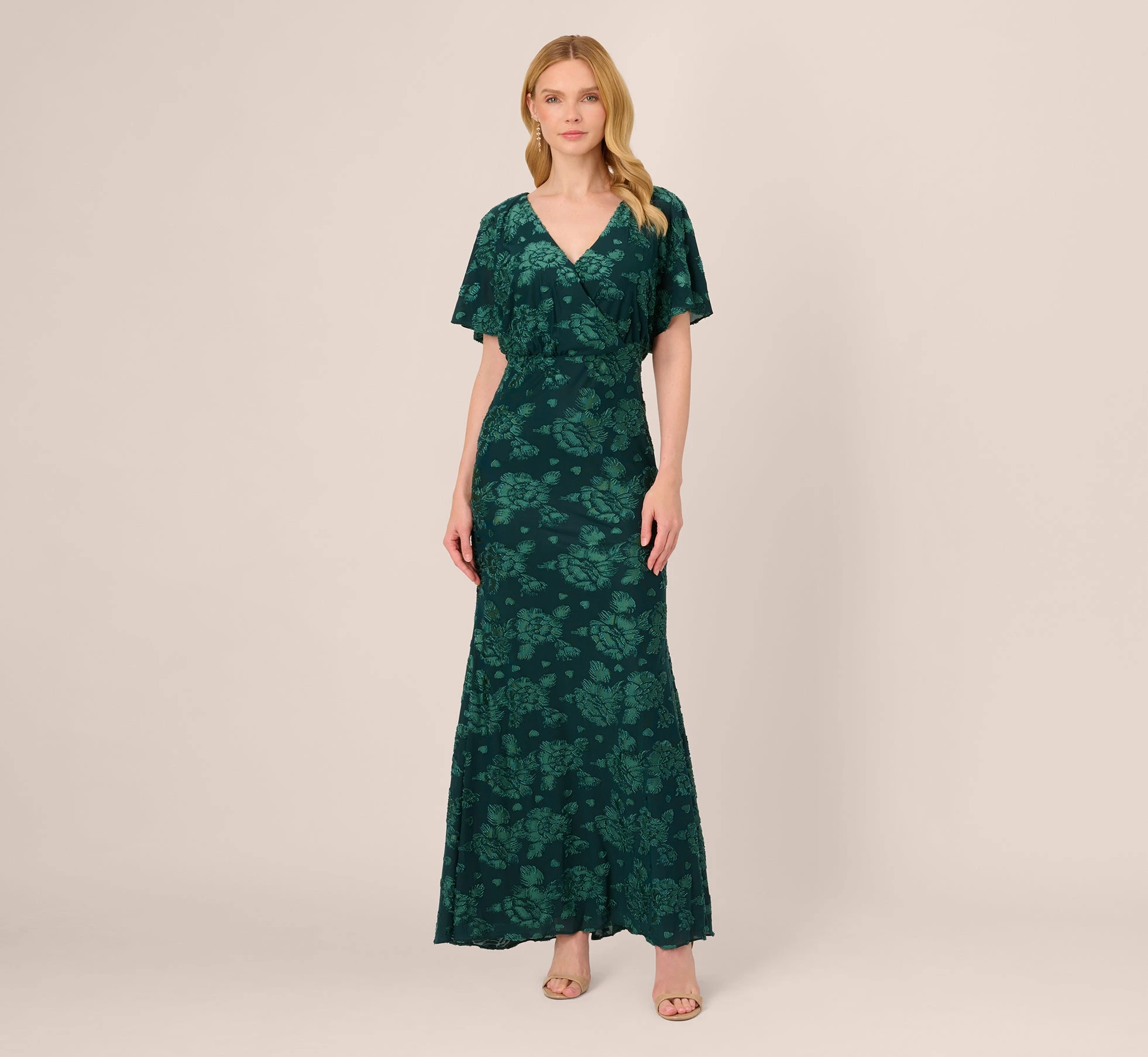 All your special occasions will be spent looking effortlessly chic when wearing our long gown, crafted of a beautifully textured burnout stretch velvet in a floral pattern. You’ll strike a stunning figure, thanks to our iconic (and flattering) blouson silhouette. All the details: surplice neckline, floaty flutter sleeves and pleating at the knees for added movement and sway.