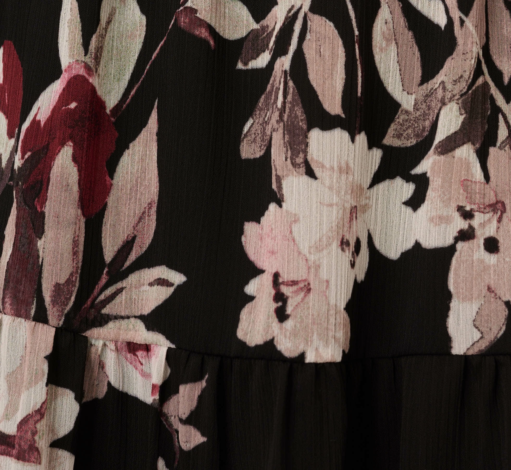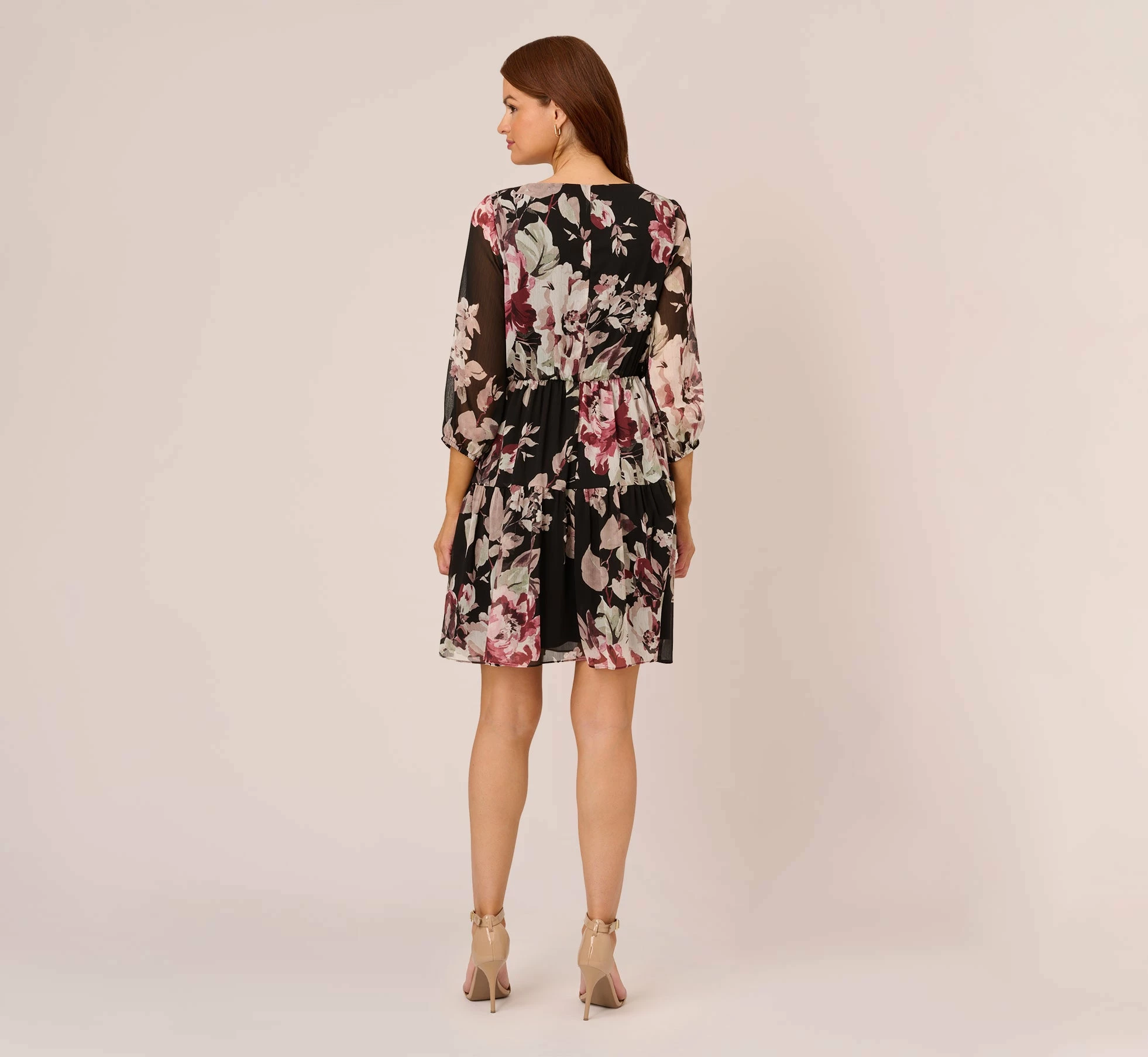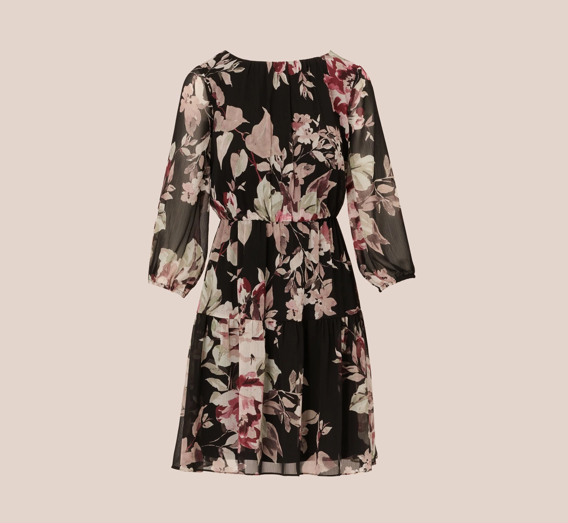 Effortless and comfortable, this three quarter sleeve dress is a beautiful look no matter the season. This floral dress features a fitted bodice with boat neckline and soft skirt. The three quarter length bishop sleeves are sheer and flowing. This cute dress is crafted from floral printed chiffon fabric and has an elastic waist for a comfortable fit for all body types. The soft skirt has a tiered design adding a final romantic touch to this pull-on dress. Perfect for a day at the office or a date night out, this chiffon dress is a pretty look.