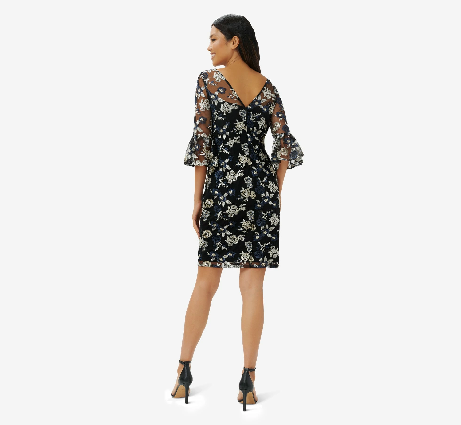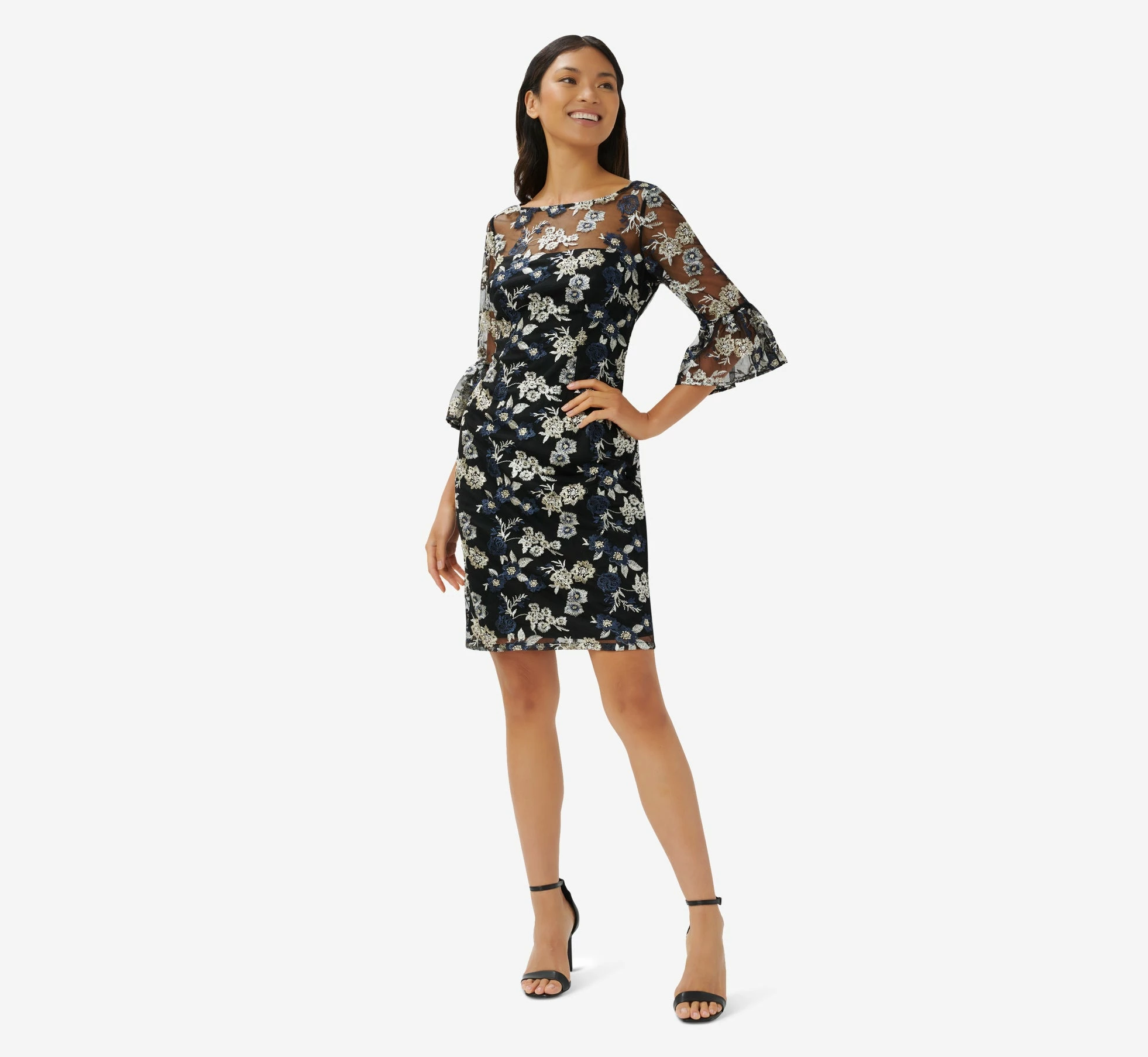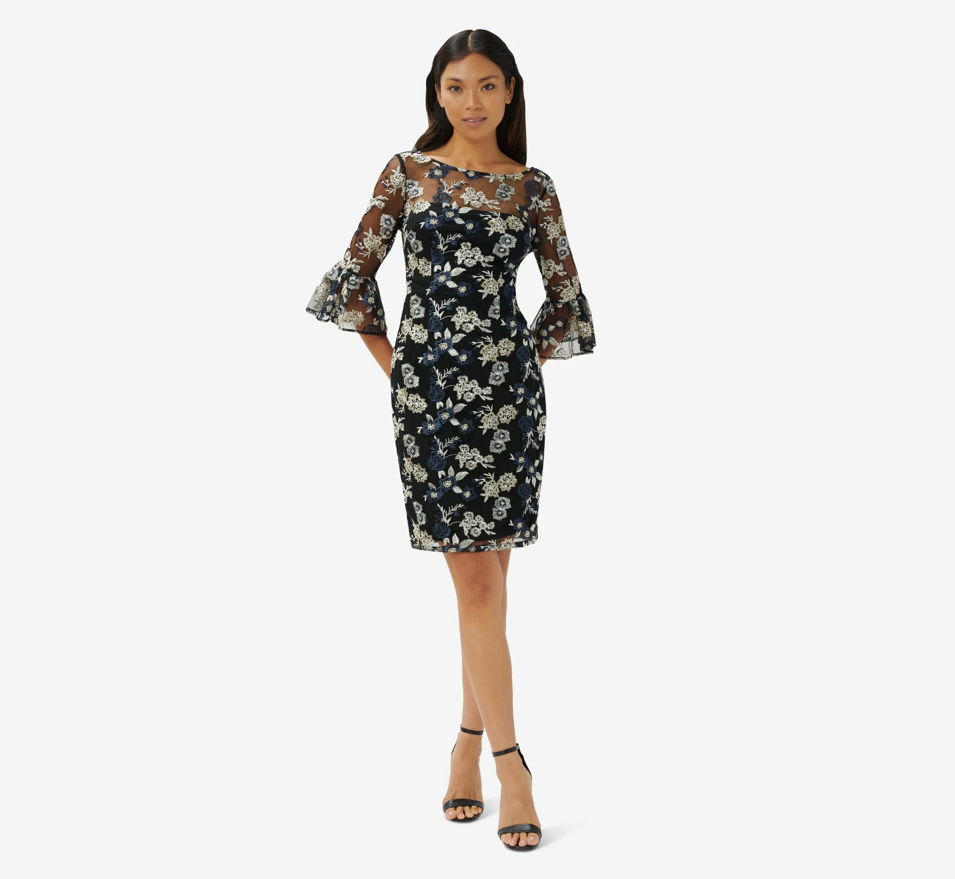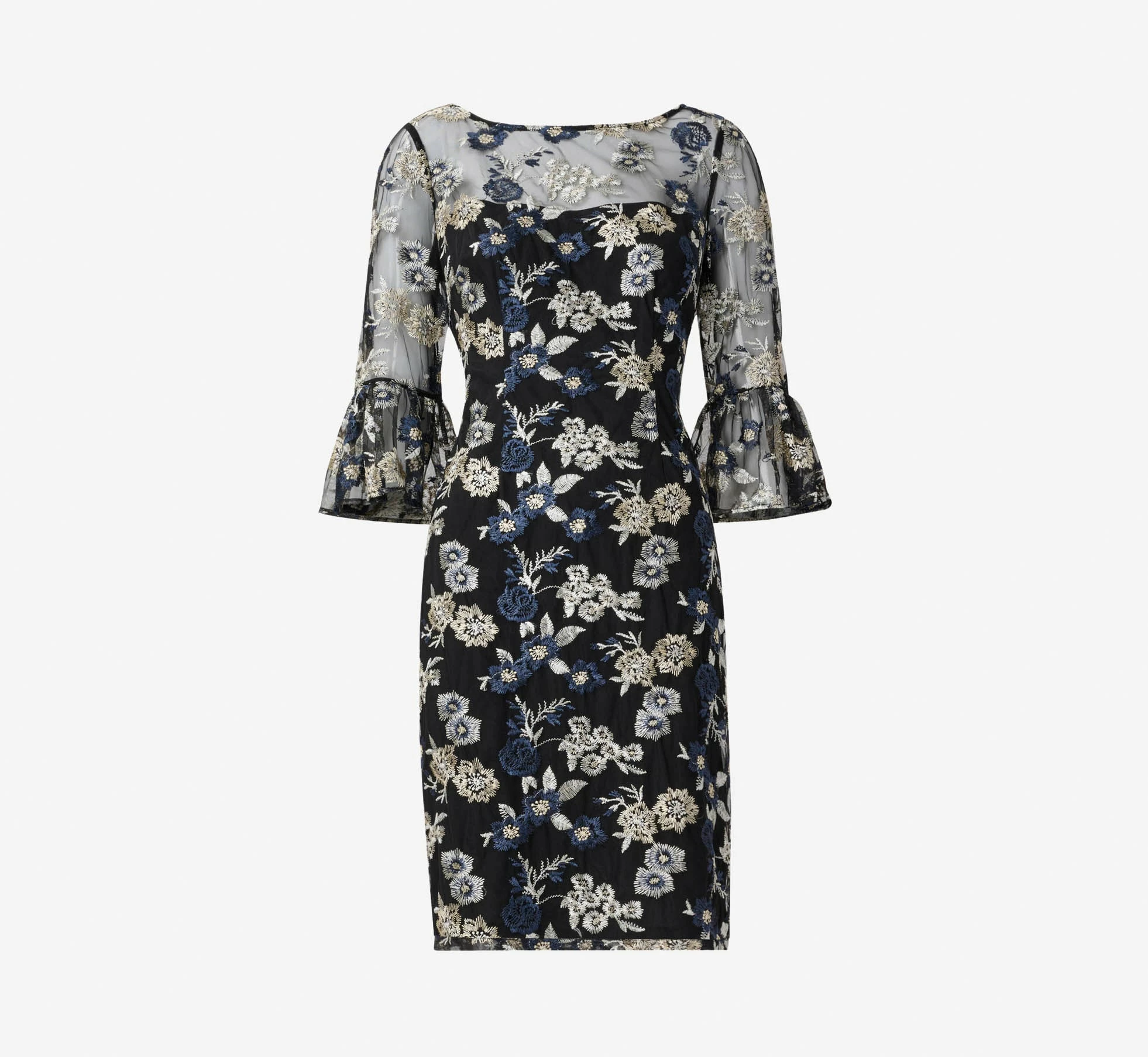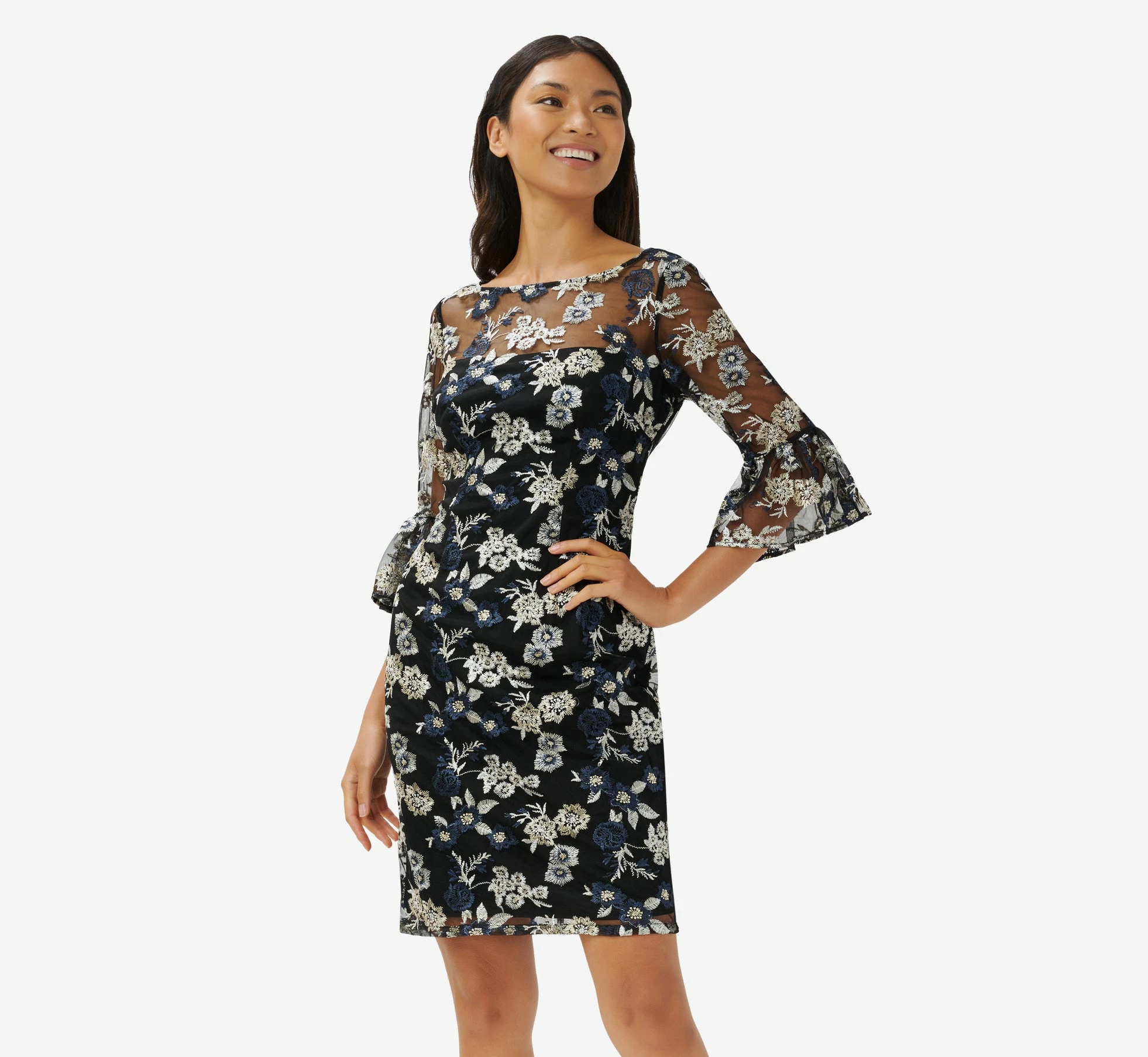 Our distinctly feminine sheath dress is blooming with a pretty mix of florals on a knit mesh overlay and is a perfect choice for a night out. We’re loving the sheer illusion yoke, modern bateau neckline and elbow sleeves with bell cuffs. Flirty v-back. Finished with a back hook-and-eye/zip closure. A definite best dressed guest option at wedding receptions and black-tie galas.