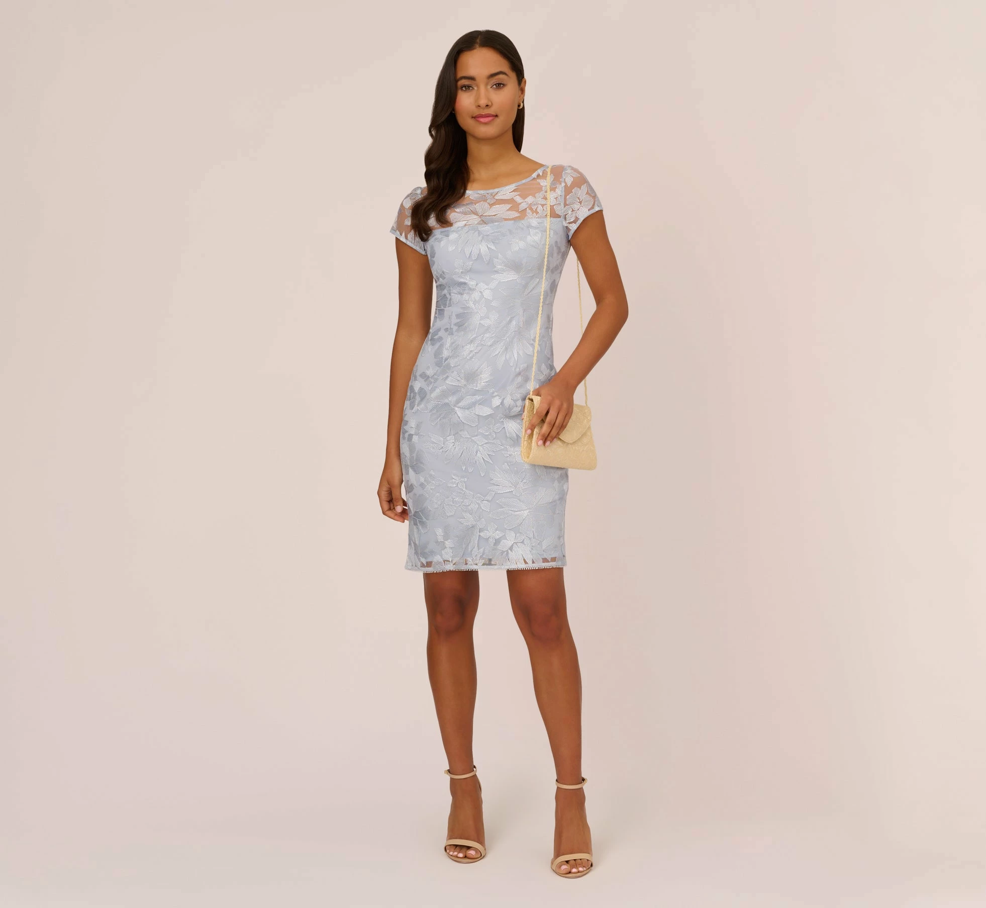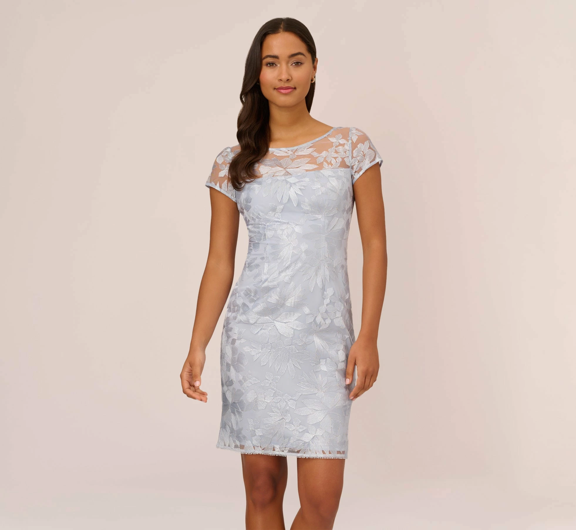 Wherever you’re going in this fitted dress, you are sure to shine. This sheath dress features a sheer boat neckline, sheer short sleeves, and a keyhole back with hook and eye closure. The sheer mesh fabric has subtle shine and is embroidered with beautiful floral details. The keyholeback is embellished by lace trim. A zipper closure completes this embroidered floral dress. Dressed up with bold jewelry and heels or dressed down for a day time event, this short sleeve dress is a classic look for any occasion.