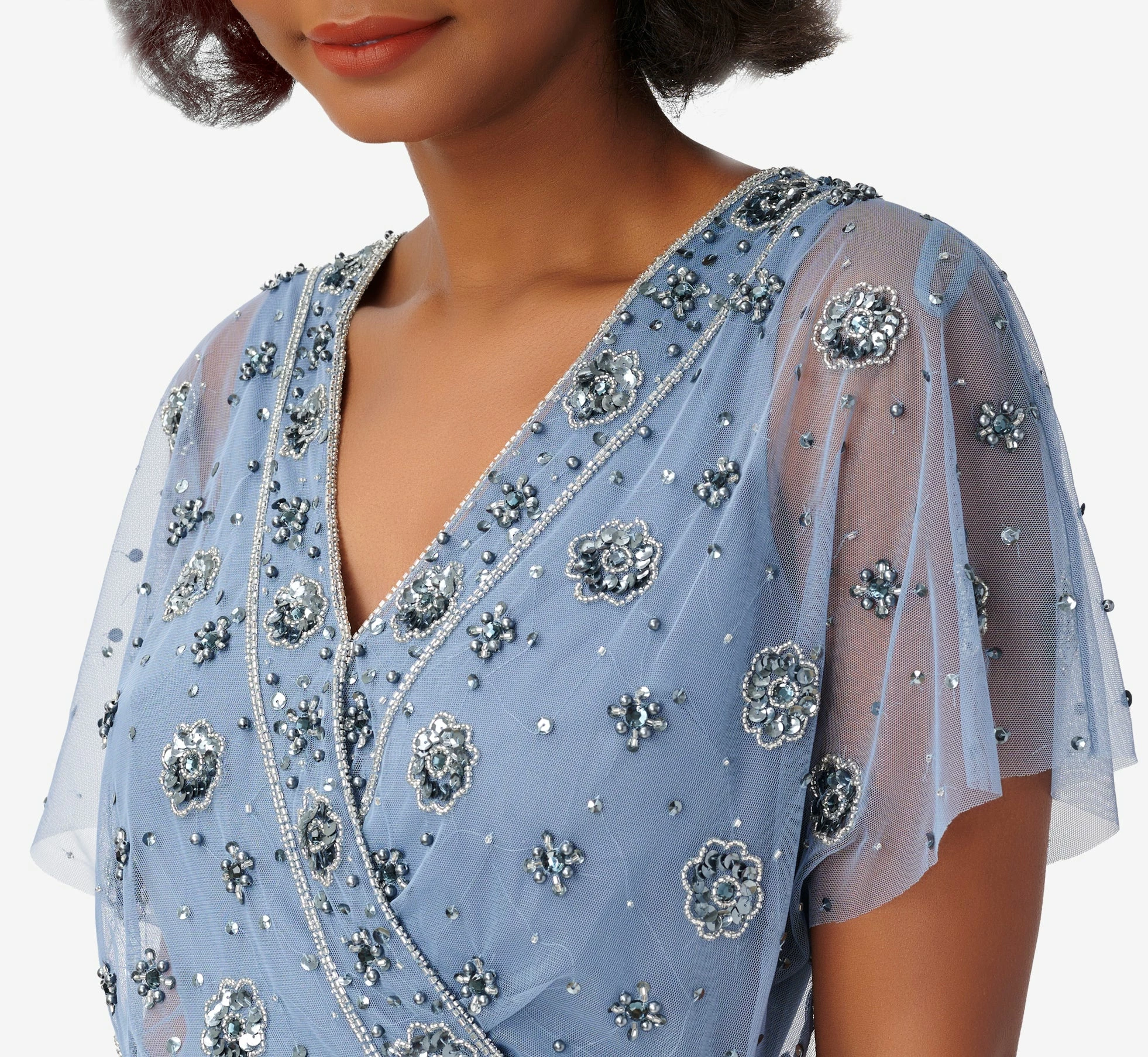 Fresh and feminine, our signature blouson dress gets updated in a versatile ankle length that looks amazing on everyone. We’re loving the distinctive and sparkling handsewn beadwork in a trend-right floral pattern. All the chic details: the flattering surplice neckline, the sheer illusion flutter sleeves and gentle pleating on the soft skirt for added movement and sway. Sleek back zip closure. An easy add-to-cart for all of your upcoming special occasions.