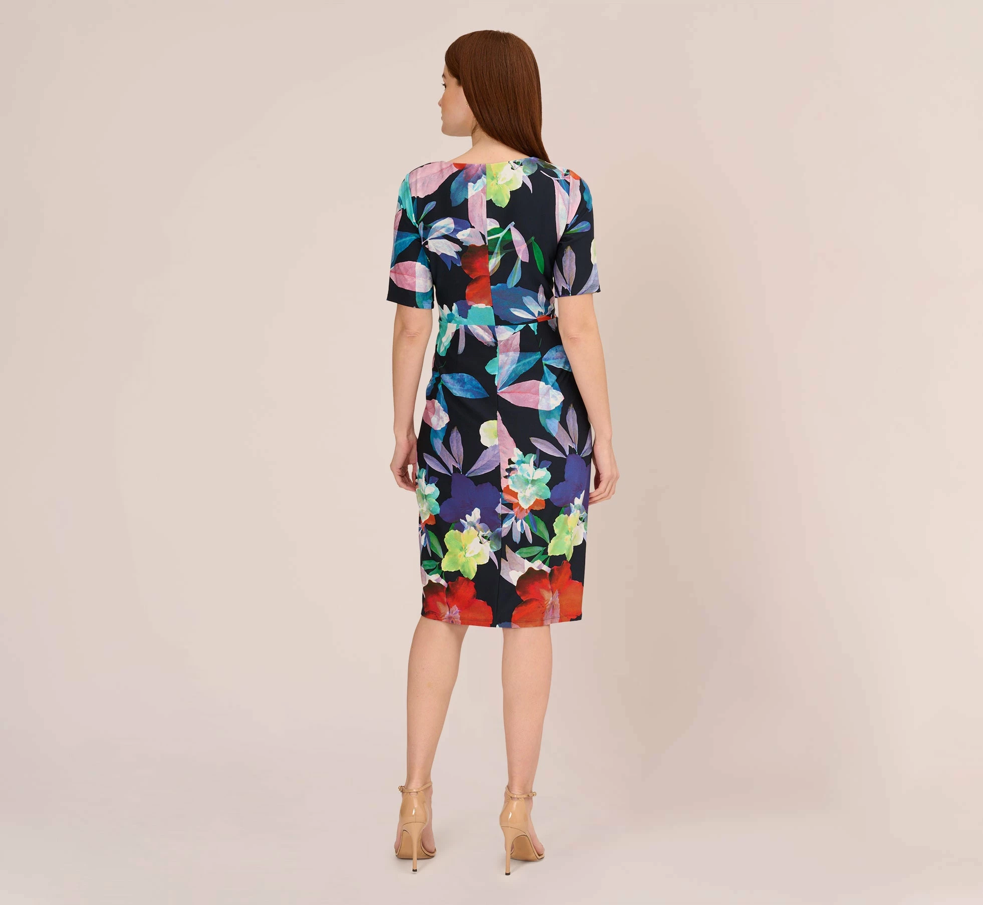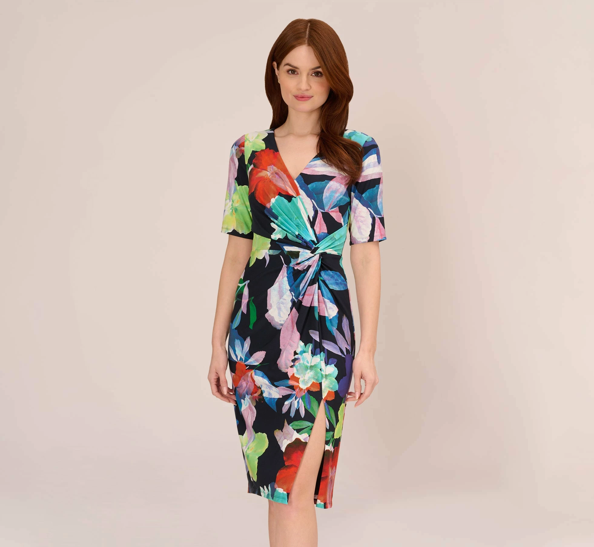 Stunning watercolor florals brighten this classic day-to-night dress. This short dress features a surplice bodice with short sleeves and v-neckline, a shift silhouette and a knotted detail at the waist that creates a beautiful draped look. Designed with floral printed jersey fabric, this dress has a comfortable level of stretch making it the perfect choice for a busy day. A zipper closure completes this sheath dress. Styled for day with a neutral heel and a S’HUG or dressed up for cocktail hour, this floral print dress is an effortless look.