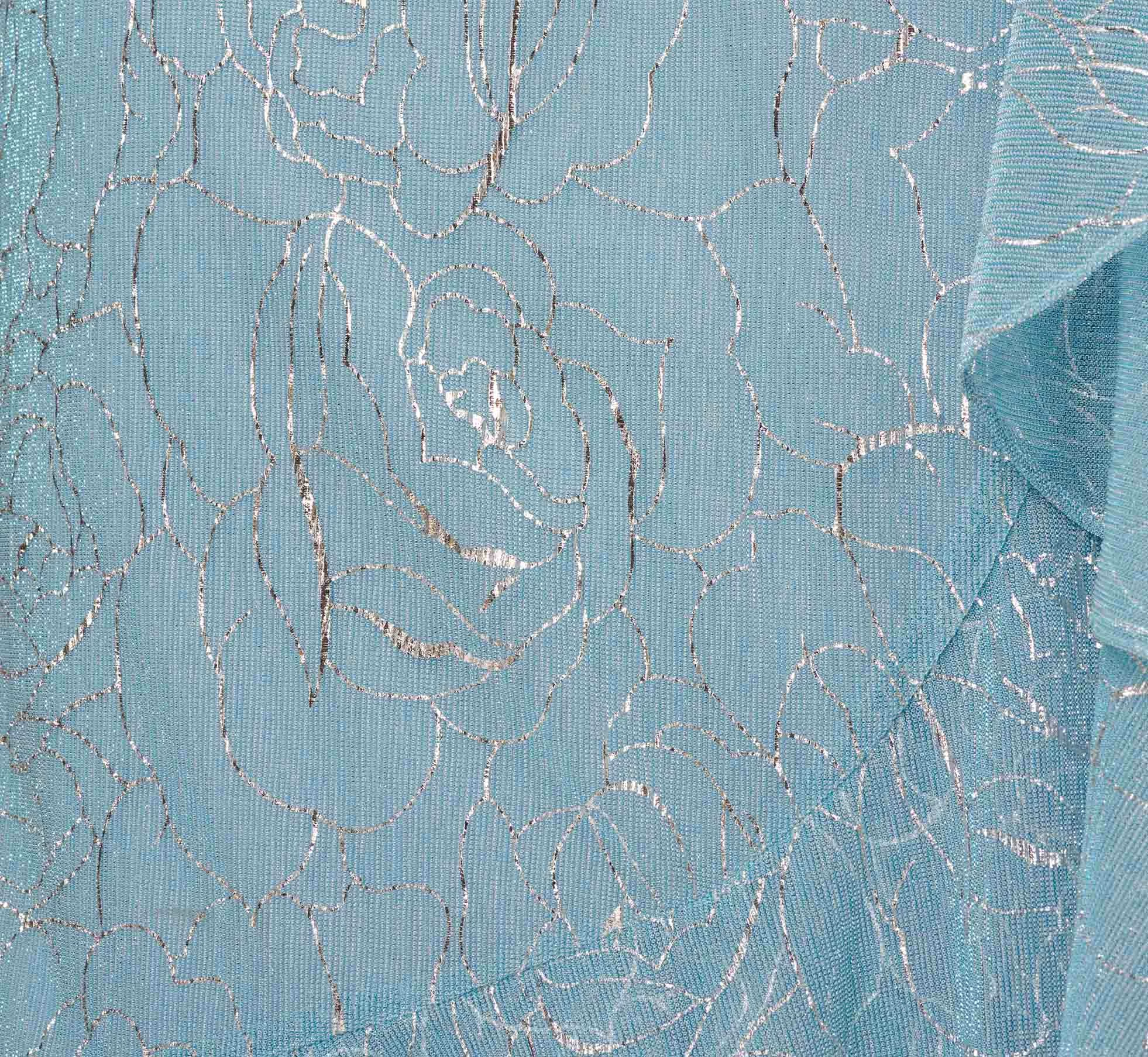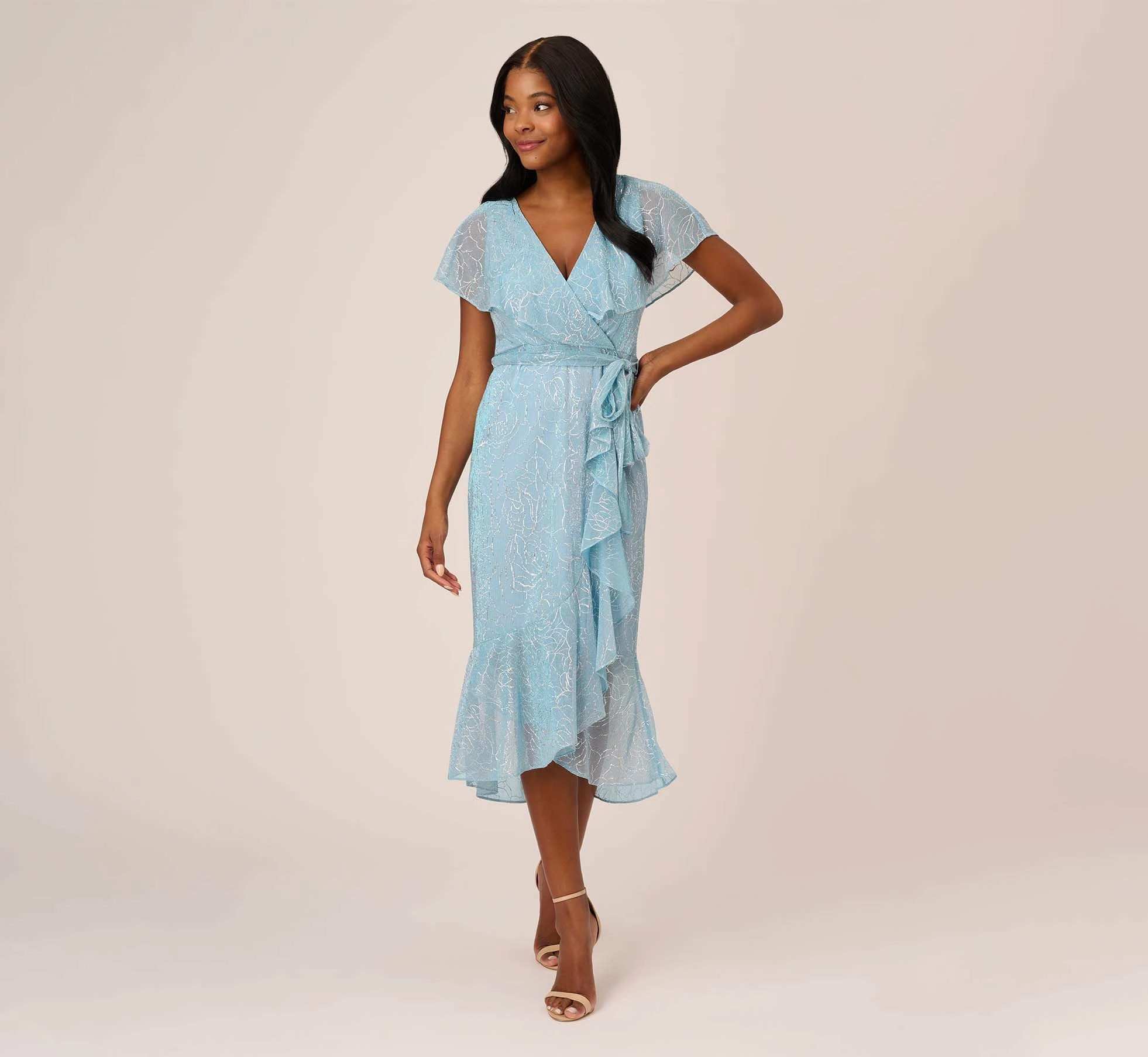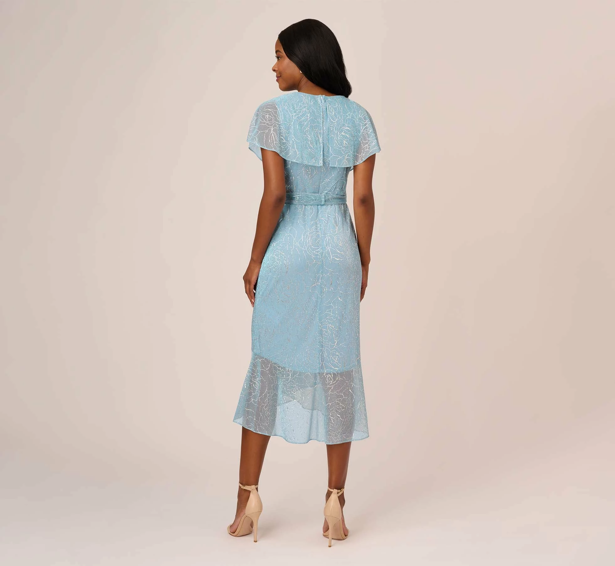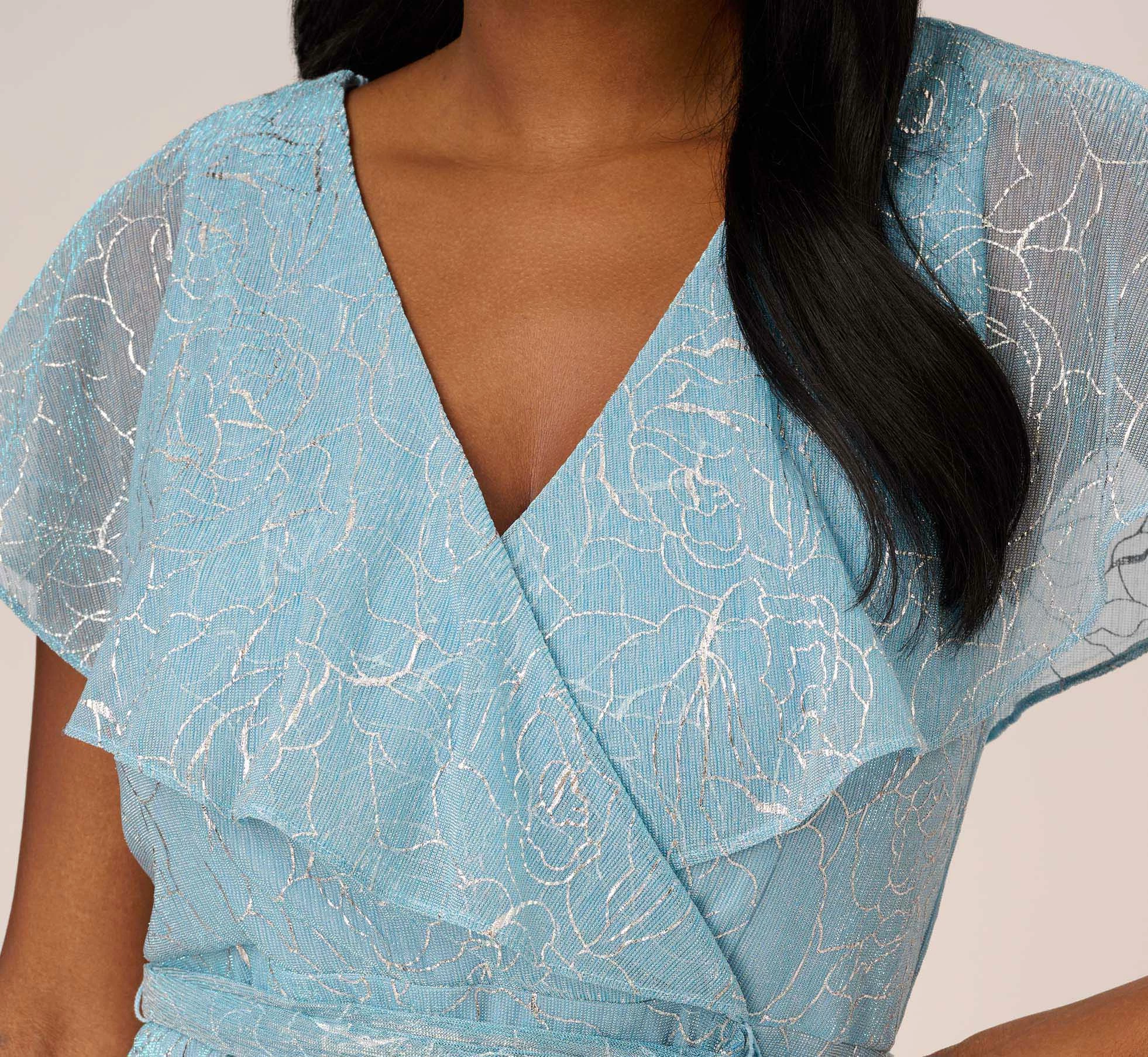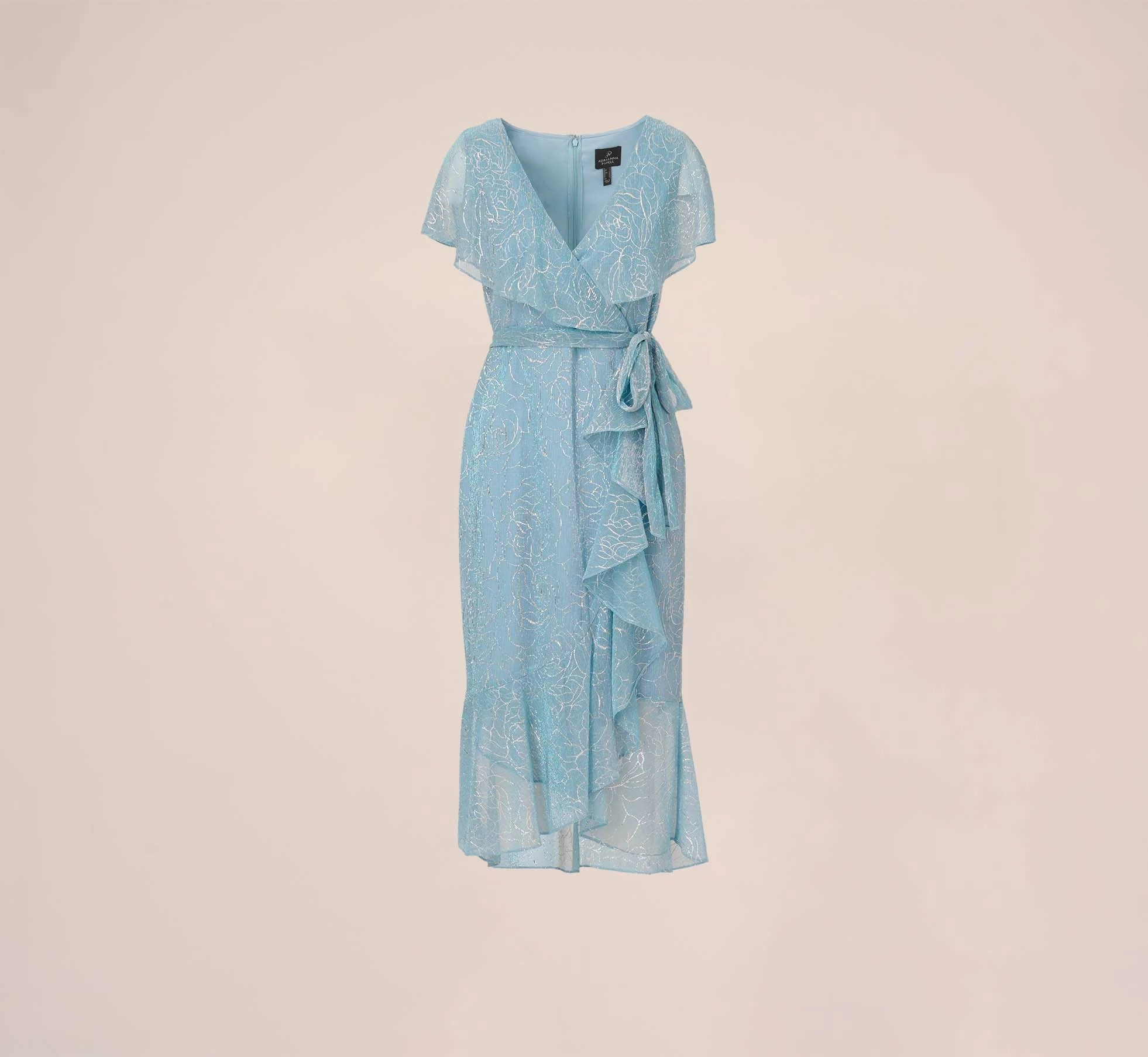 A striking metallic foil floral print gives a feminine spin to this mermaid dress crafted of a lightweight crinkled mesh. This charming dress features a ruffled capelet and a surplice neckline that descends to a midi skirt with playful cascading ruffle accent and ruffled hem. Finished with a self-tie belt to accentuate your waist. Back zipper with hook and eye closure. A versatile style to keep on rotation for bridal showers, engagement parties and wedding receptions.