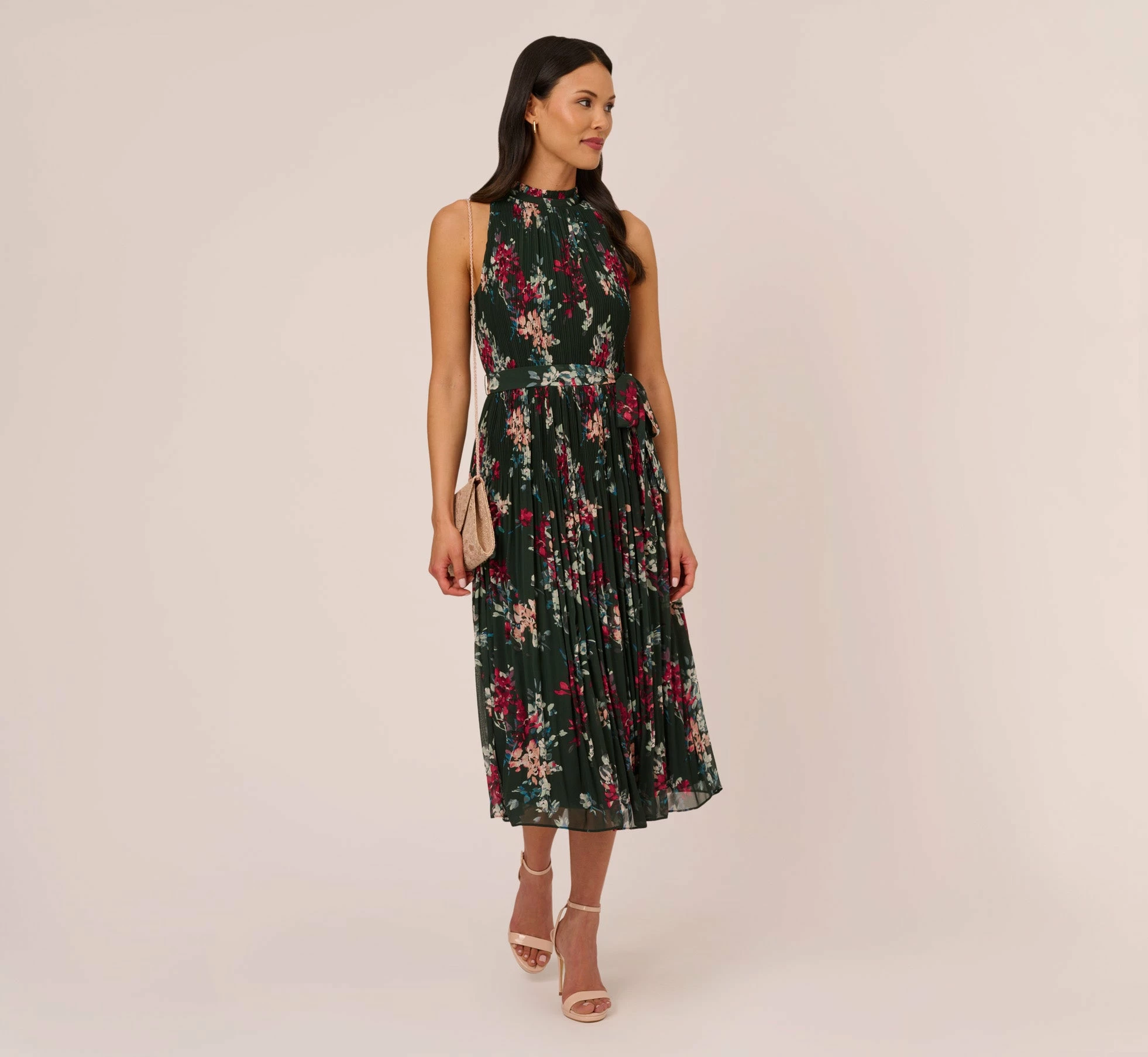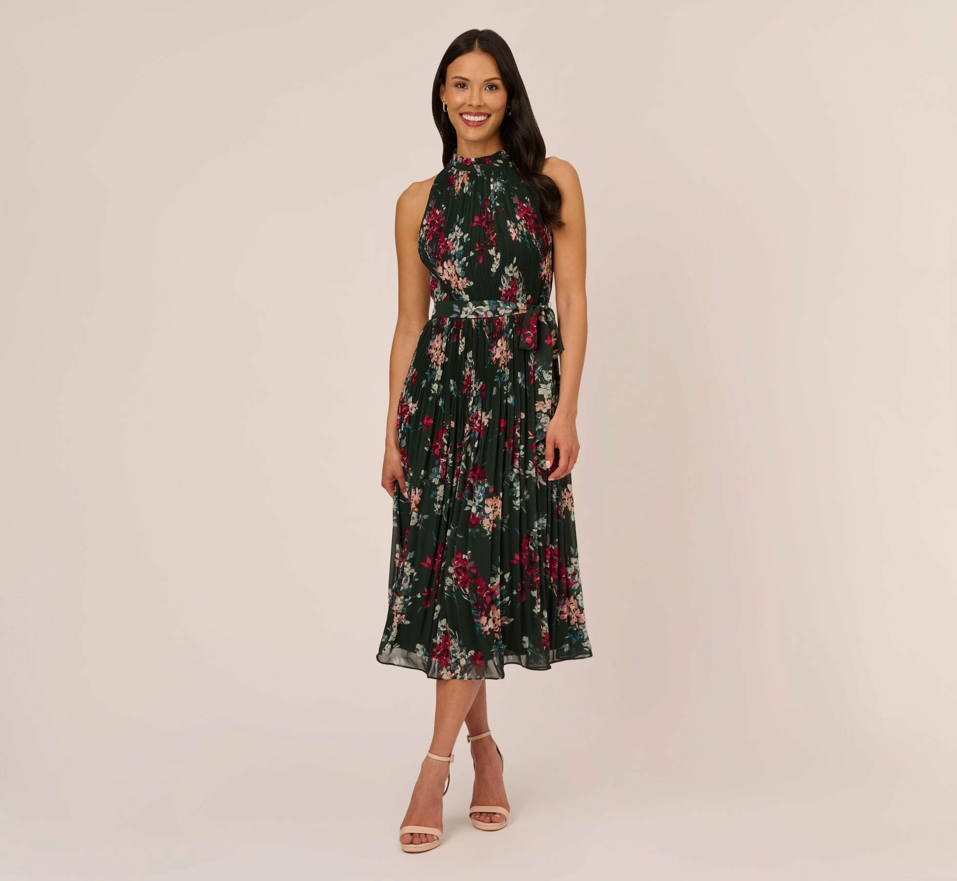 No matter the time of day, this chiffon dress is a gorgeous look. This floral printed dress features a halter bodice with mock neckline, a self-tie waist, and a flared skirt. Crafted from chiffon fabric in chic mini pleats and covered in romantic florals, this pull-on fit and flare dress has a comfortable elastic waistband. Styled for day with sandals or wedges or strappy heels for date night, this floral halter dress is timeless.