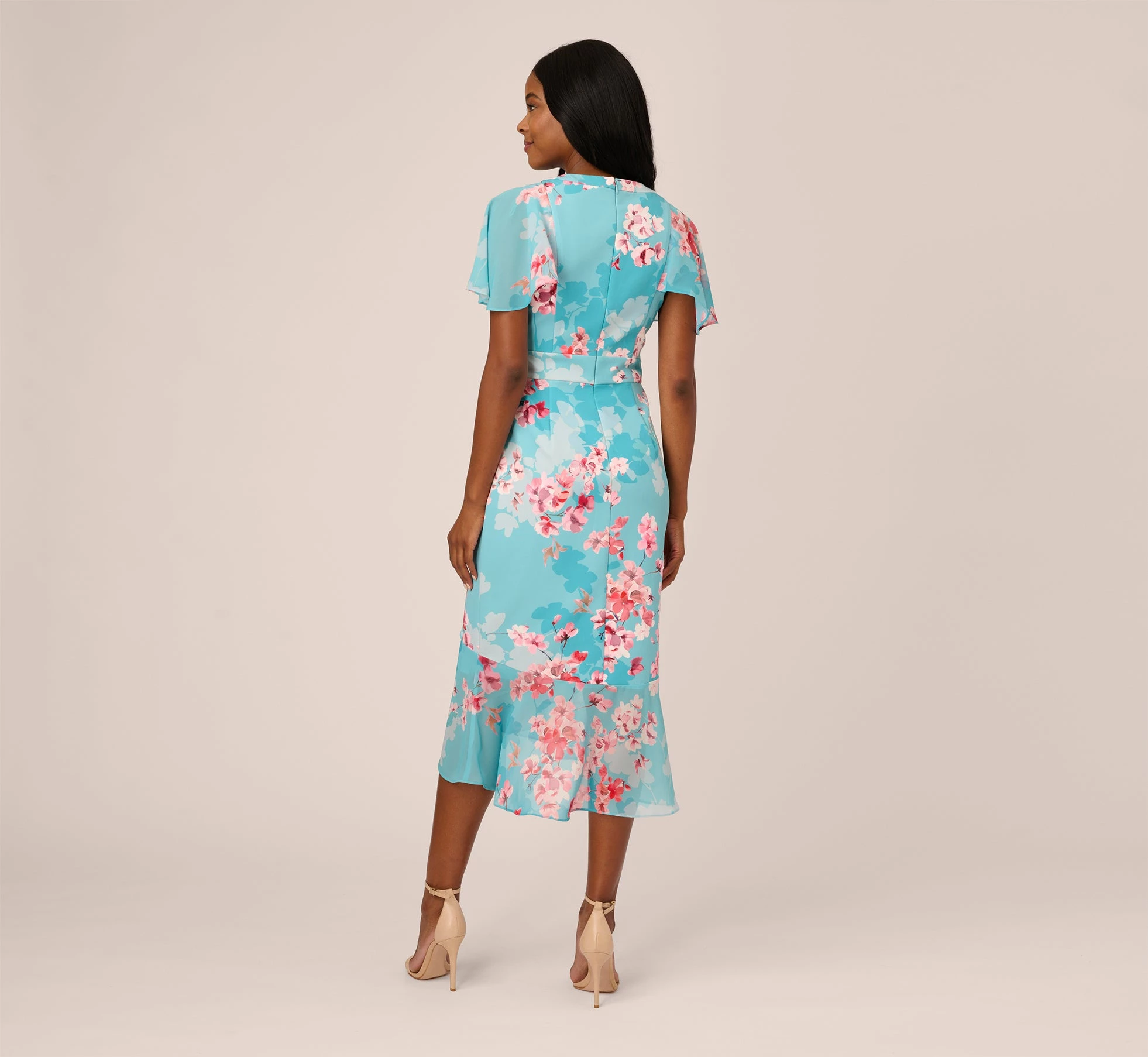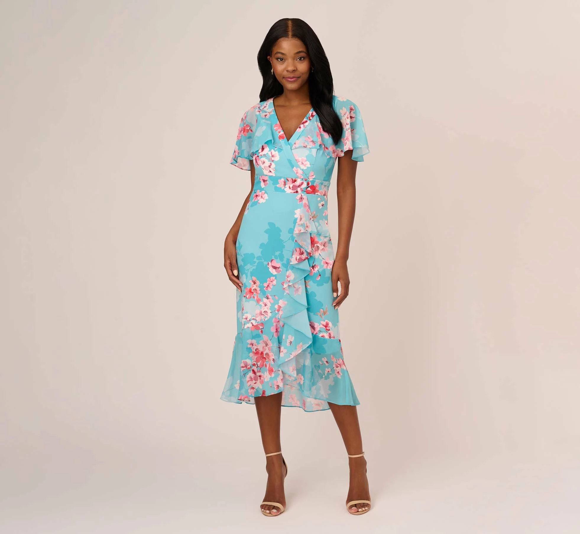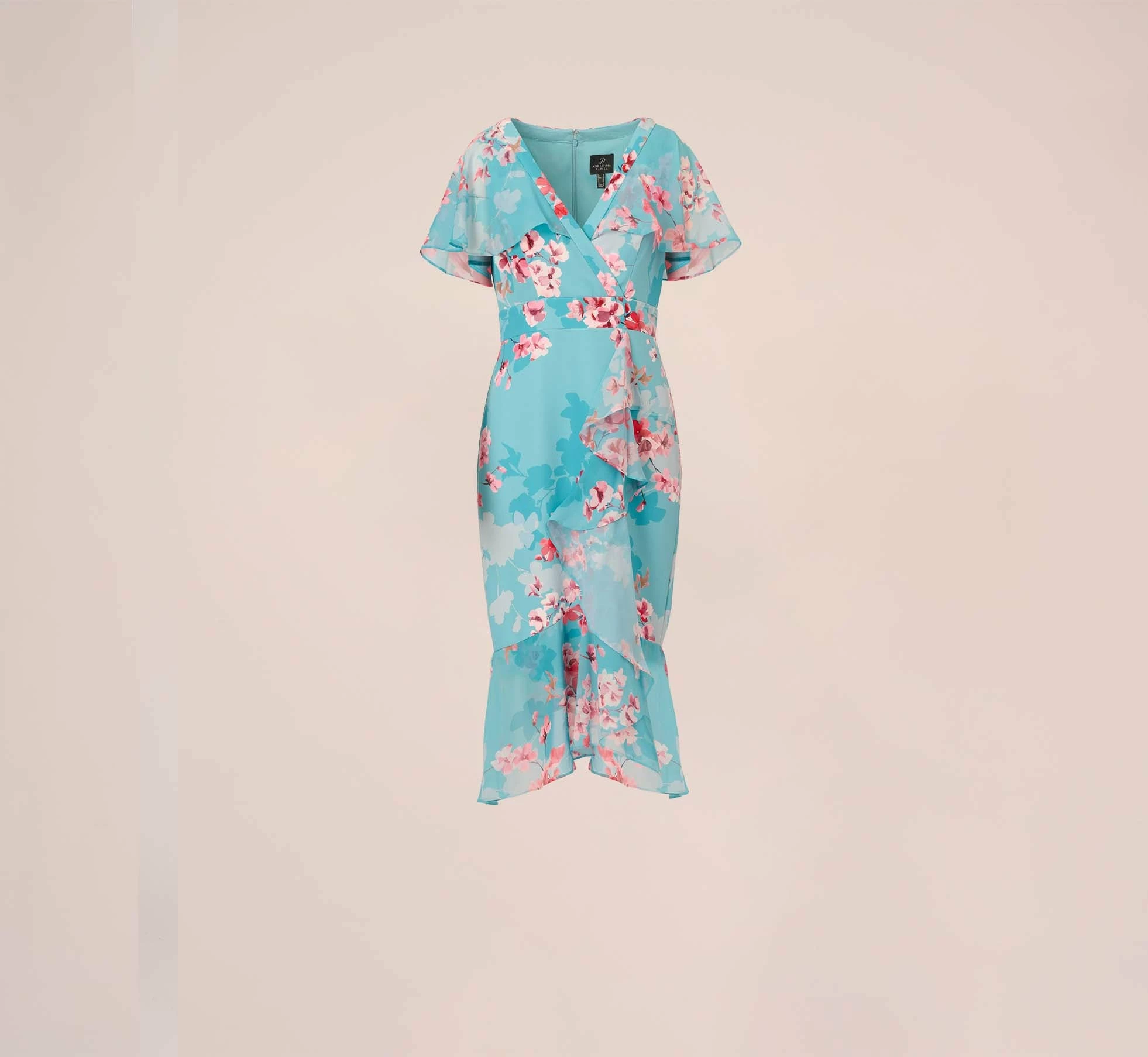 Gorgeously flowing capelet and a cascading chiffon ruffle lend a romantic edge to this stretch twill midi dress in a fresh floral pattern. Features a flattering surplice neckline and banded waist. Flounce hem that sways with each step. Back zipper with hook and eye closure. An easy add to cart for baby/bridal showers, brunch and wedding celebrations.