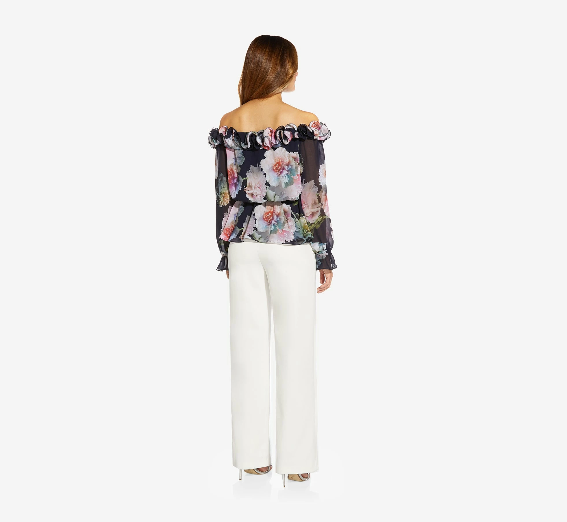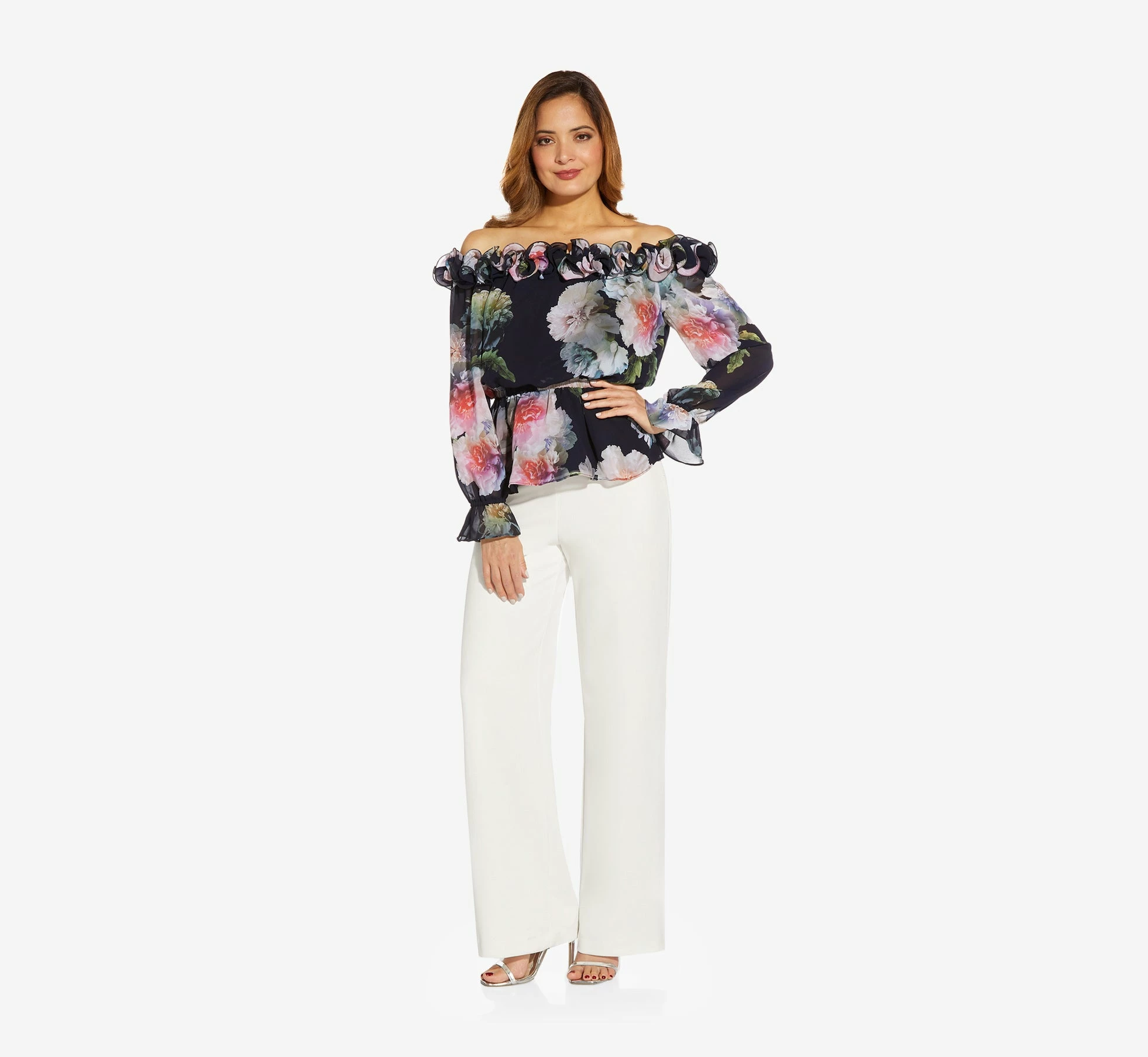 Flower power! Our off-the-shoulder blouson blouse in a soft, lightweight woven chiffon, blooms with this season’s prettiest print — florals. A dramatic rosette accent and long sleeves with a dainty bell cuff finishes the look. A gorgeous top to wear with your favorite wide-leg pants or pencil skirt.