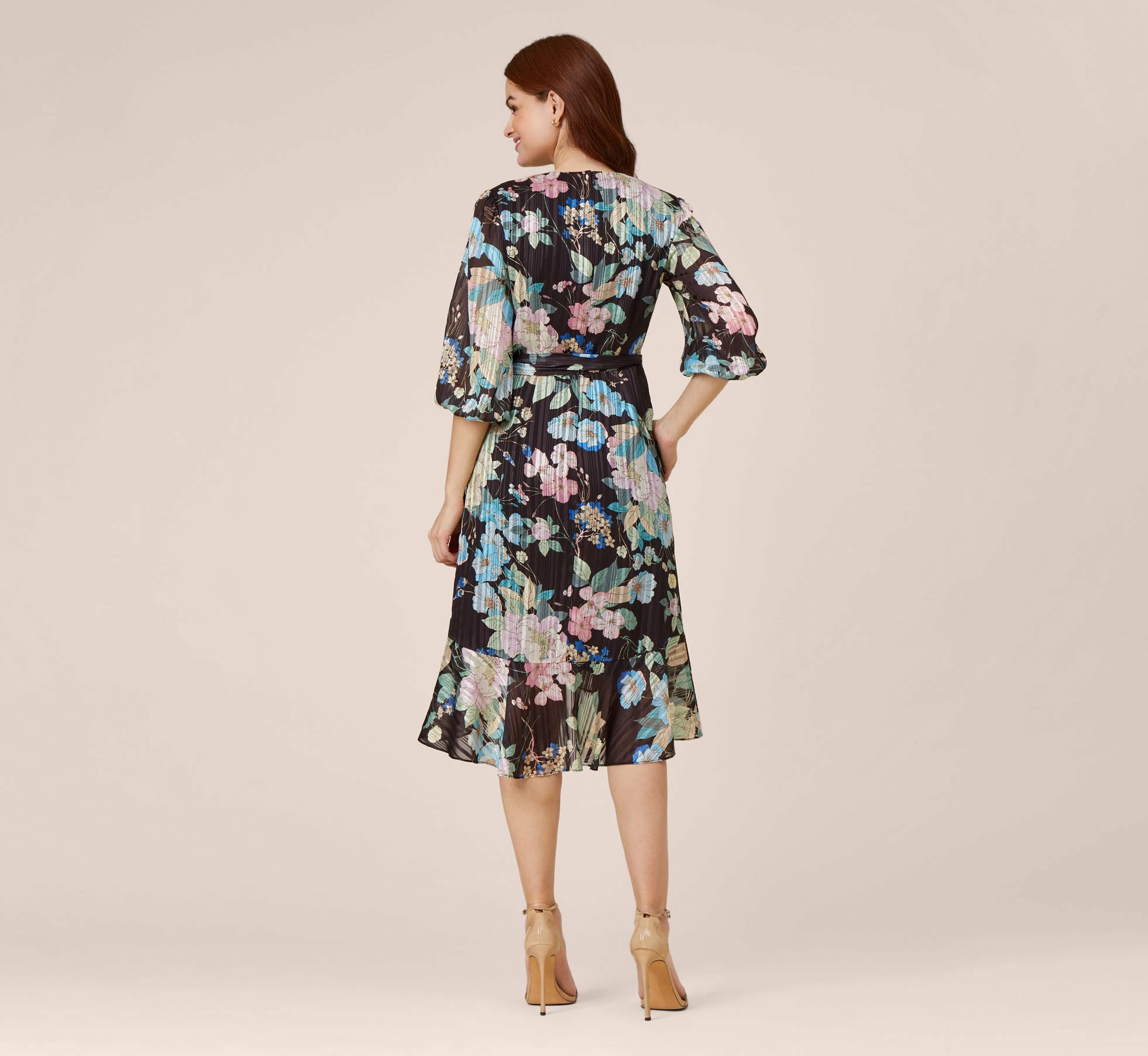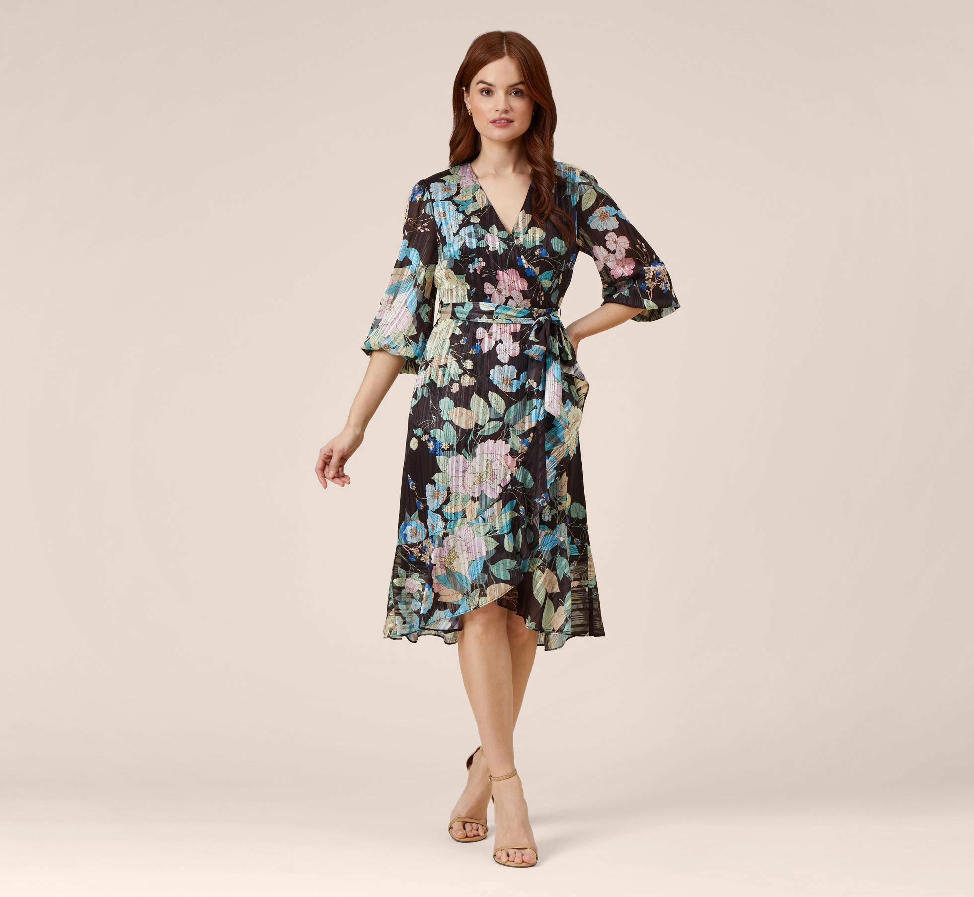 Lightweight and airy, this timeless faux wrap dress is designed in a floral printed woven chiffon with satin stripes and metallic threading for added shine. Features a surplice bodice, three-quarter blouson sleeves with elastic hem. Short wrap skirt with cascading ruffle for added dimension. Finished with a detachable self-tie belt. Back zipper with hook and eye closure.