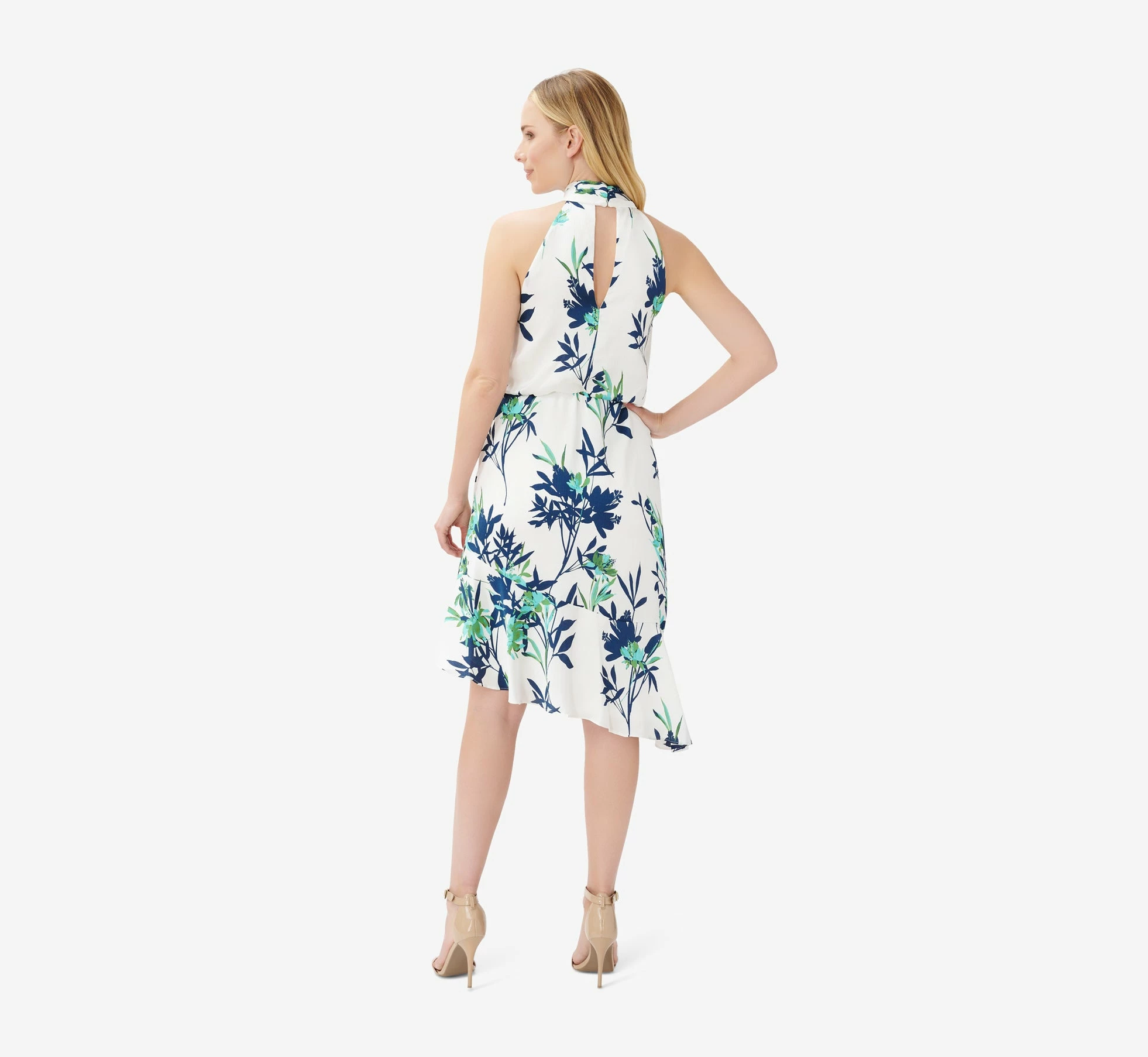 Timeless femininity: You’ll fall in love with this light and breezy halter dress crafted of a luxe stretch woven crepe in a pretty floral print. We’ve designed this dress in our iconic blouson silhouette, made to gently hug your waist and then billow over it creating a flattering fit. Details we love: a modern mock neckline, delicate shirring and the playful asymmetrical hem. Back hook-and-eye closure. Love this dress for brunch, dinner dates and bridal/baby showers. Also, perfectly packs for vacation.