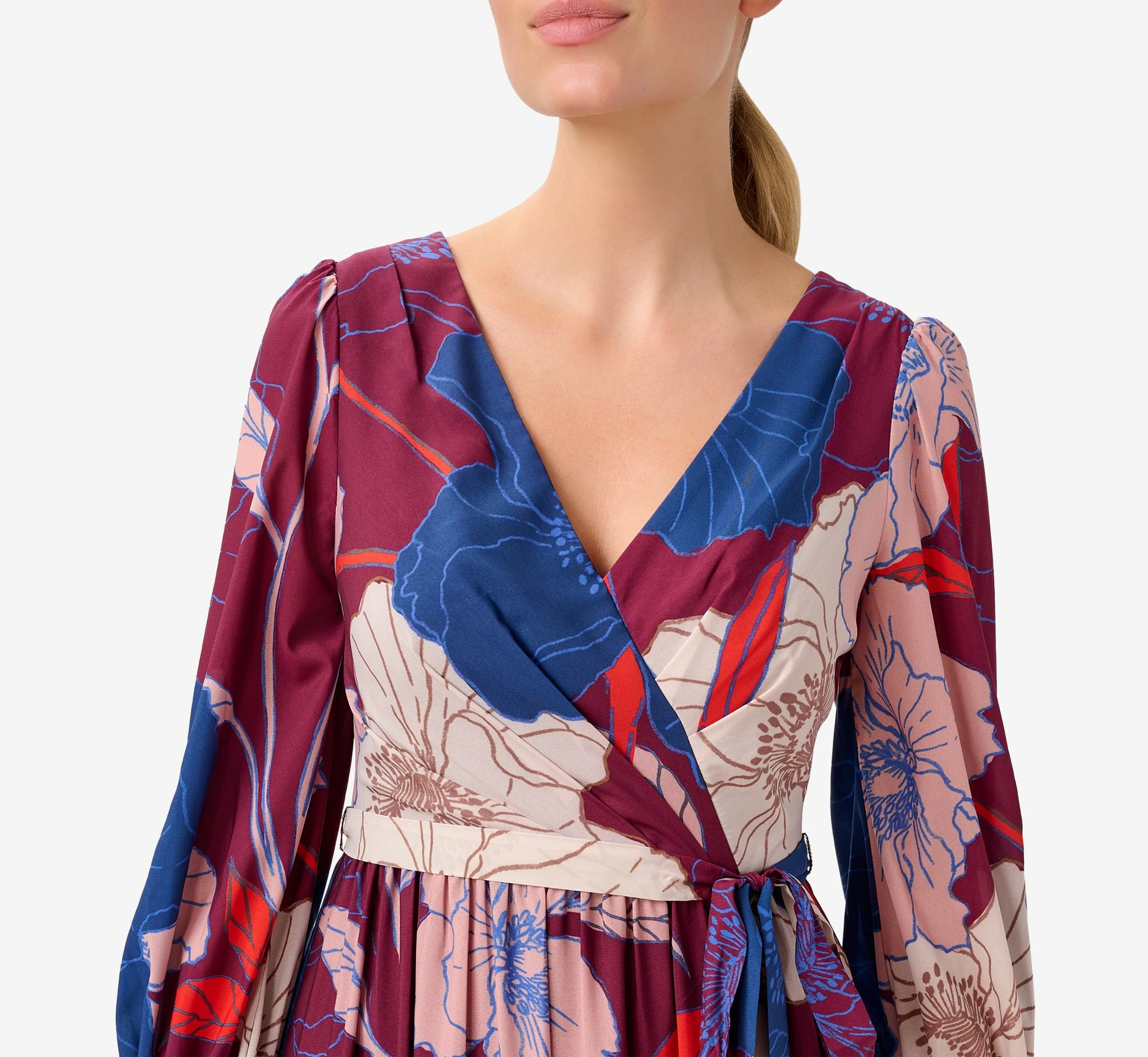 Modern and easy-fitting, our floor-sweeping dress is designed with a bold floral print on stretch woven chiffon fabric. A faux wrap bodice tops a long, flowing skirt with pleating along the waist for added fullness. All the details: long sleeves with bell cuff and a waist-defining self-tie belt. A chic option for so many occasions.