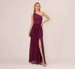 Lightweight and lighthearted, our long gown in a flowy and soft chiffon fabric features an eye-catching floral print. Designed with a wrap bodice with pleated detail that tops a long, shirred skirt with front slit for added drama. Sheer long sleeves with elastic flare cuffs. Finished with a self-tie belt to accentuate your waist.