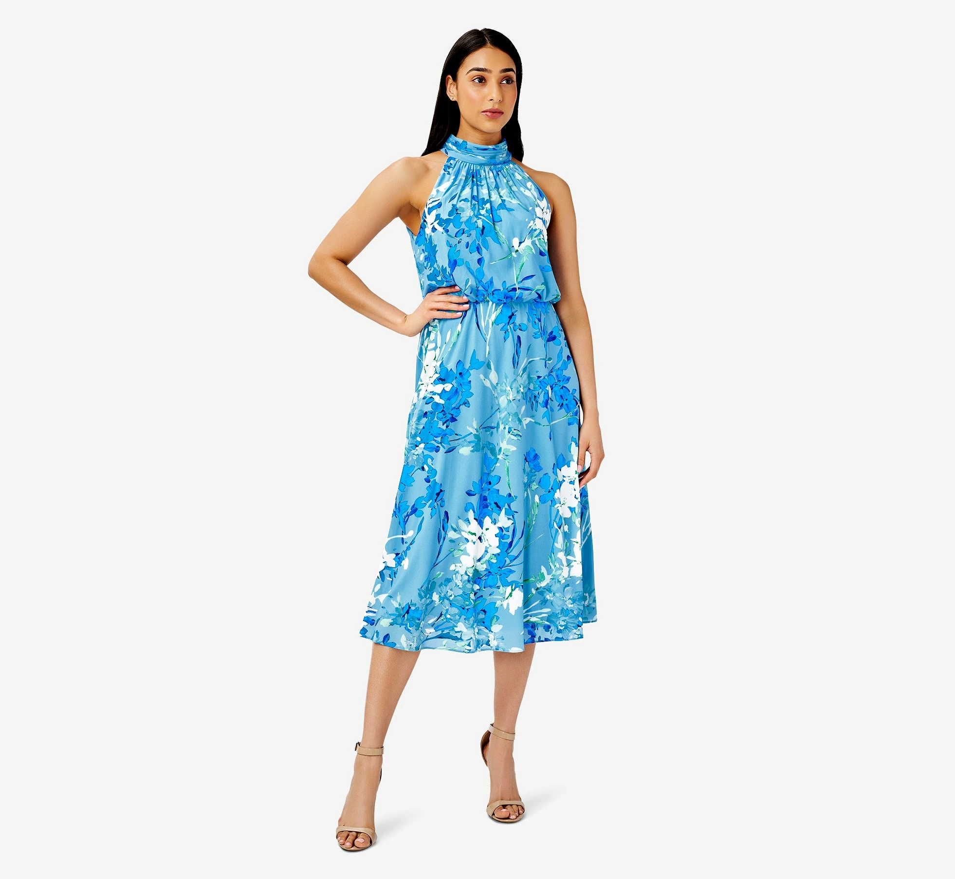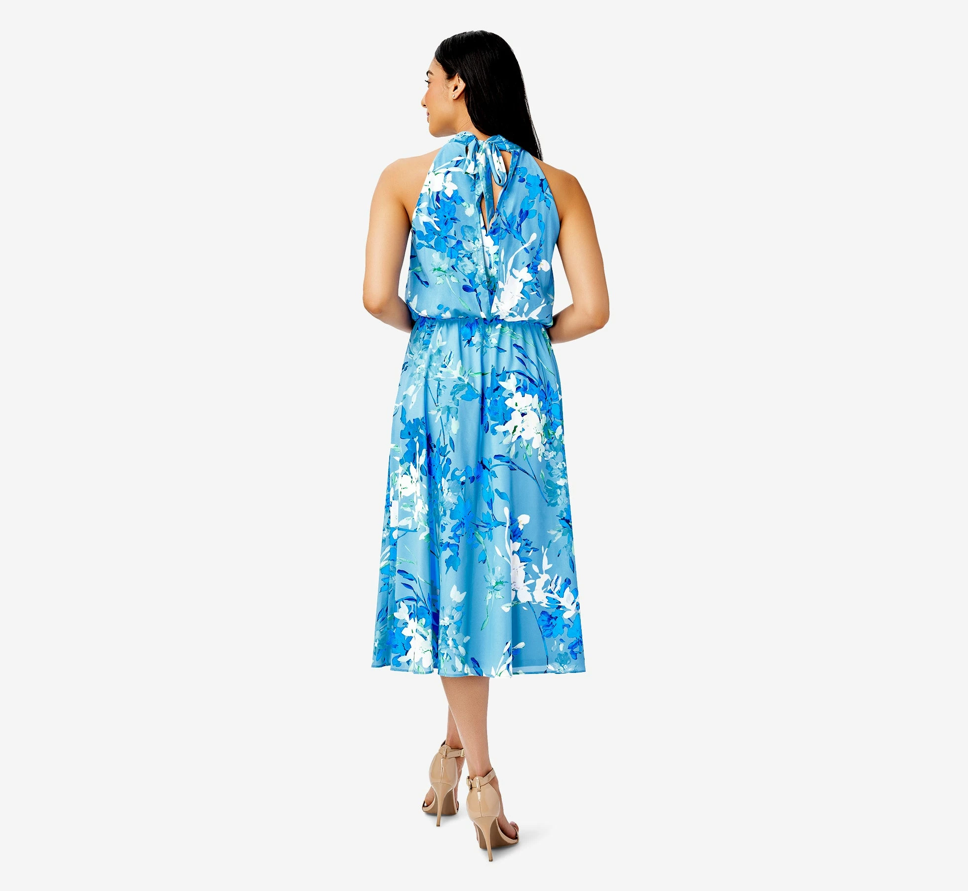 Easy-fitting and effortlessly chic, our stretch chiffon pull-on dress in a vibrant floral print has all the feminine vibes and looks amazing on everyone. We love the trendy mock halter neckline with soft shirring and self-tie back and the figure-flattering blouson bodice. The midi skirt is cut on the bias giving it more fluidity. A forever favorite you’ll be reaching for again and again.