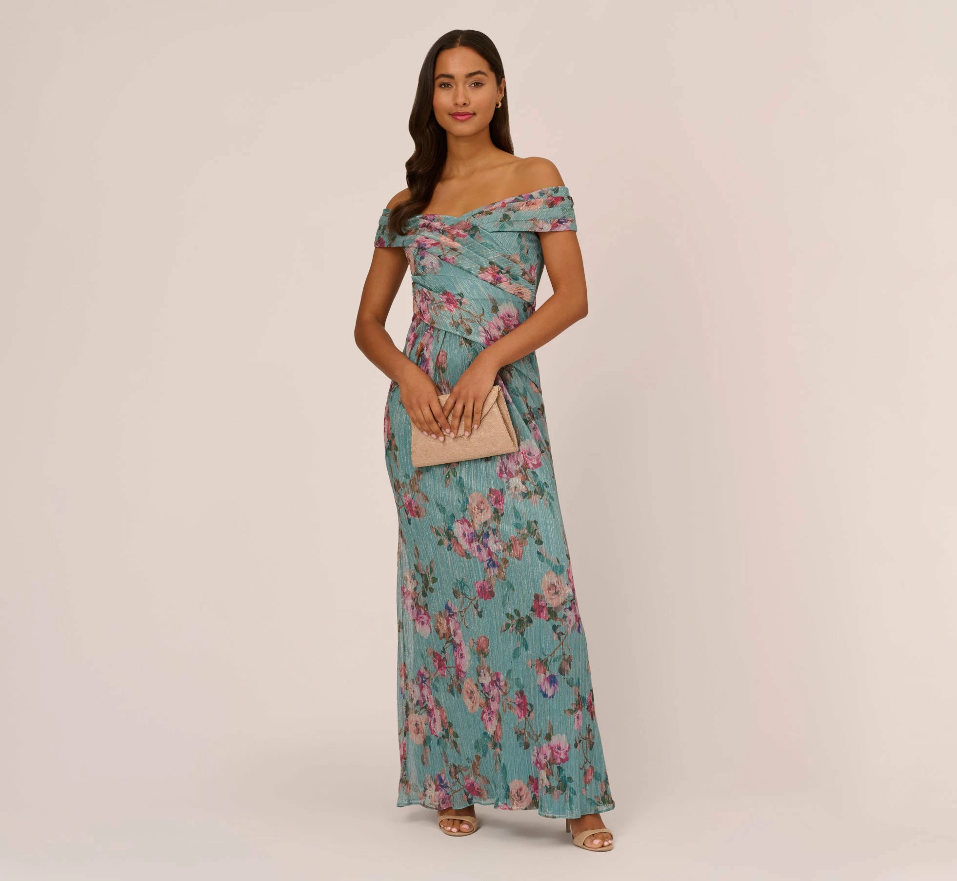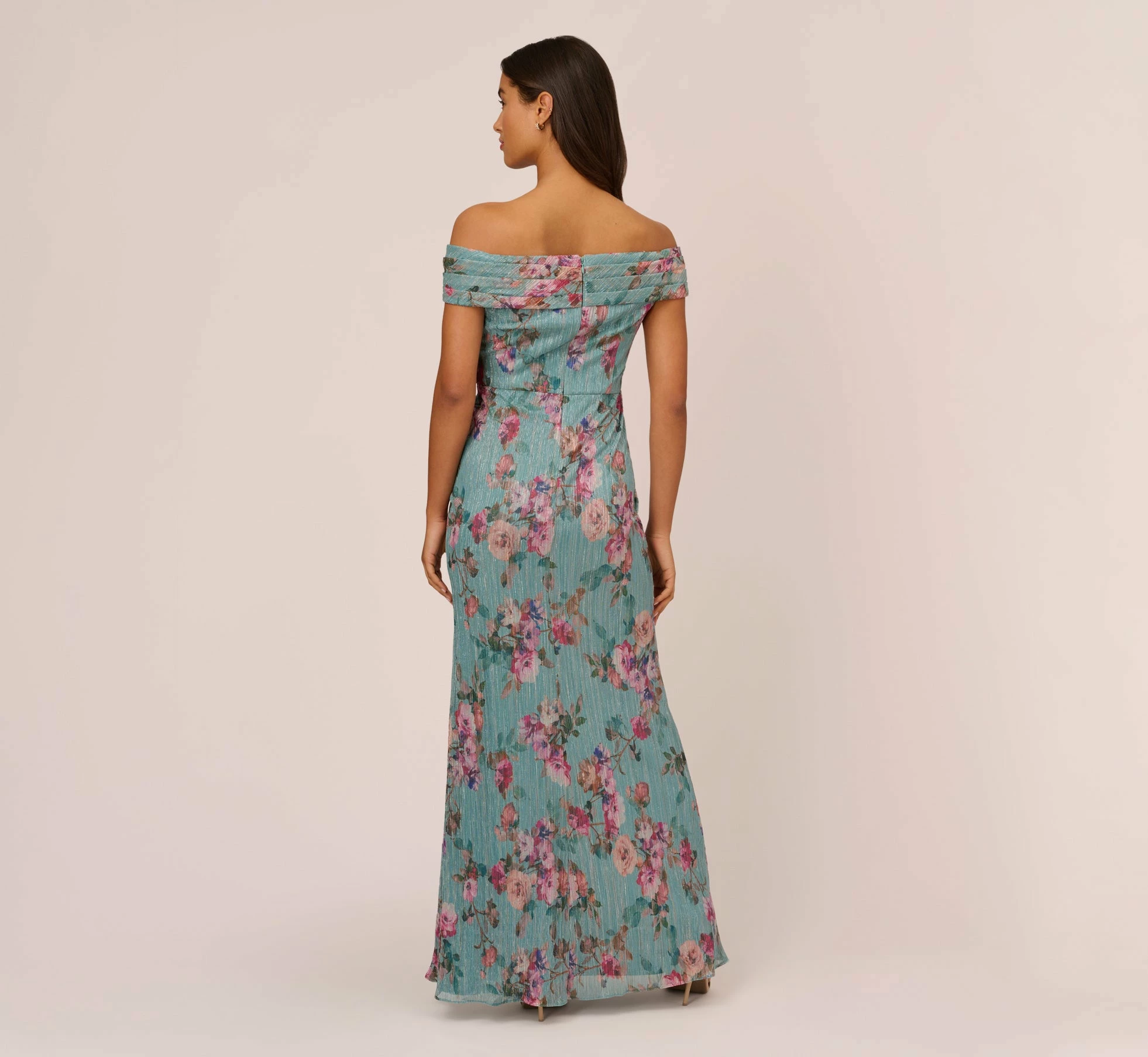 Lightweight and airy crinkled mesh dress patterned in a delicate floral with metallic threading for added shine. An off the shoulder silhouette, this elegant style features dramatic and flattering pleating on the bodice. A soft skirt with pleats has a slight mermaid silhouette for ease and comfort. Sleek back zipper with hook and eye closure. An elegant option for wedding receptions, black-tie galas and any special occasions on your calendar.