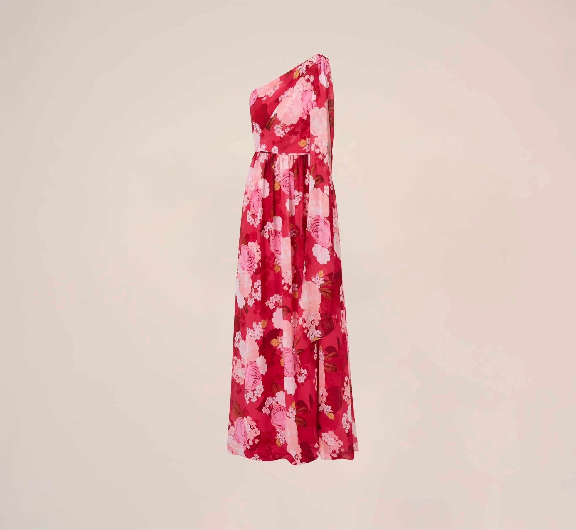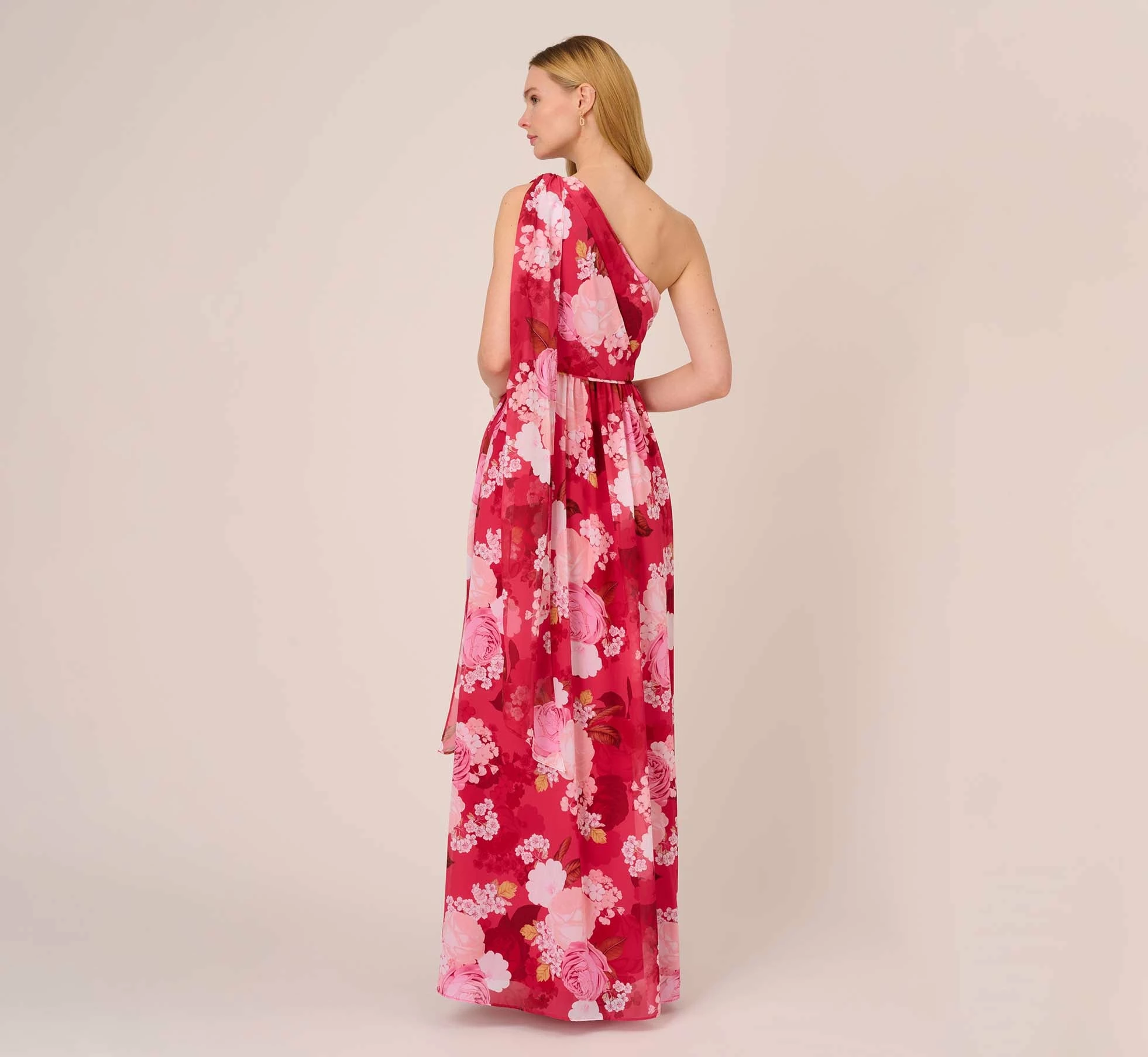 Lightweight and airy, our woven chiffon gown is printed in a bold floral and impeccably tailored in a one-shoulder silhouette with a playful bow at the shoulder. The floor-sweeping skirt is designed with pleating for added movement and sway. Front slit for dramatic effect. Side zipper with hook and eye closure.