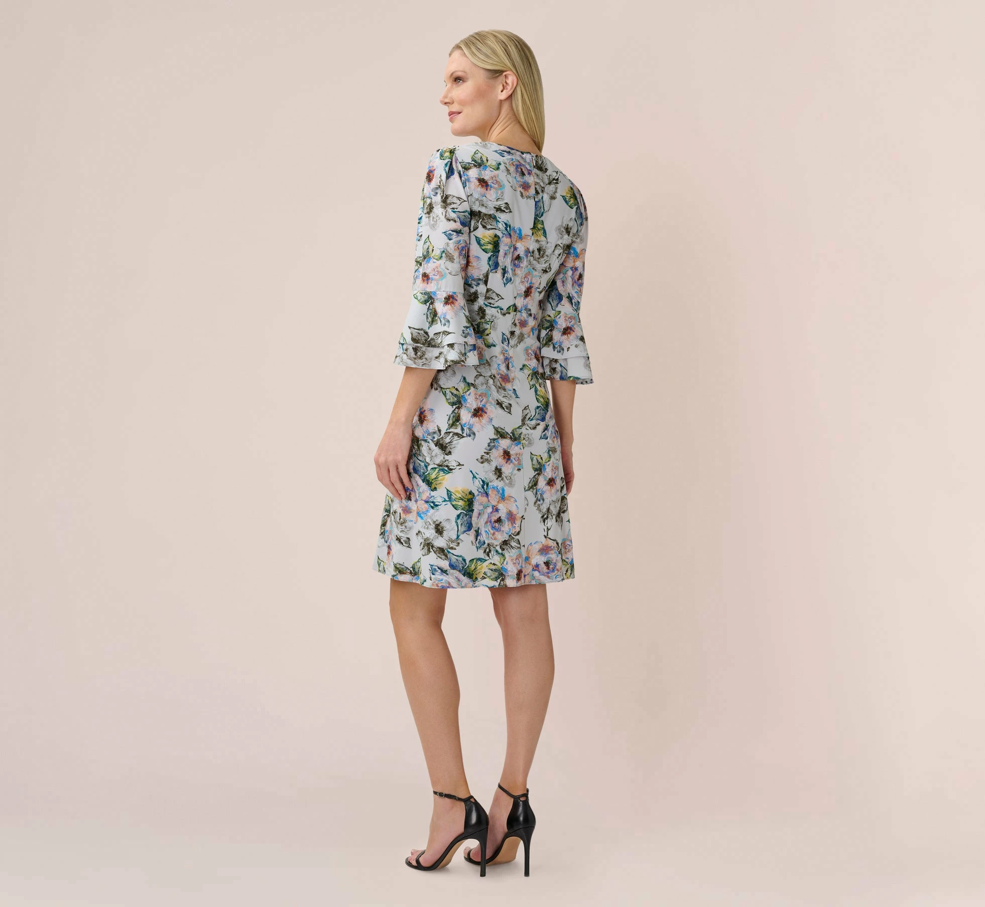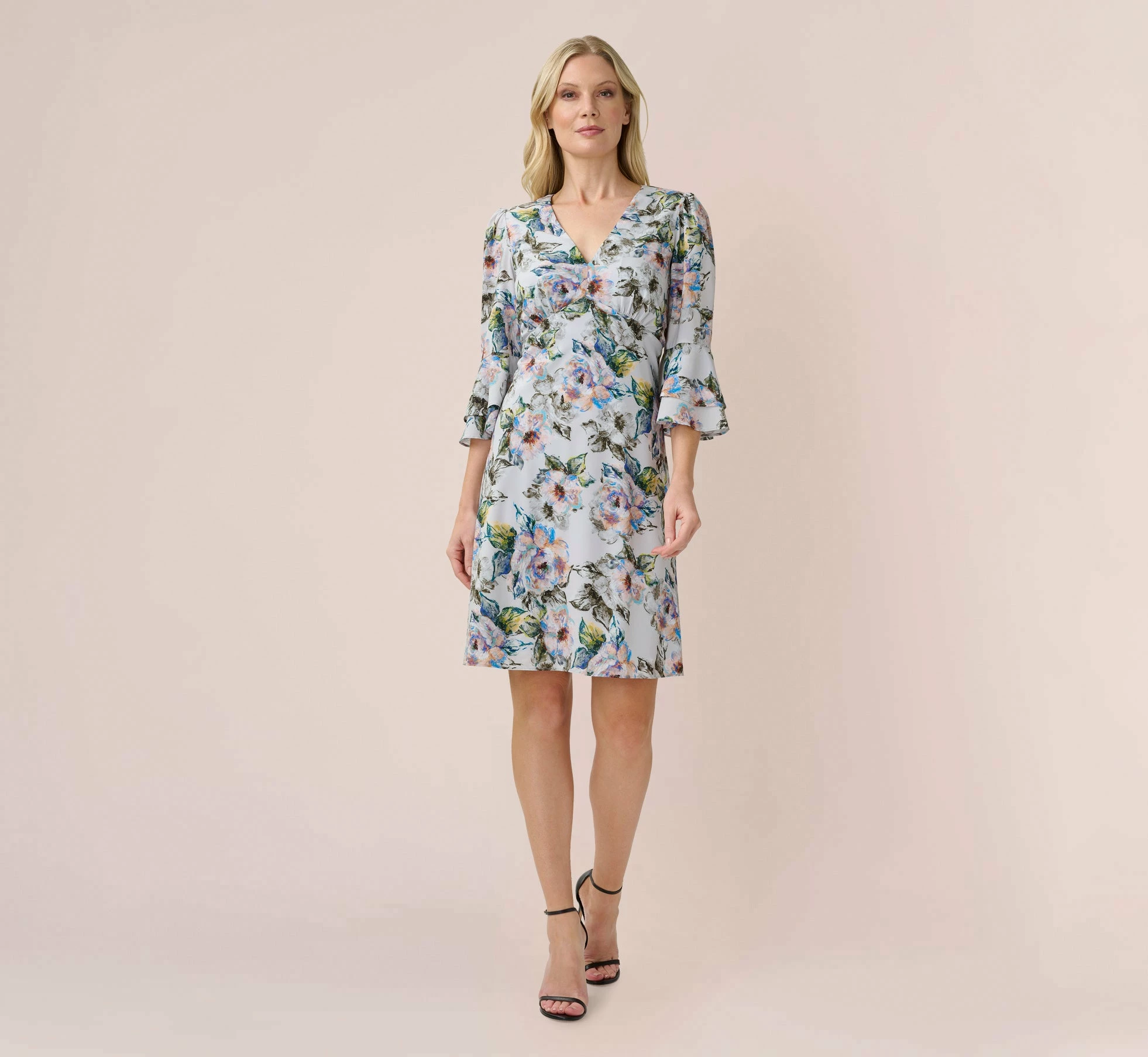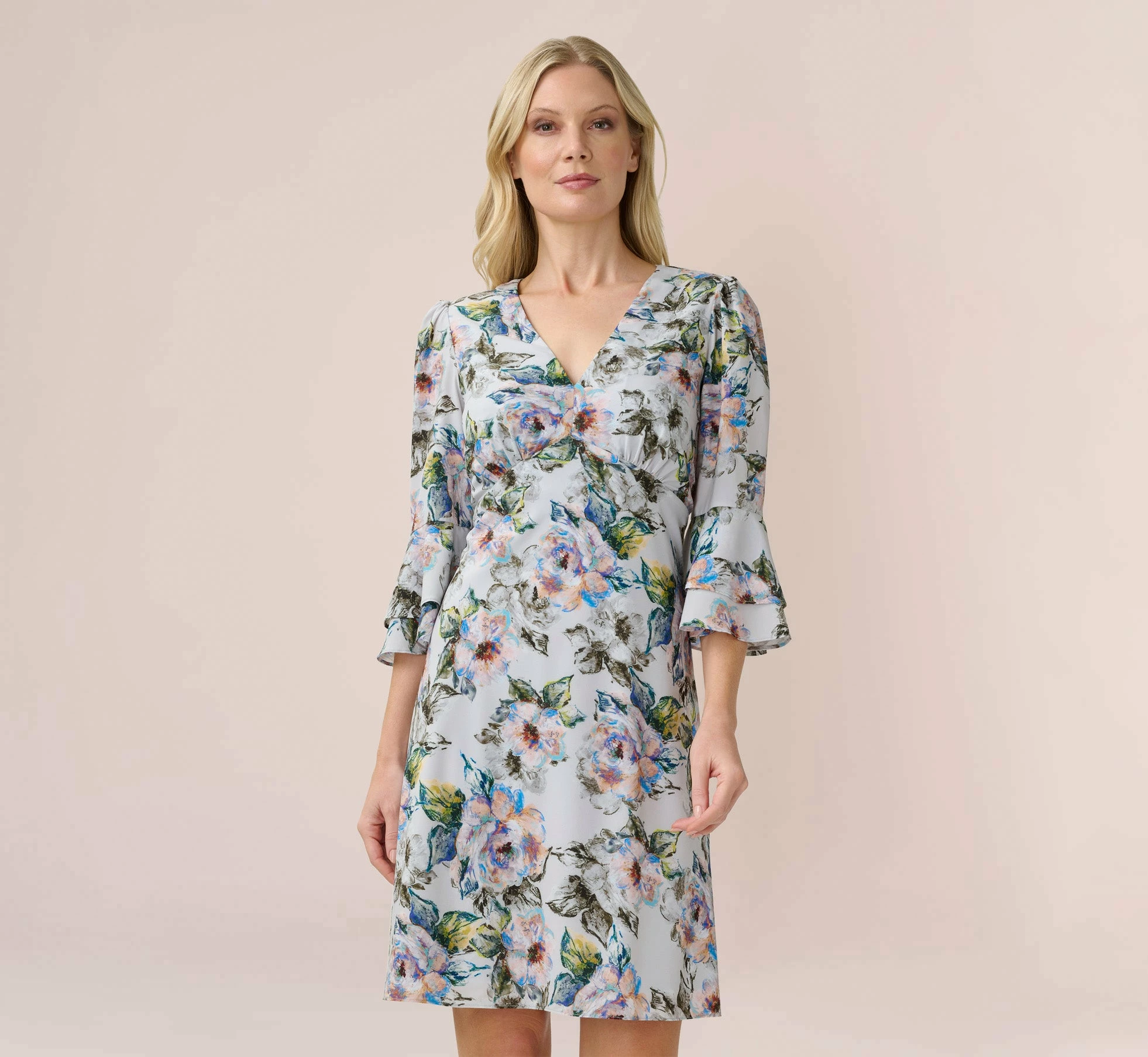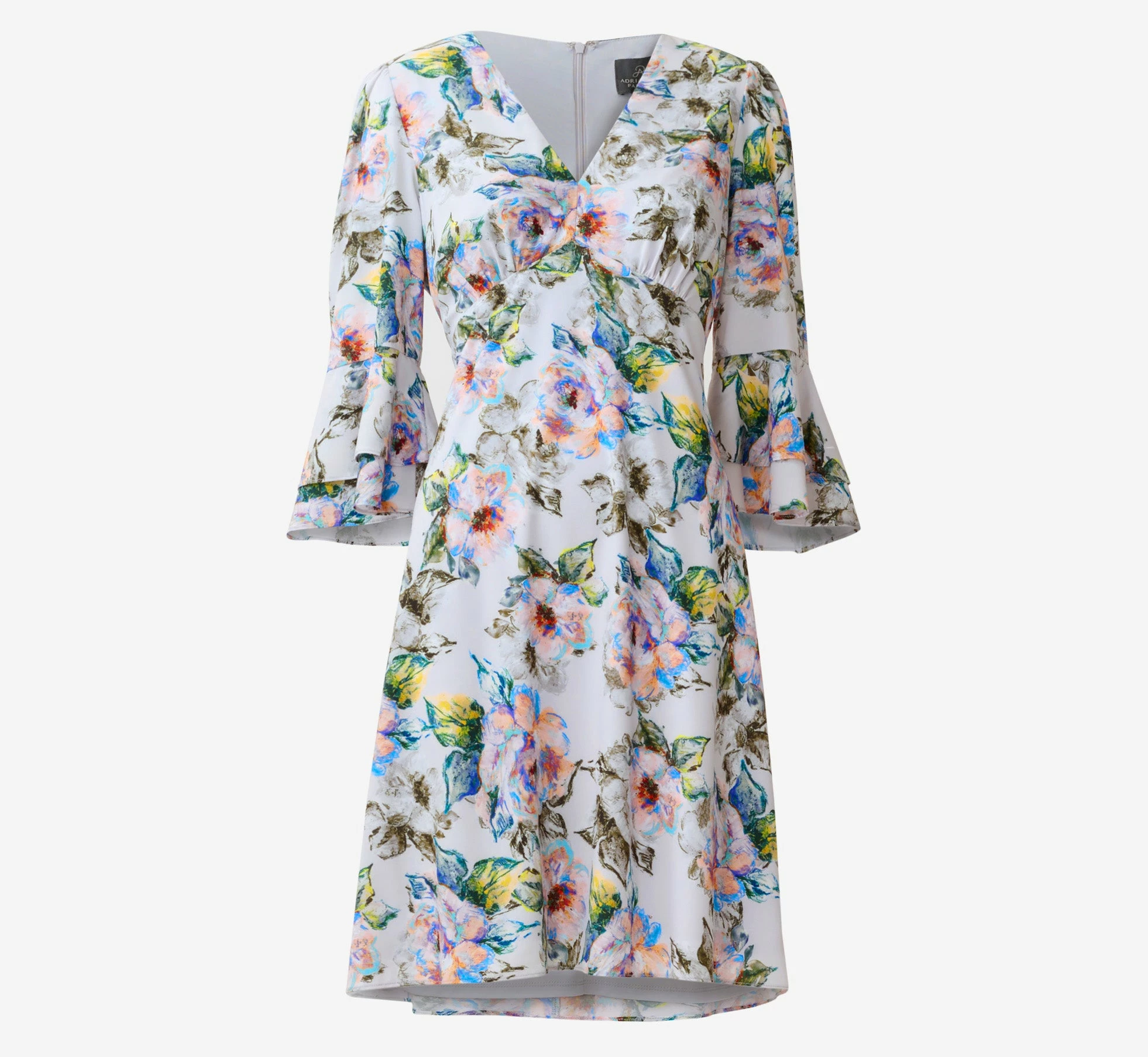 Feminine and effortlessly chic, in a stretch woven chiffon fabric, our fit-and-flare dress blooms with our floral print. All the details: a v-neckline, contoured empire waist, three-quarter sleeves with tiered bell cuffs and a bias-cut short skirt. Sleek back hook-and-eye/zip closure. We love this versatile style yearround – it teams with a jacket and boots or sandals to easily transtion season-to-season.