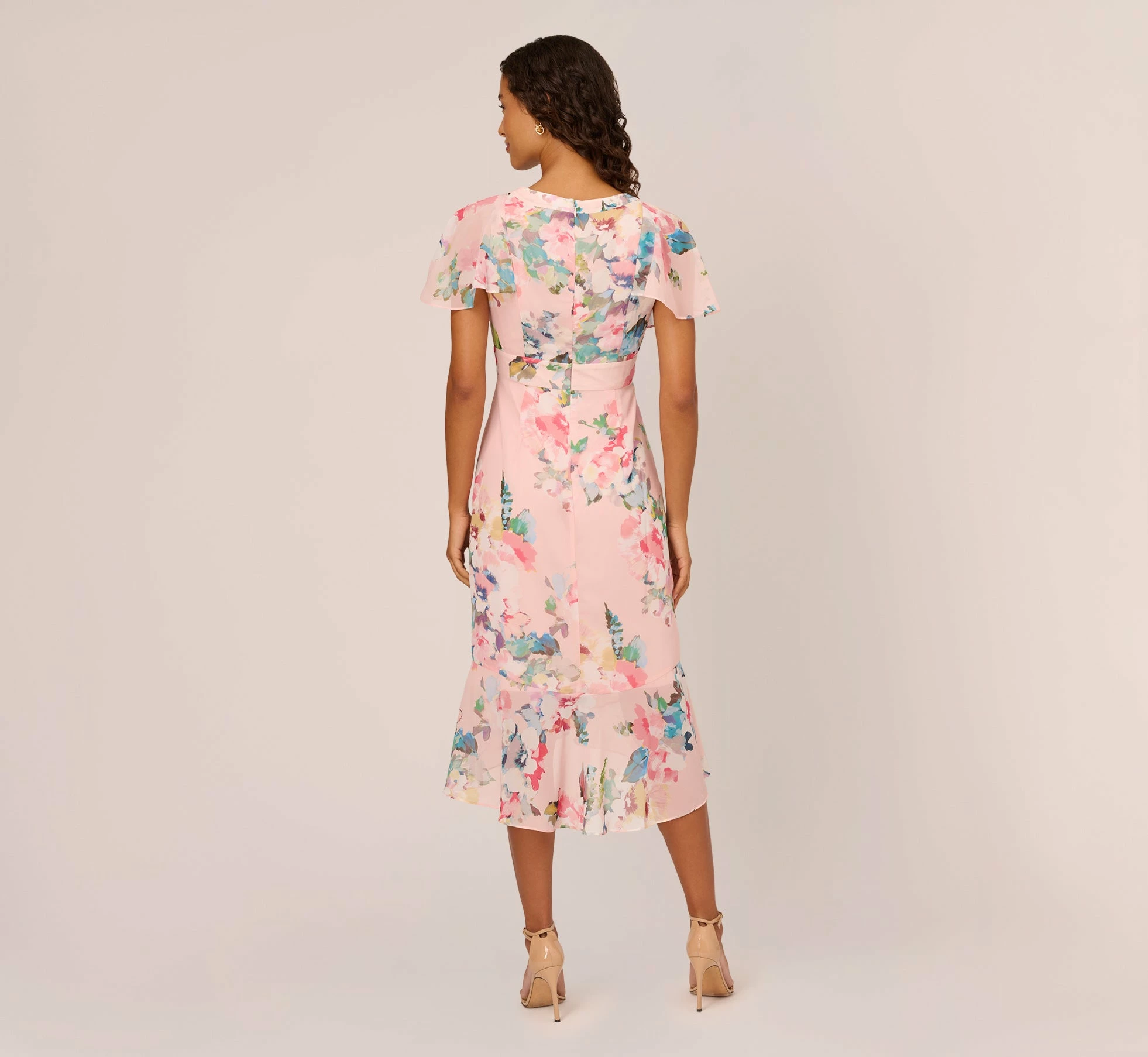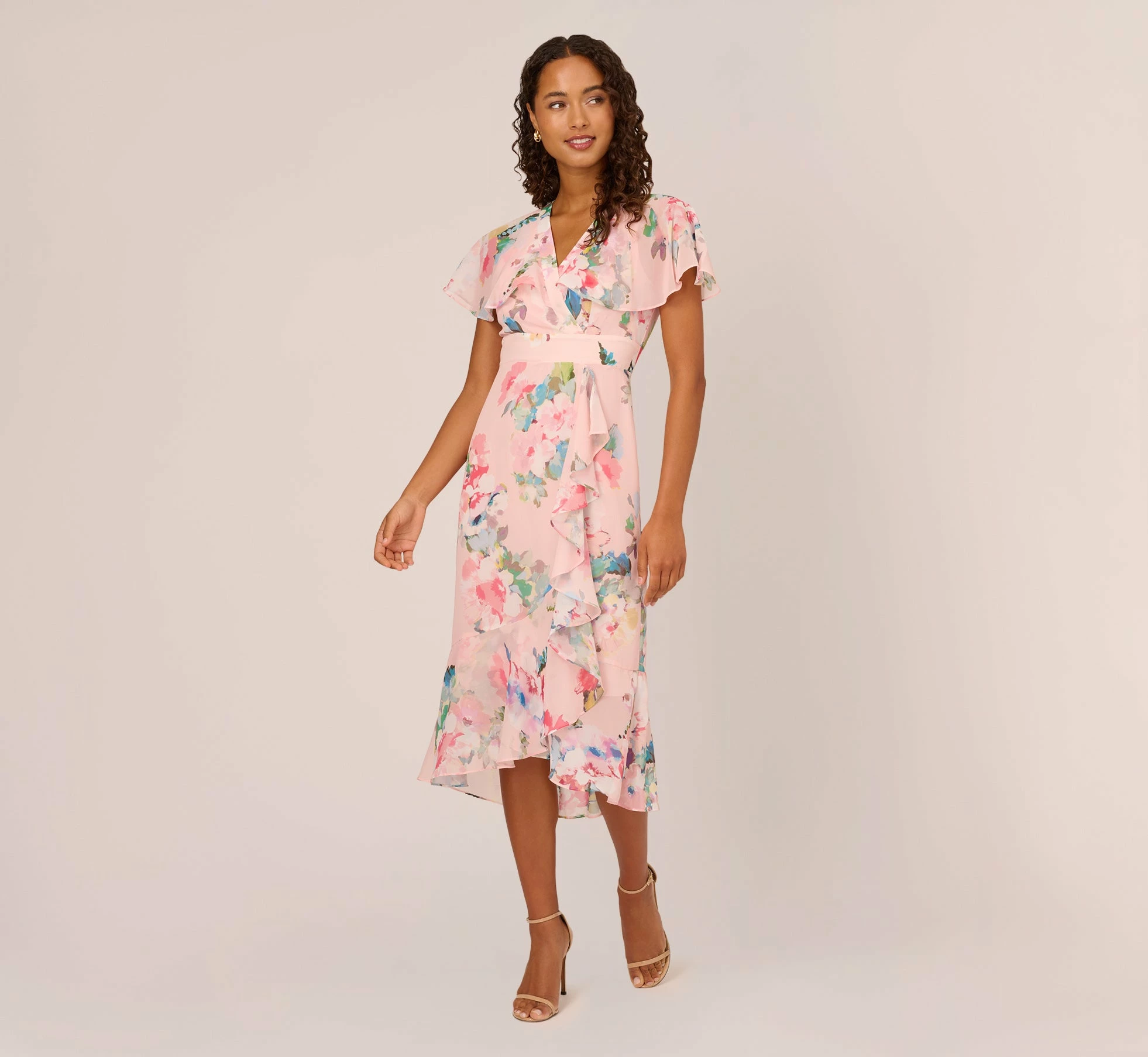 Lightweight and lighthearted, soft florals bloom allover our chic faux wrap dress in a lightweight chiffon and stretch woven twill fabric. Beautifully shaped with a surplice neckline and sheer flutter sleeves. A banded waist tops the flirty skirt with cascading ruffle detail. Back hook-and-eye/zip closure. The perfect dress for brunch, baby/bridal showers and wedding receptions.
