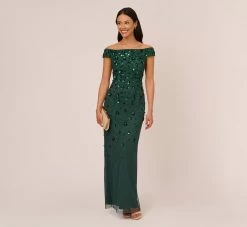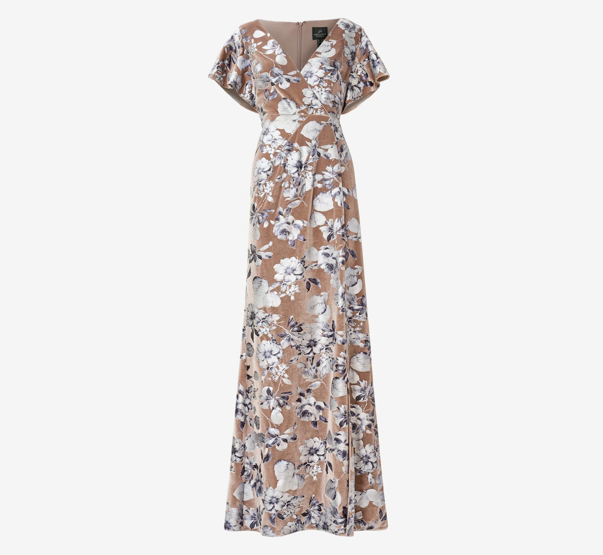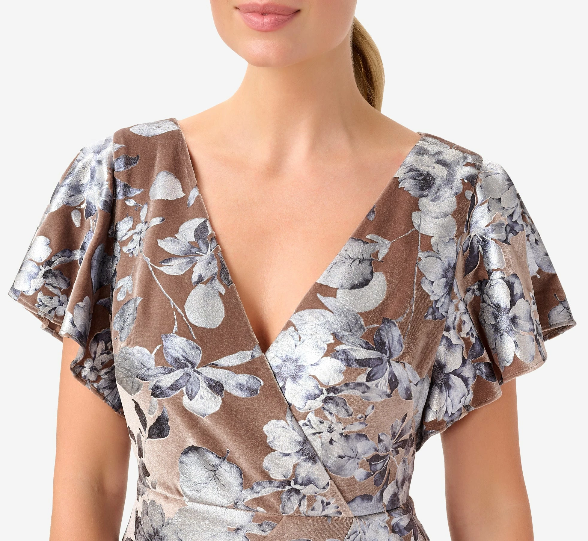 Feminine and fabulous, this floor-sweeping gown is crafted of a luxe stretch velvet and blooms with a shimmering foil floral print. All the chic details: flattering surplice neckline, floaty flutter sleeves. A seamed waist with gentle ruched accents tops the long, soft skirt with modified flared hem. Whether for a wedding or a black-tie event, you can’t go wrong with a dress this polished.