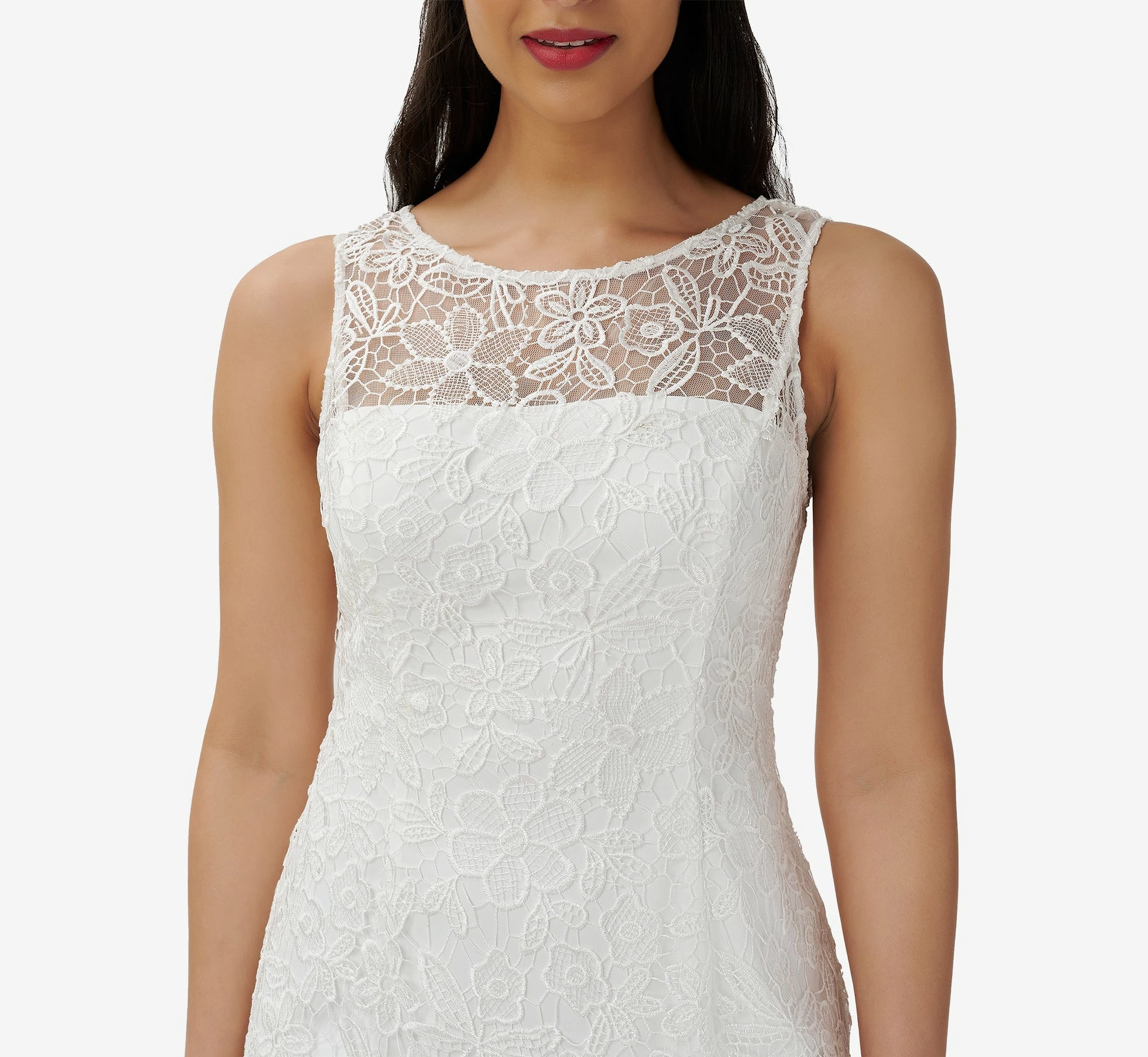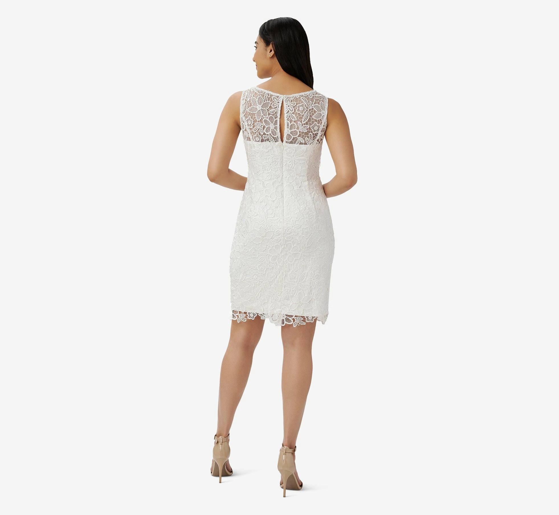 Our iconic and elegant sleeveless sheath dress is designed with a delicate Guipure lace overlay in a stunning floral pattern. Love the sheer illusion yoke. (so feminine). Sleek back zip closure. A stunning look for brunch, cocktail hours and bridal showers.