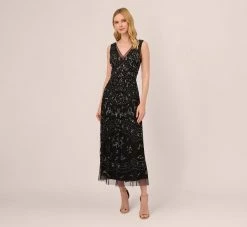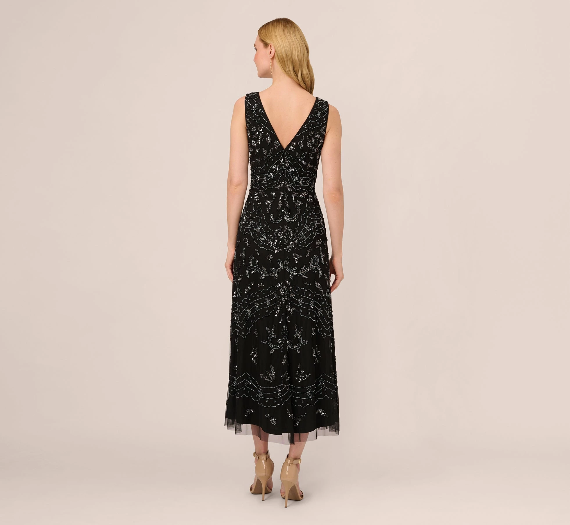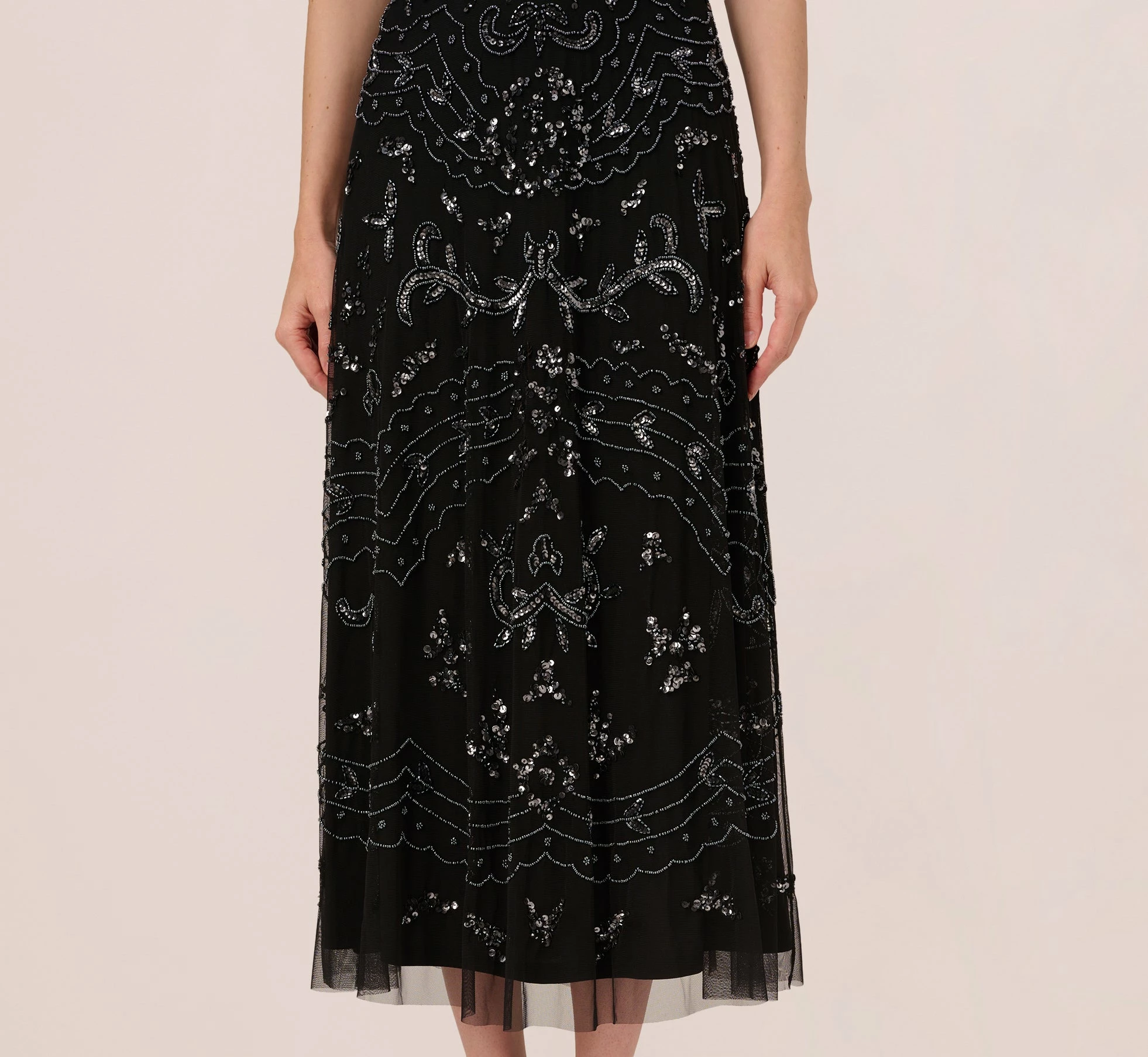Be party ready in an instant in our effortlessly chic dress that gets treated to allover dazzling hand beadwork. Details we love: the clean v-neckline with sheer trim and the soft pleats along the skirt for added movement and sway. Wearable on repeat to all your special occasions.