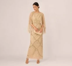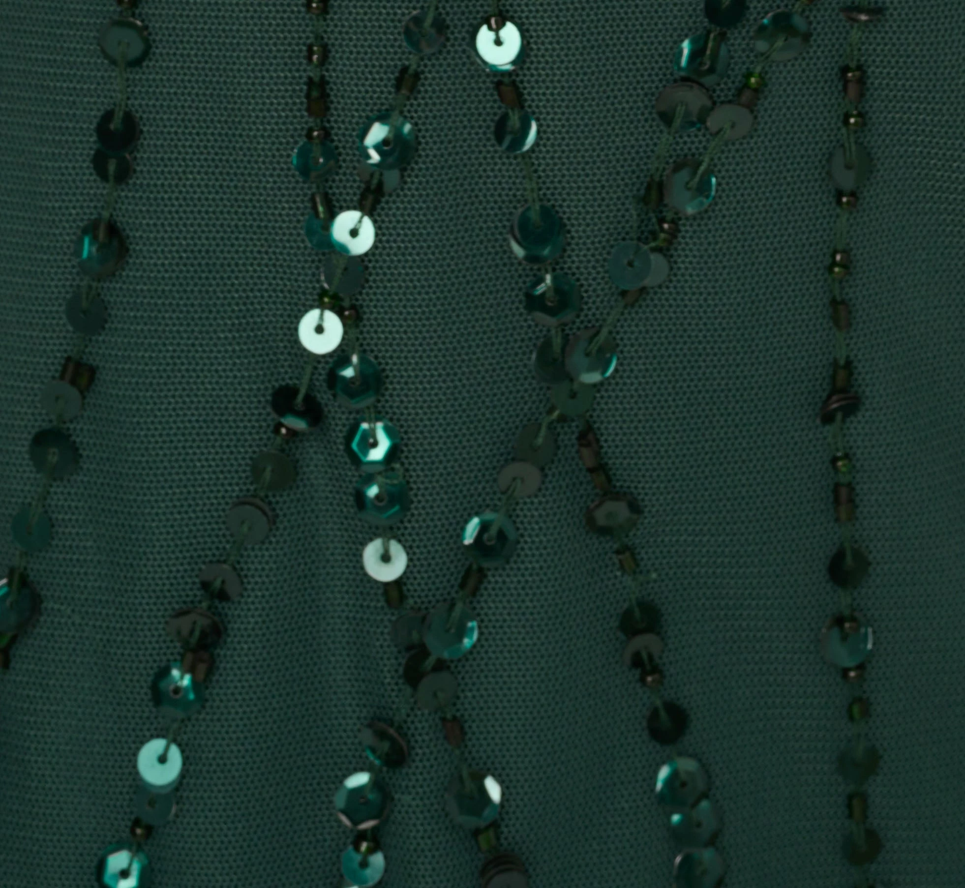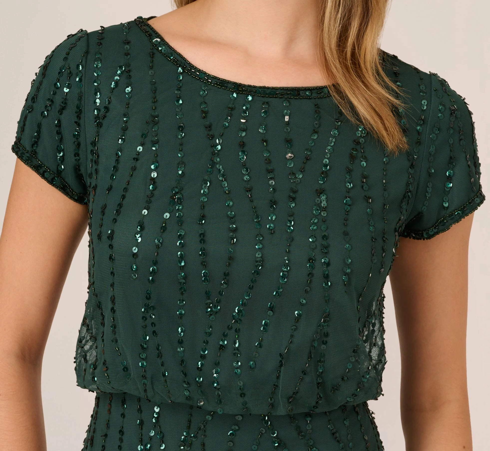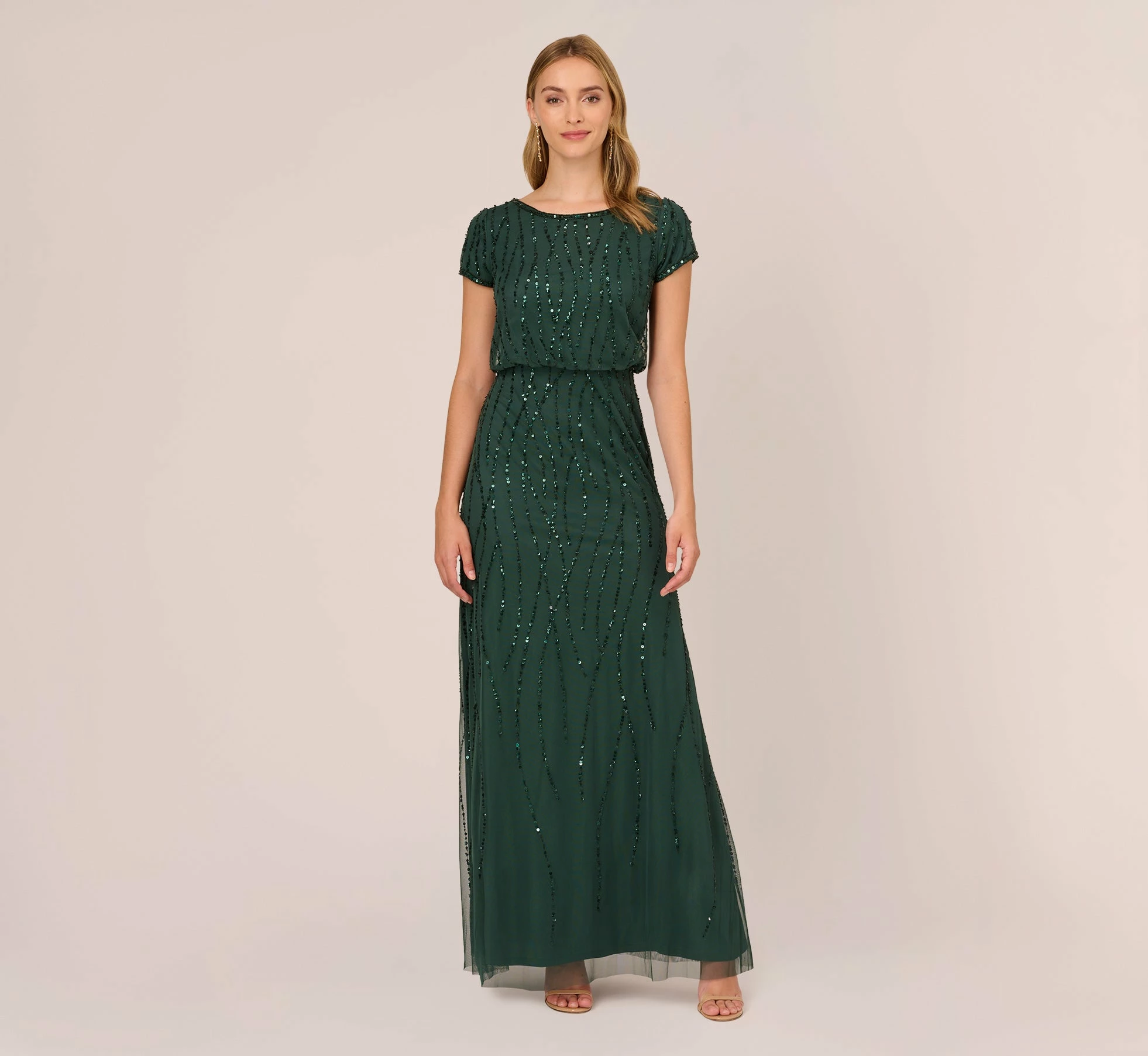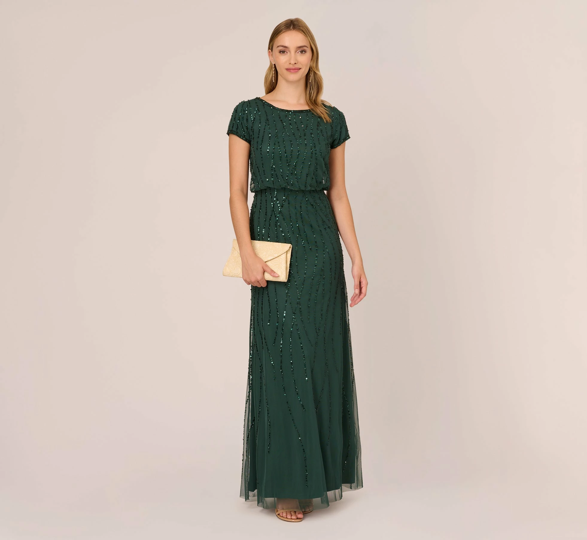 A forever favorite for all your special occasions, our striking long evening gown is designed in our iconic (and flattering) blouson silhouette. Rows of dazzling handsewn beading covers the sheer mesh overlay. All the details: bateau neckline and short sleeves. Sleek back zip closure. We love this for prom/homecoming, bridesmaids and black-tie galas.