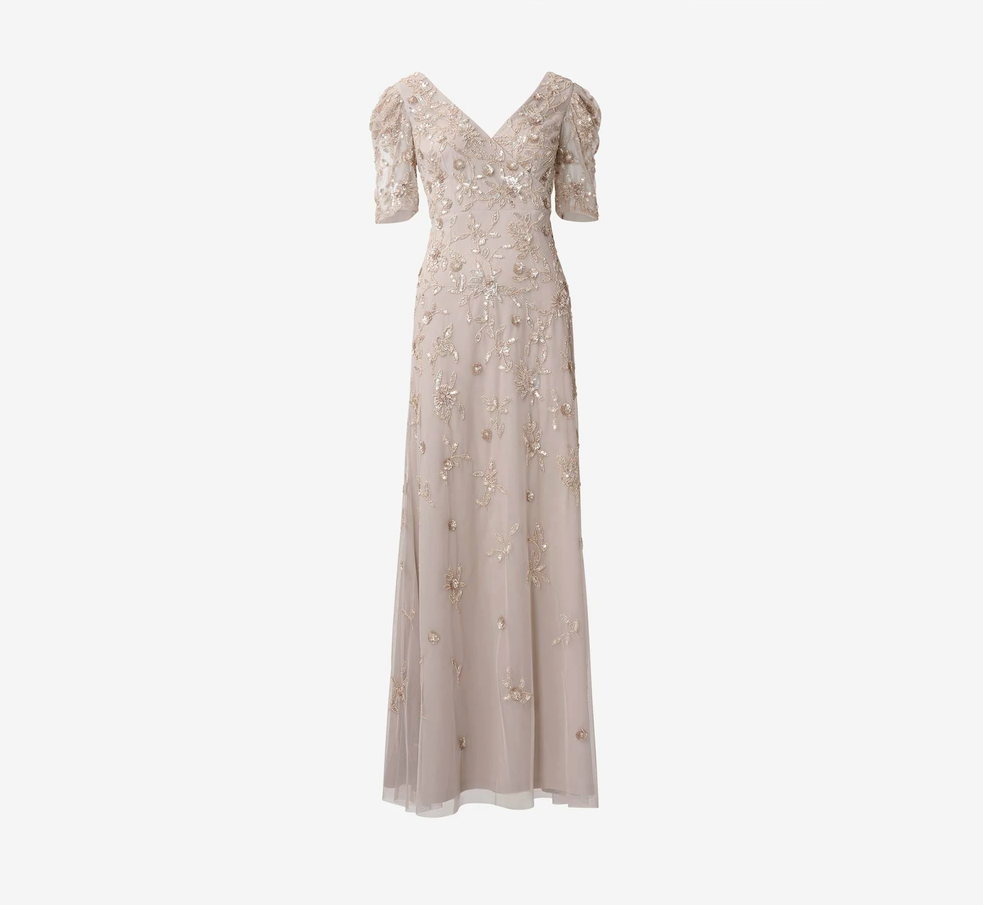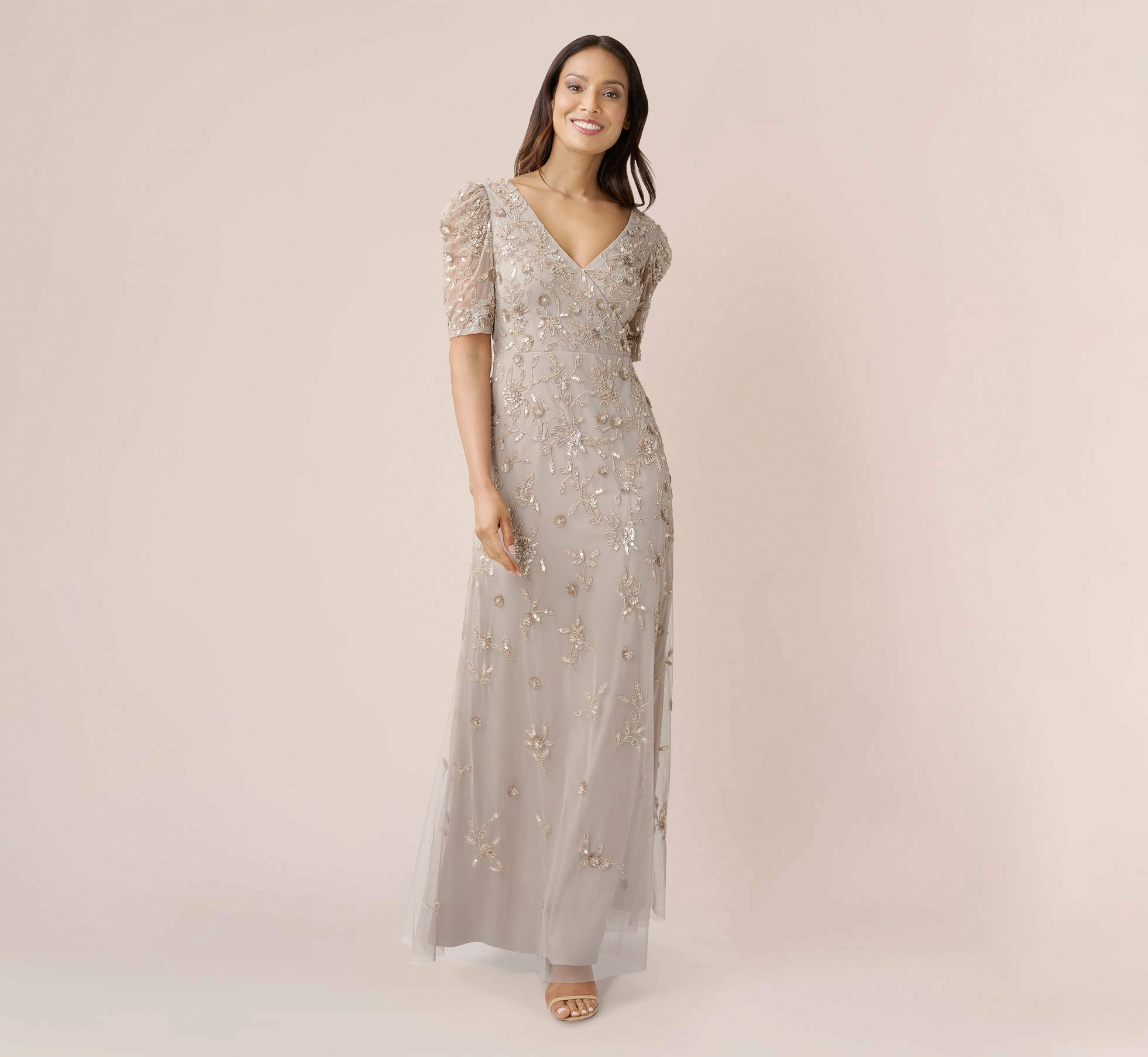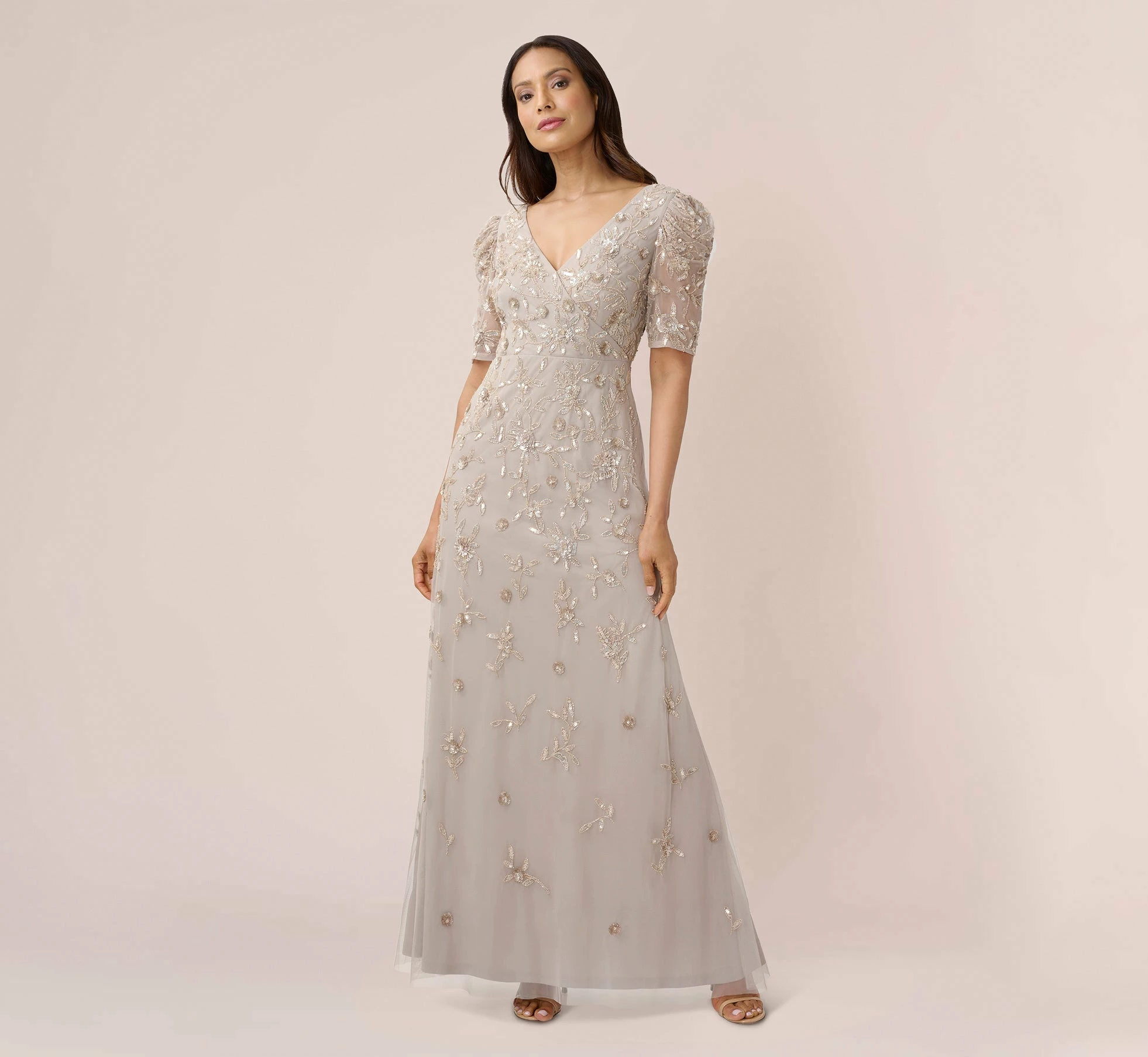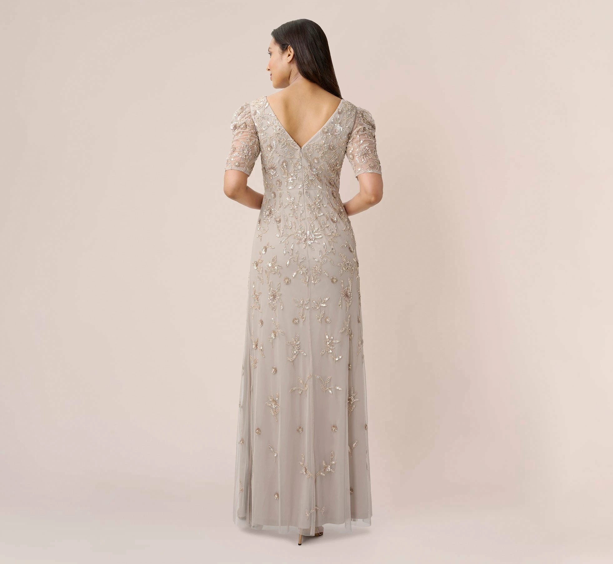 Streamlined and chic, a long, flowing gown in a glittering hand-beaded pattern. Details We Love: the sheer elbow sleeves and flattering v-neckline.