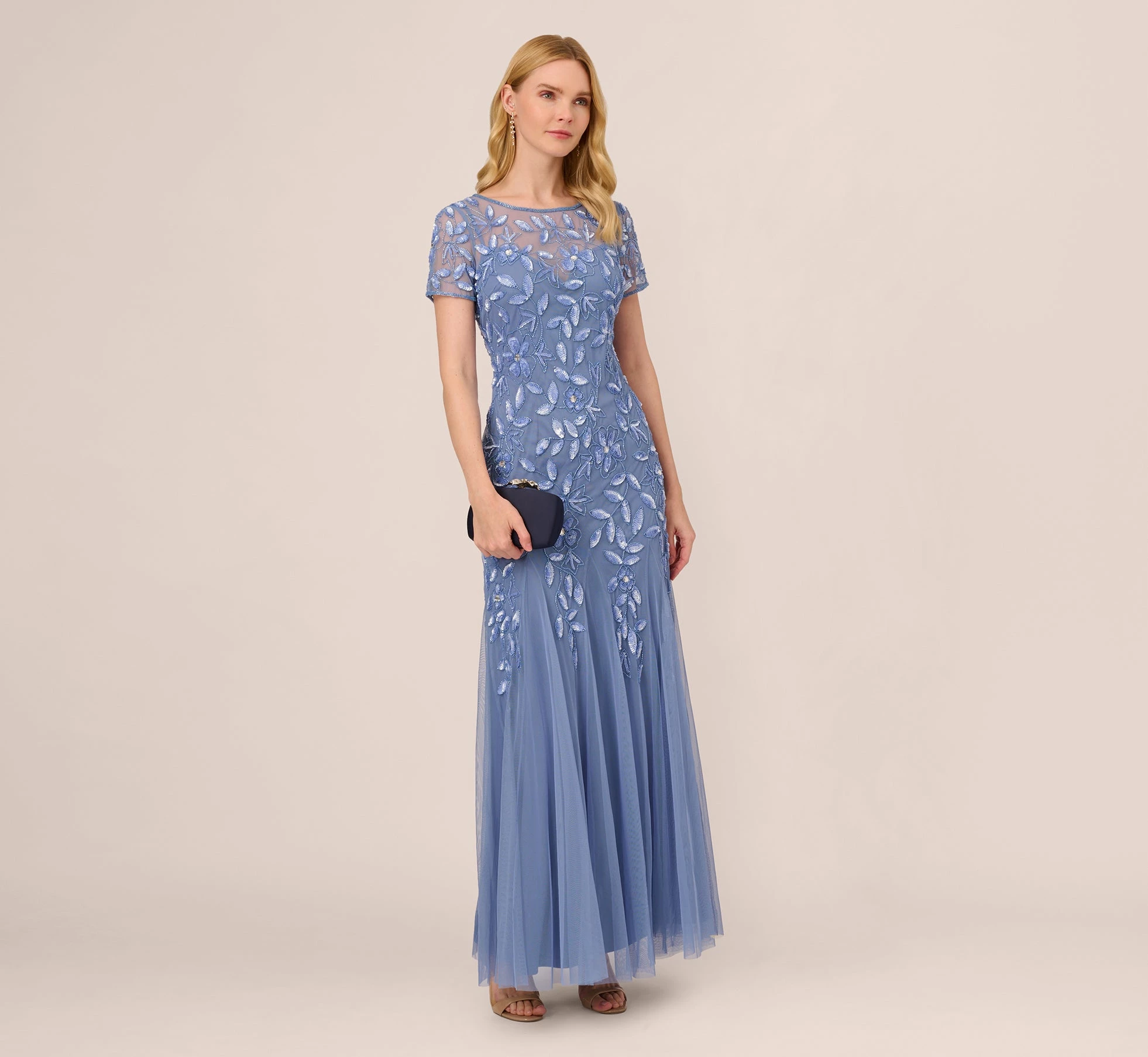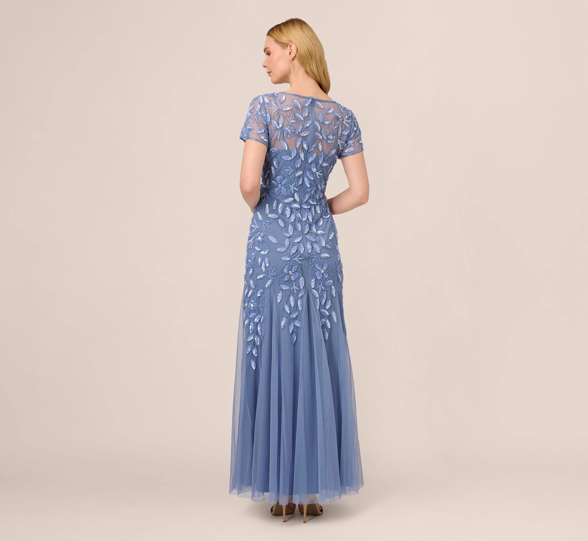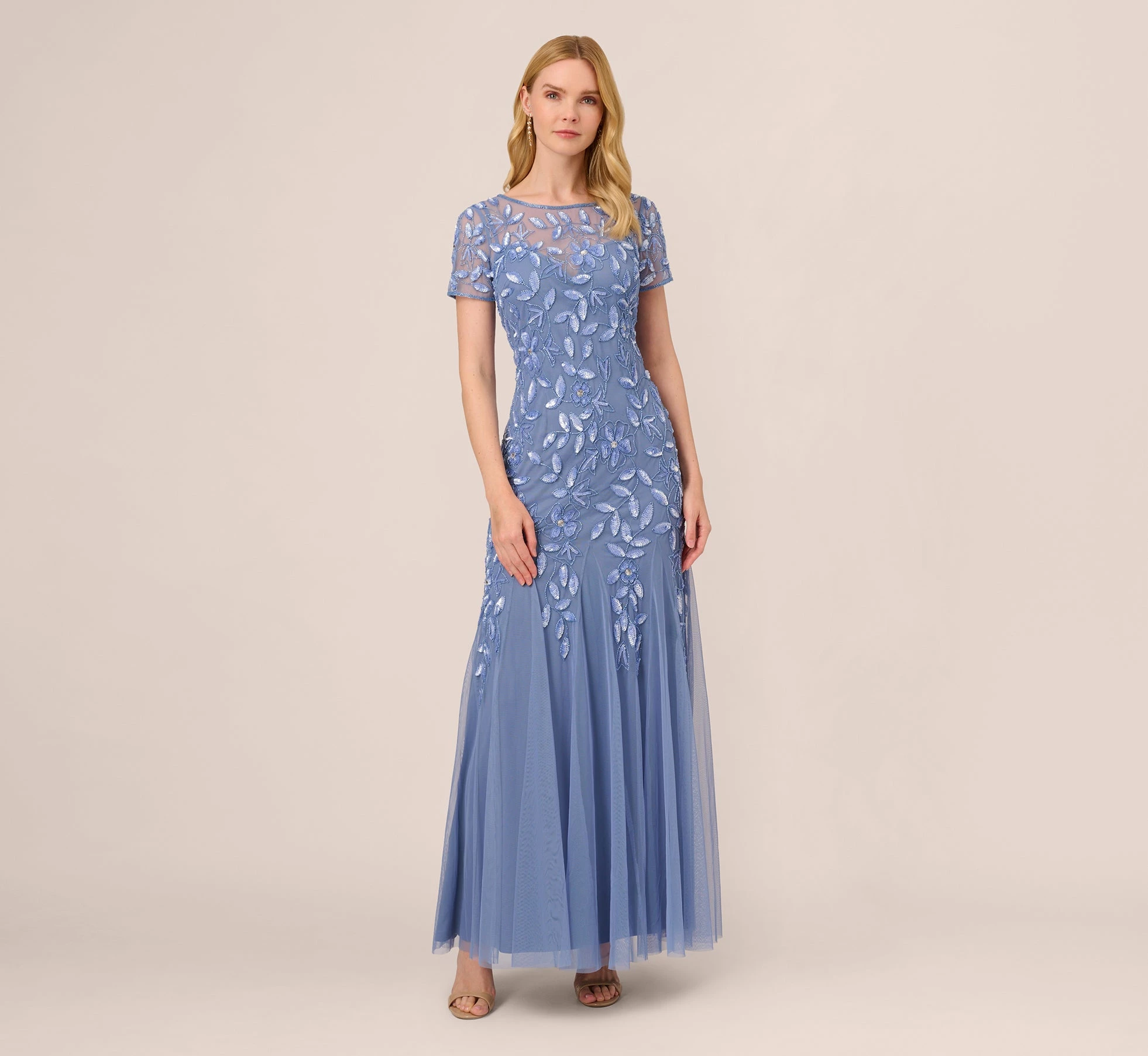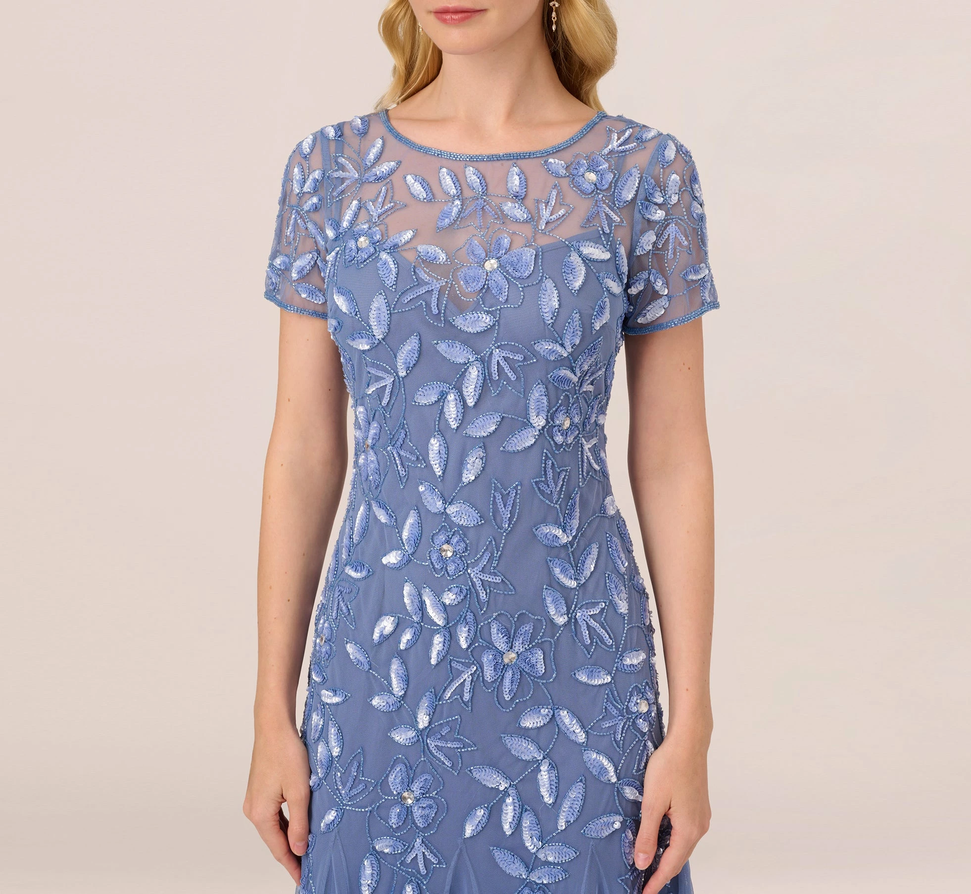 Adrianna Papell Hand Beaded Short Sleeve Floral Godet Gown In French Blue