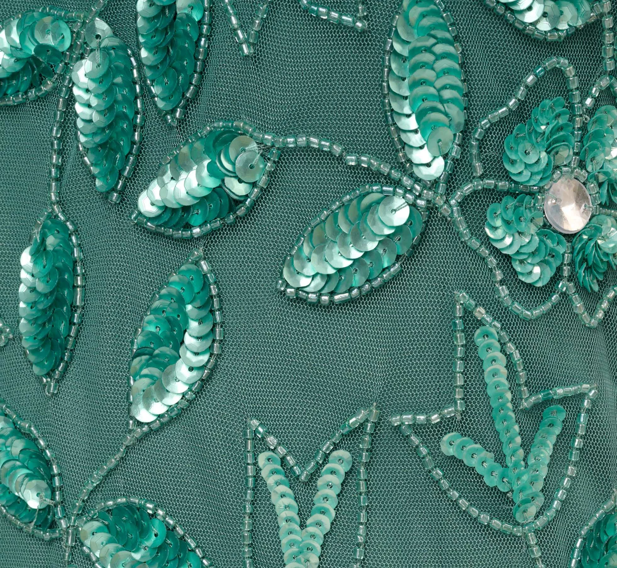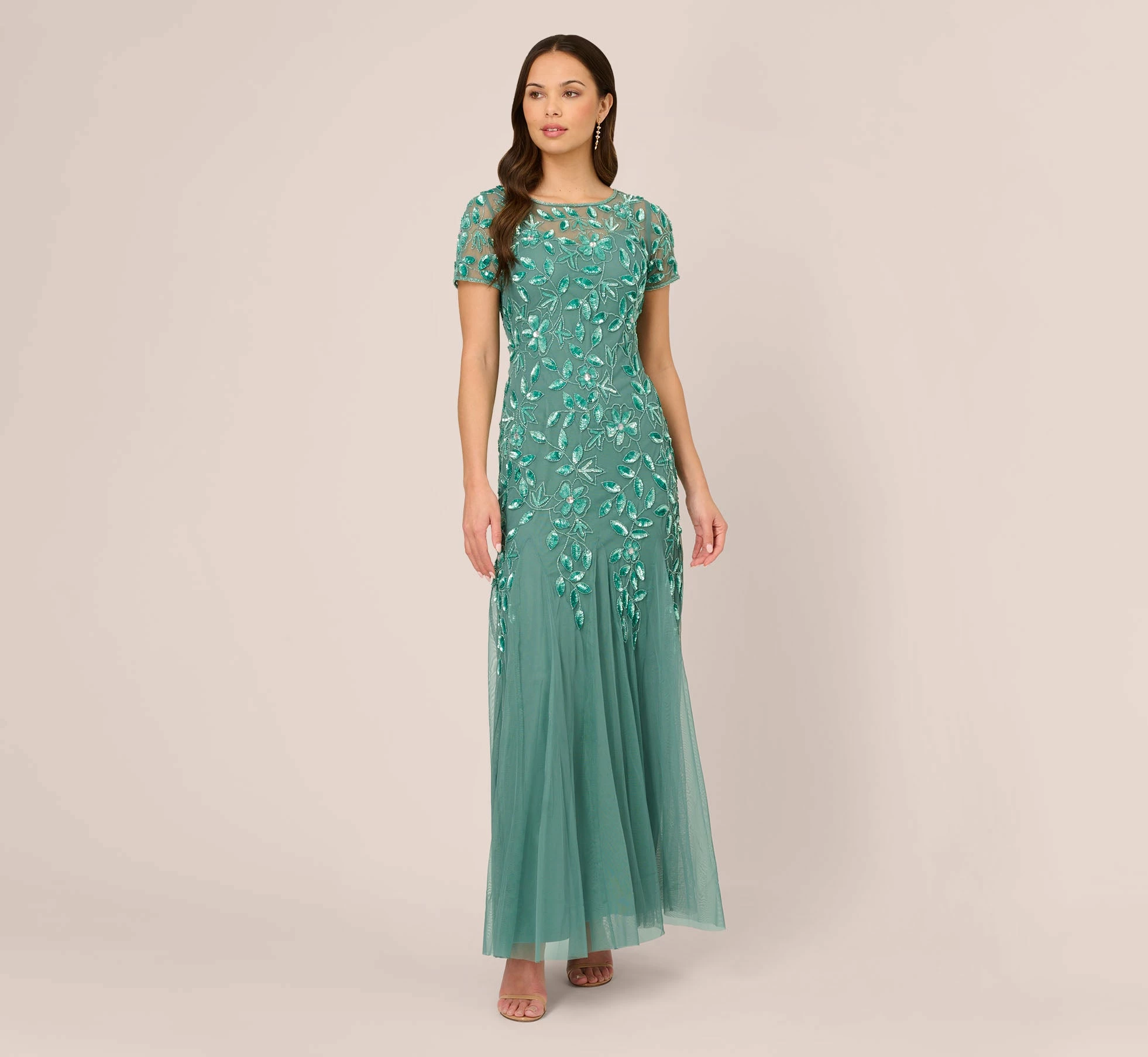 A work of art: our long and romantic gown dazzles with allover handsewn beading in a feminine floral pattern that catches the light with every twirl. A streamlined silhouette is eased with the mermaid skirt with godets to create the right amount of movement. All the details: our iconic (and flattering) no waist seam, sheer illusion yoke and cap sleeves. Sleek back zip closure.