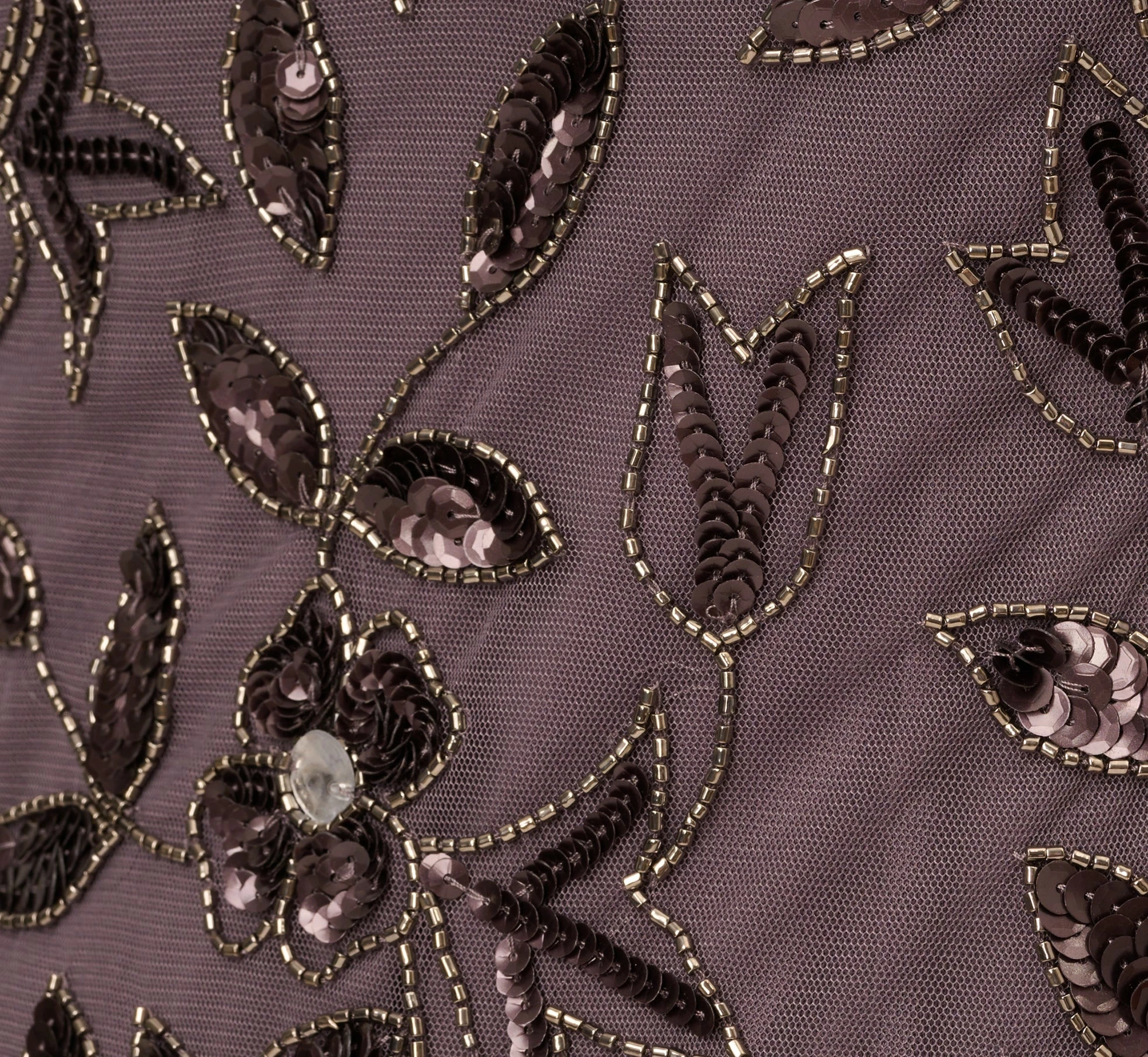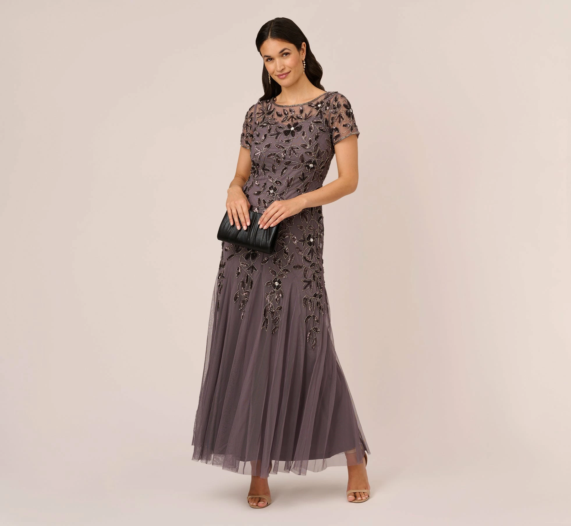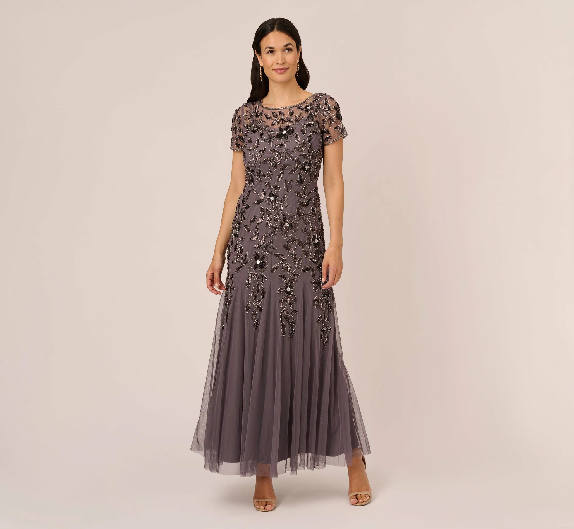 A work of art: our long and romantic gown dazzles with allover handsewn beading in a feminine floral pattern that catches the light with every twirl. A streamlined silhouette is eased with the mermaid skirt with godets to create the right amount of movement. All the details: our iconic (and flattering) no waist seam, sheer illusion yoke and cap sleeves. Sleek back zip closure.