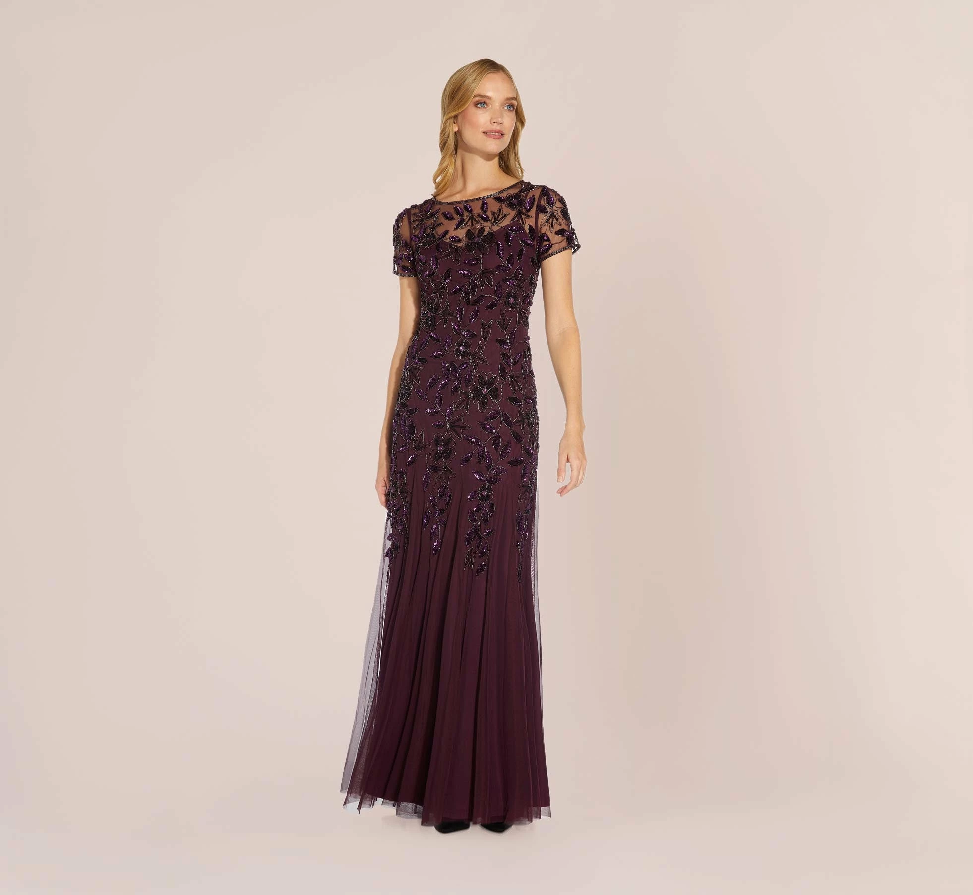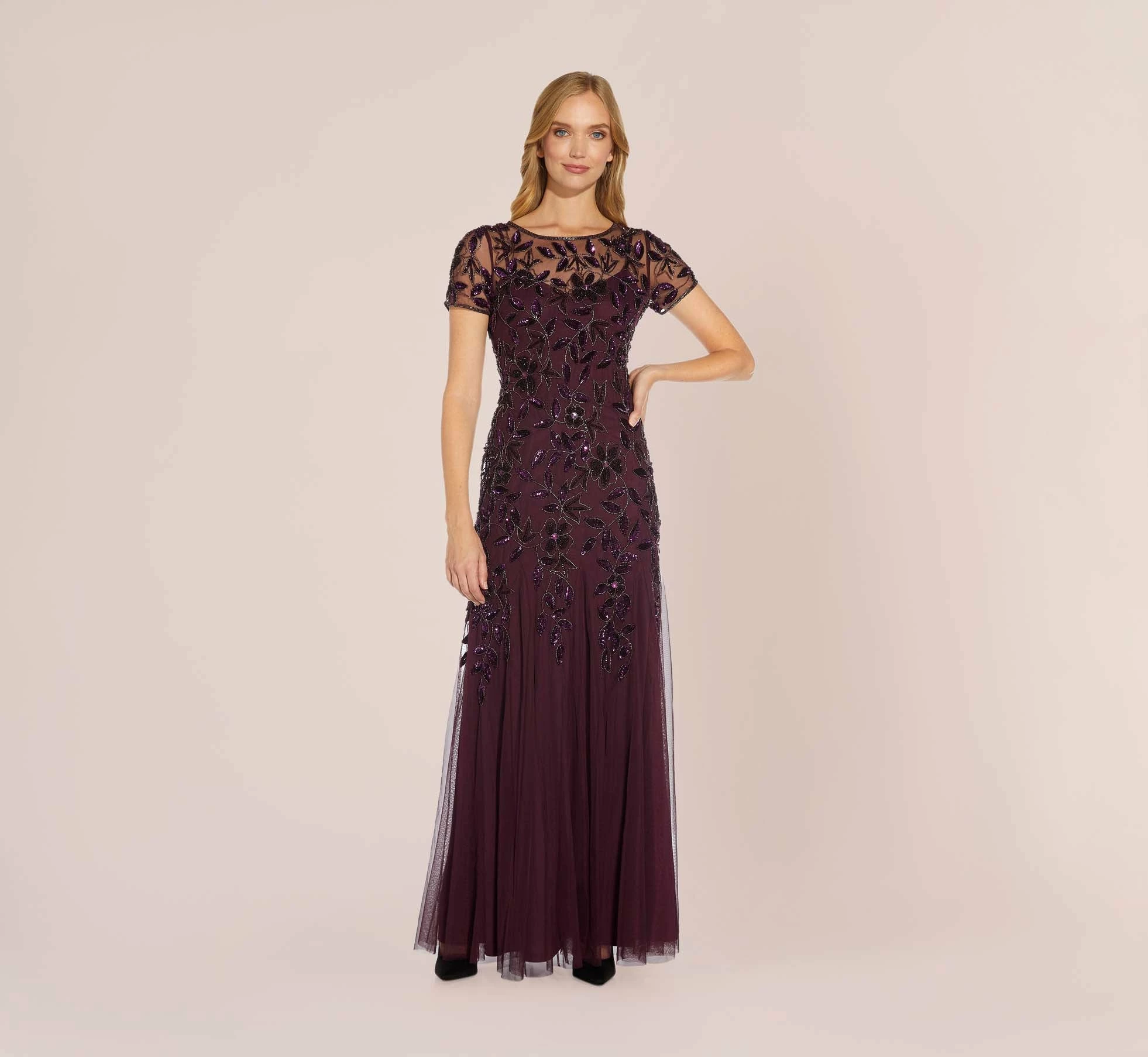 A work of art: our long and romantic gown dazzles with allover handsewn beading in a feminine floral pattern that catches the light with every twirl. A streamlined silhouette is eased with the mermaid skirt with godets to create the right amount of movement. All the details: our iconic (and flattering) no waist seam, sheer illusion yoke and cap sleeves. Sleek back zip closure.